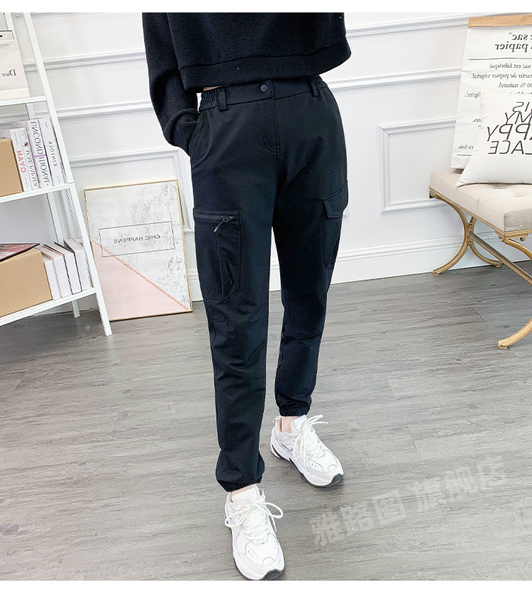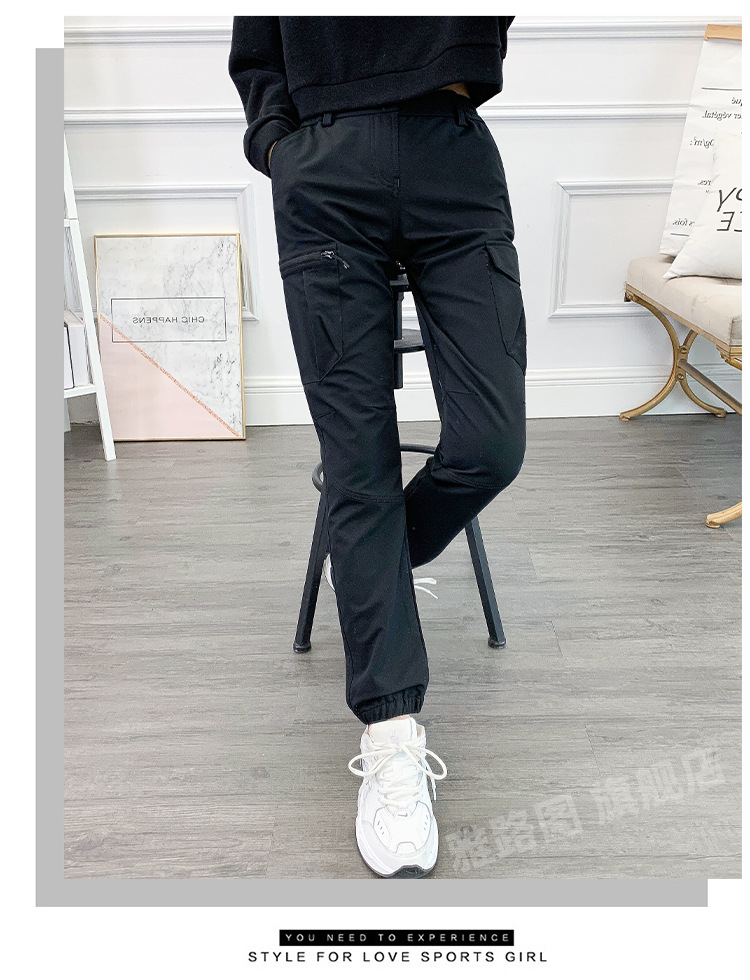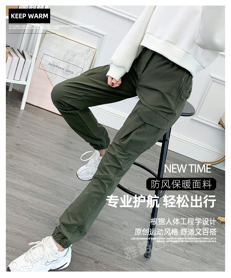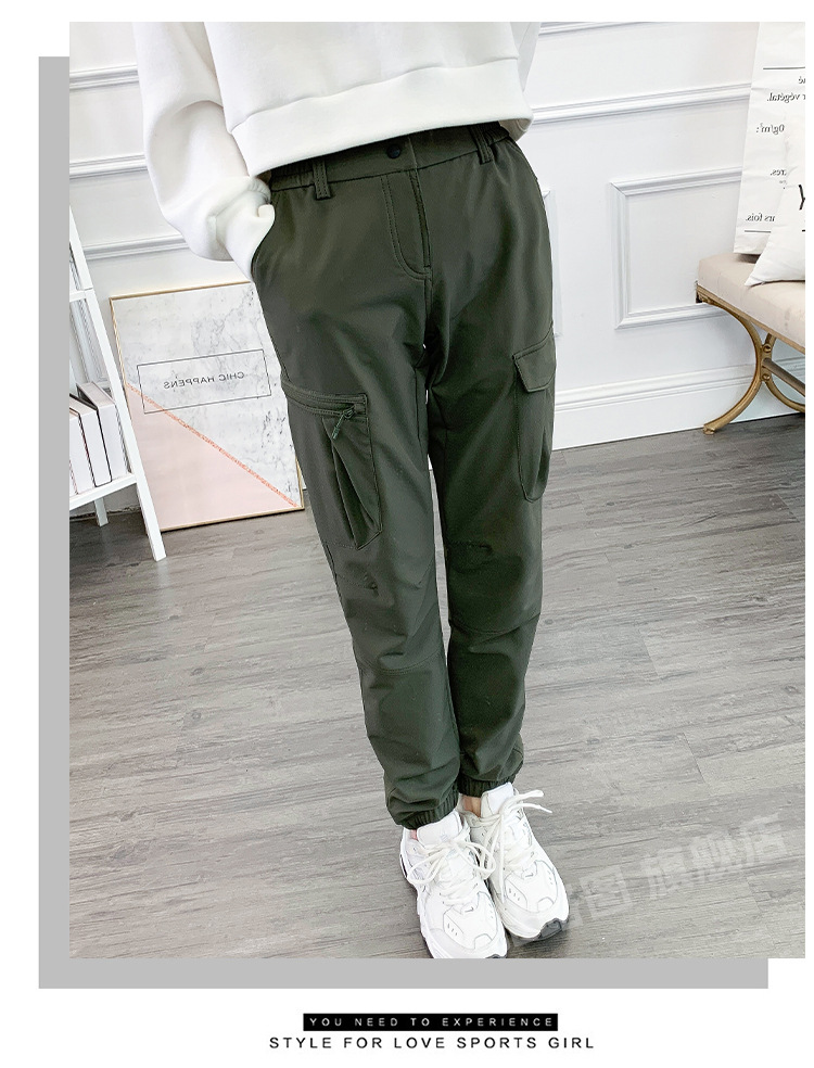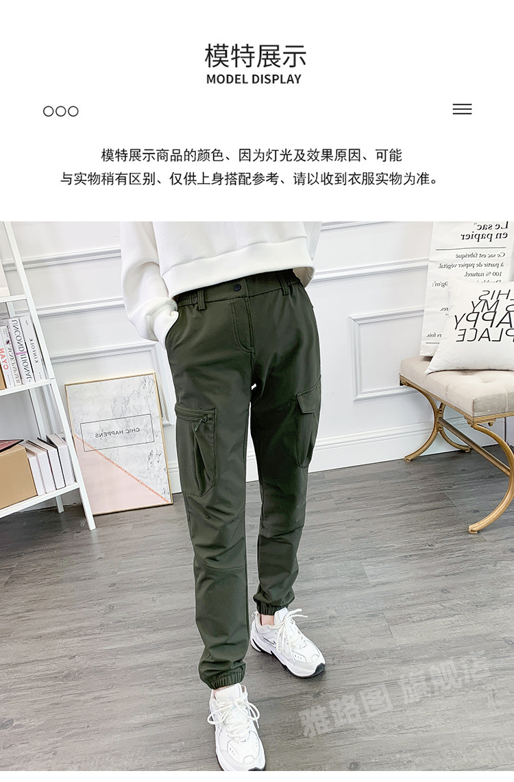Overall multi tas diikat di pergelangan kaki wanita, celana cangkang lembut celana panjang perempuan bersirkulasi hangat tahan angin mendaki gunung musim gugur dan musim dingin