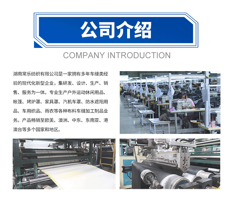 湖南常乐纺织品有限公司是一家拥有多年车缝类经验的现代化新型企业,专业生产户外运动休閒用品、帐篷、烤炉罩、户外家具罩、汽机车罩、收纳袋收纳包、防水遮阳用品、车用织品、雨衣等各种布料车缝加工制品业务,拥有完整、科学的质量管理体系。产品畅销至欧美、澳洲、中东、东南亚、港澳台等多个国家和地区,也服务国外电子商务平台,为平台客户长期库存供应链为外贸商家提供完整的供货体系。