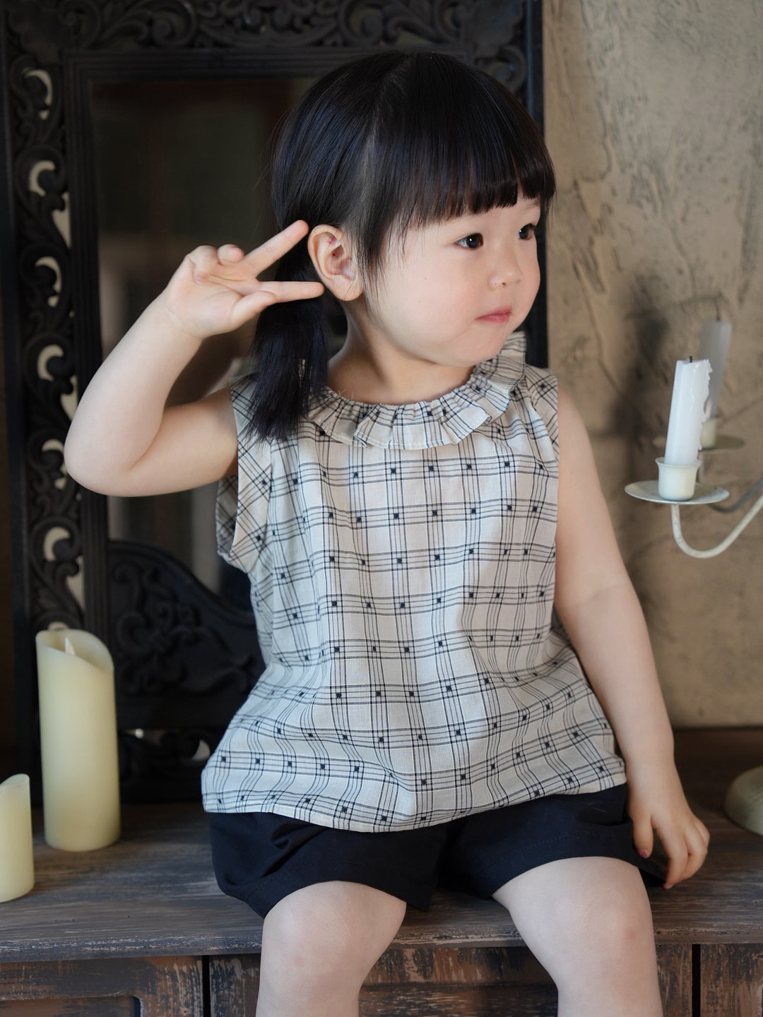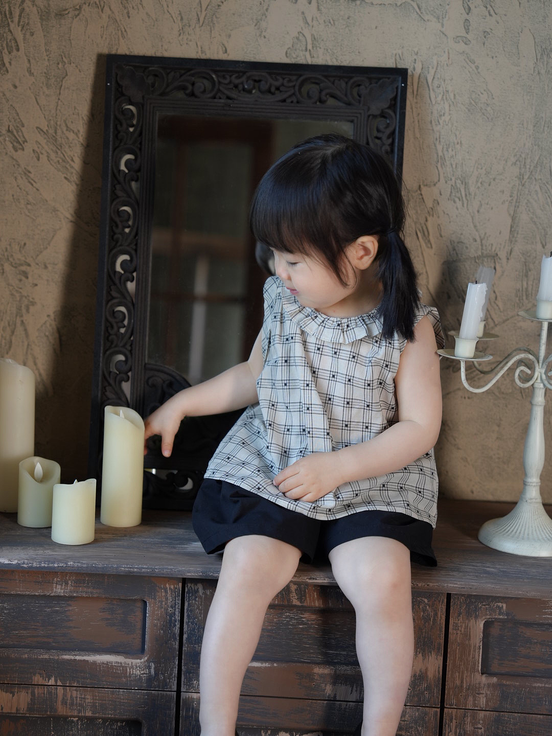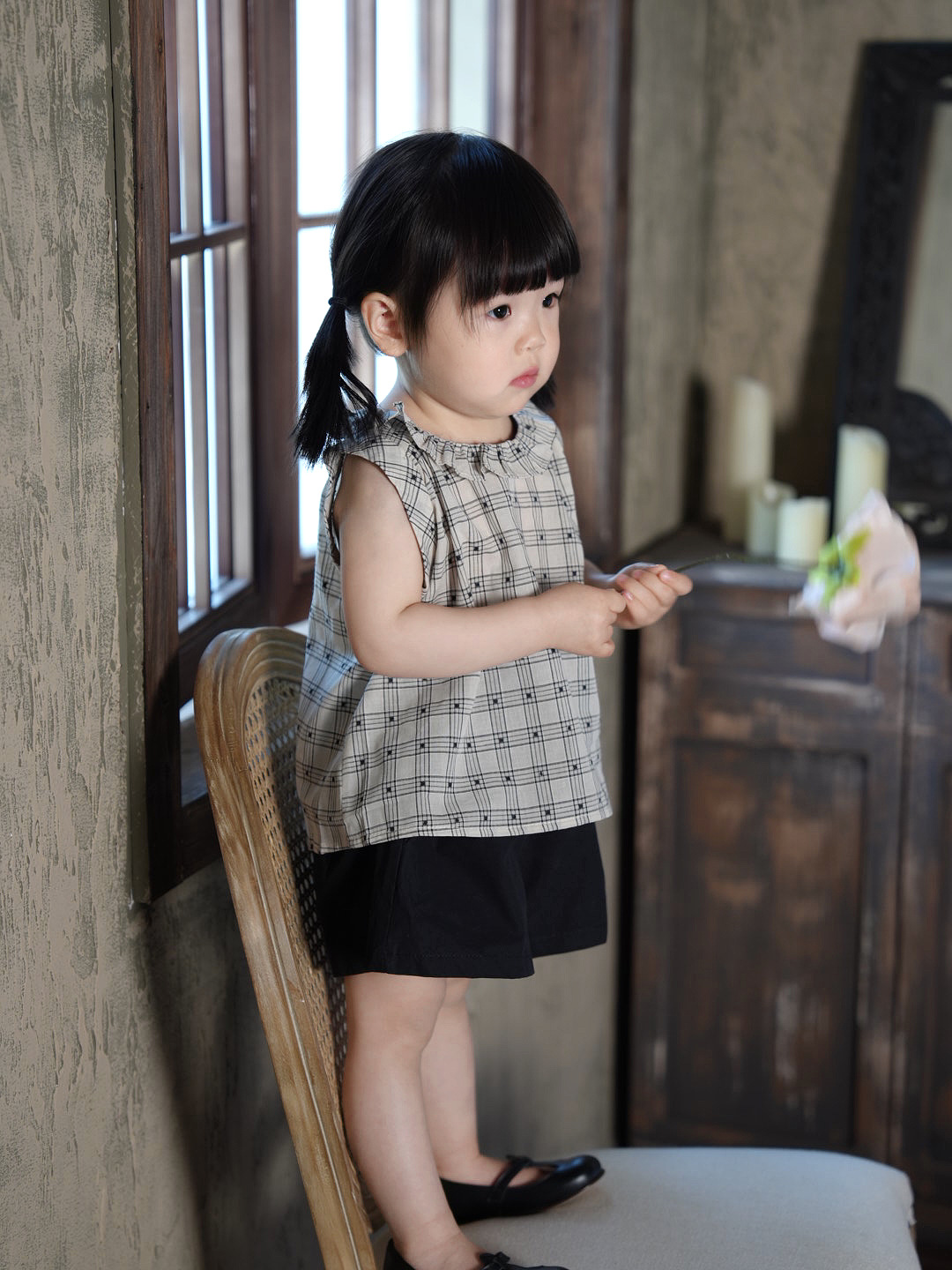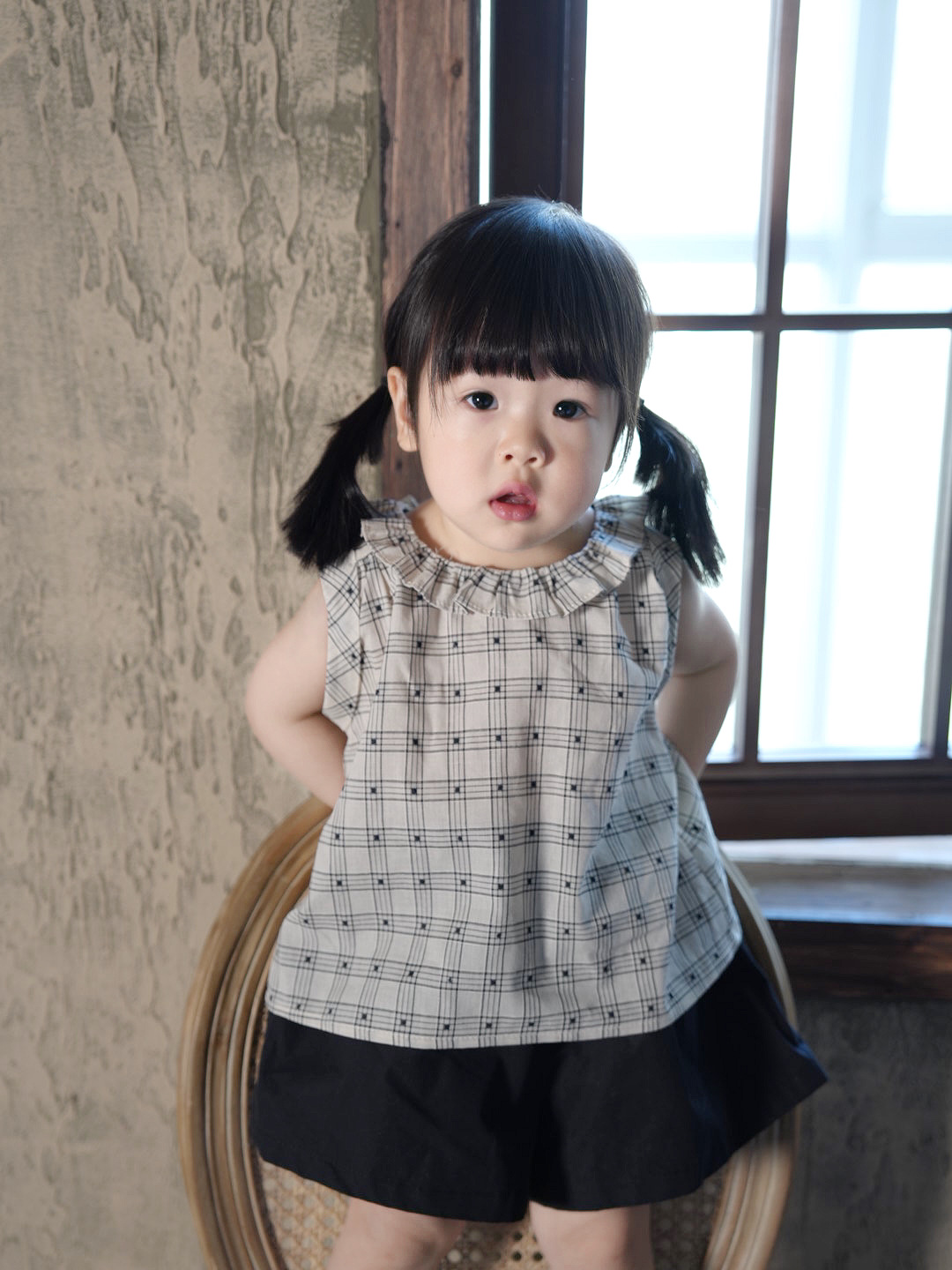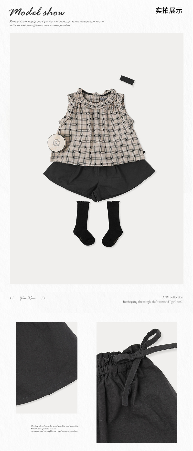 Pakaian anak perempuan bergaya Jepang BENE, model sama, kemeja kotak-kotak tanpa lengan dengan potongan, celana pendek katun dicuci, menyerap keringat