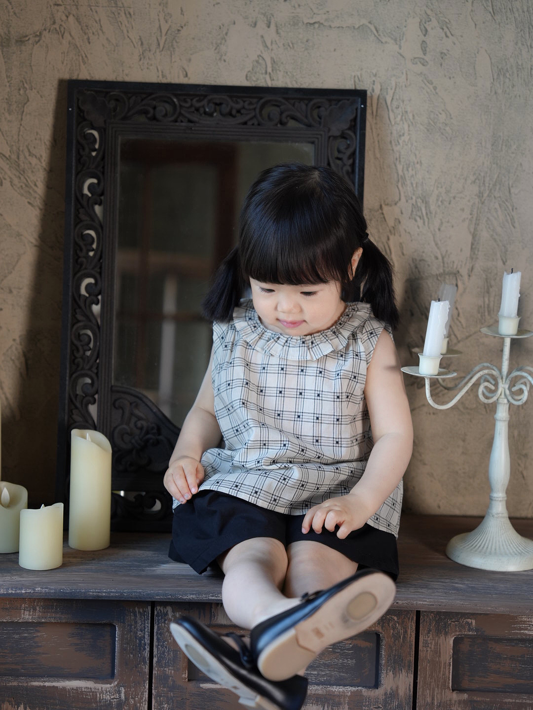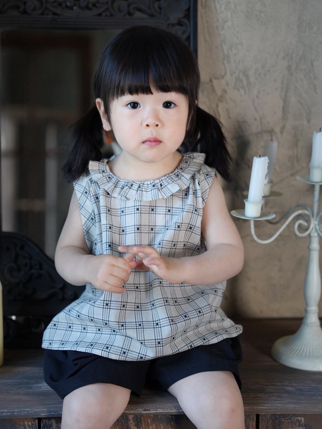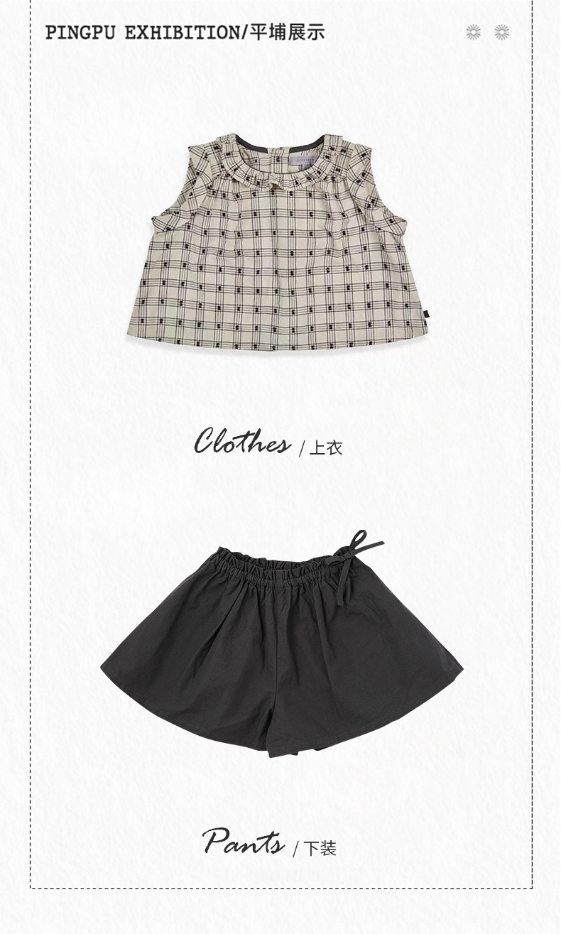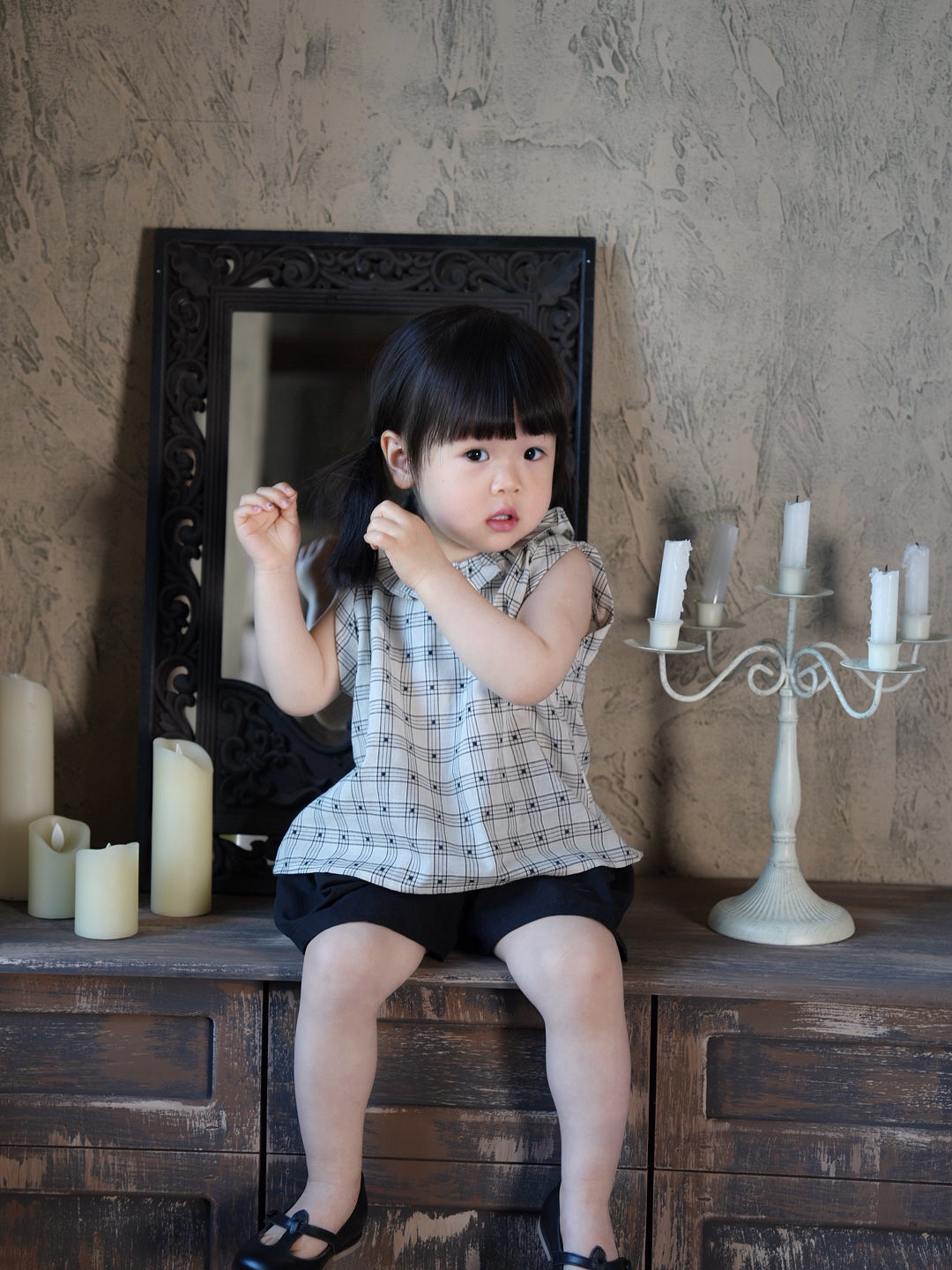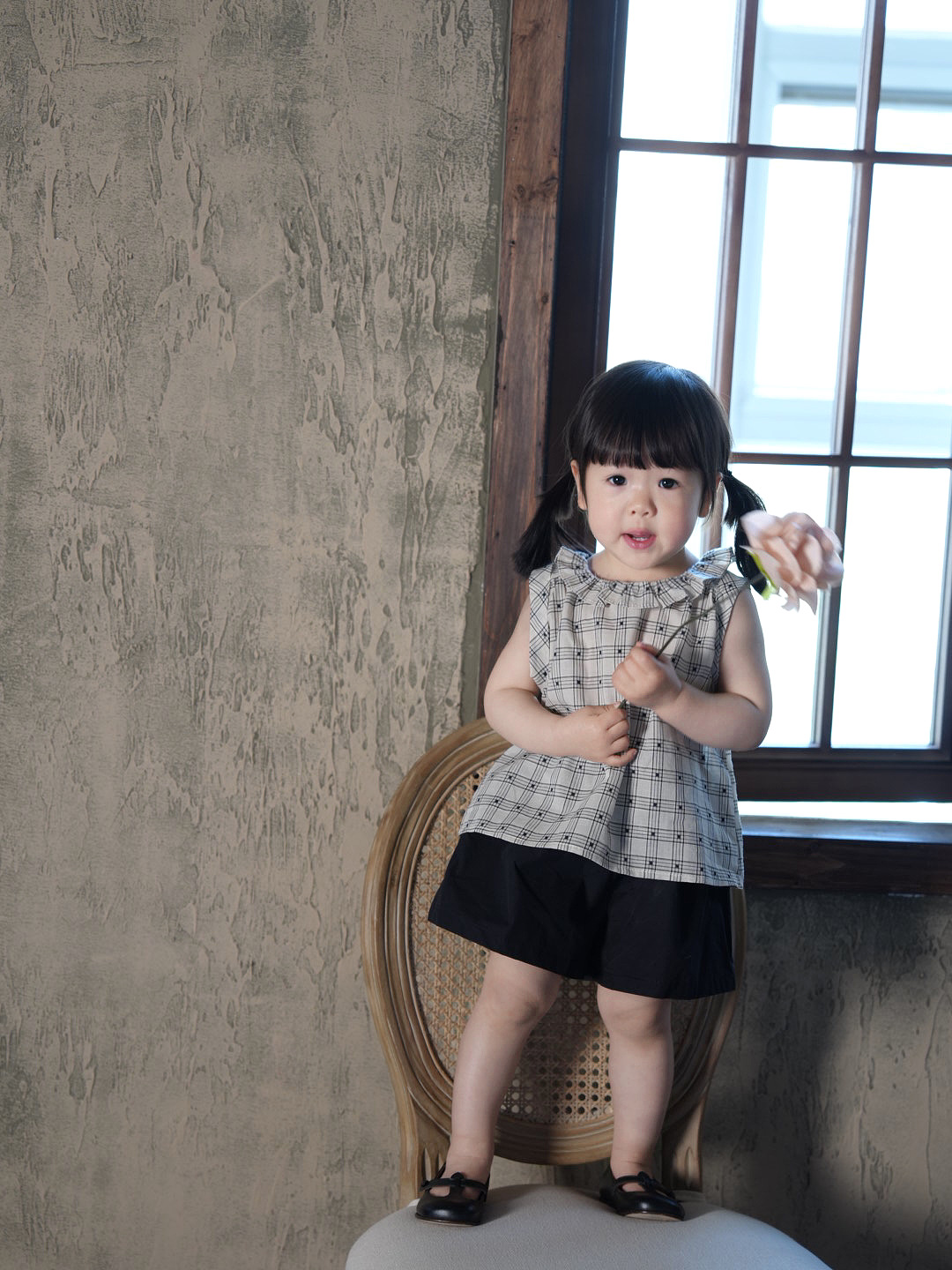 Pakaian anak perempuan bergaya Jepang BENE, model sama, kemeja kotak-kotak tanpa lengan dengan potongan, celana pendek katun dicuci, menyerap keringat