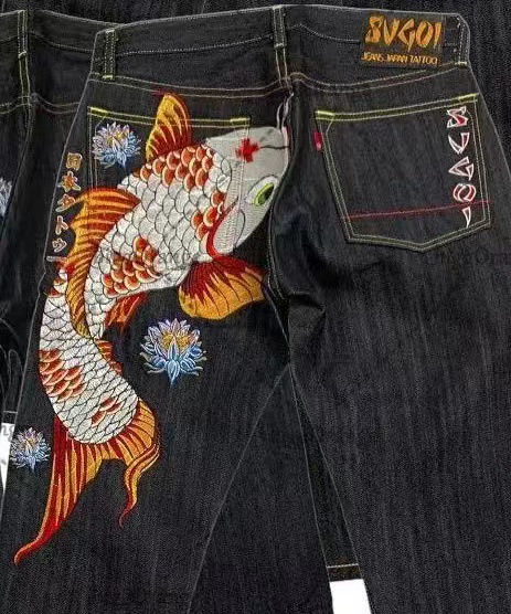 Luoqi soul sukiyo merek fashion gaya Jepang celana jeans lurus longgar bunga sakura bermotif bunga sakura karper