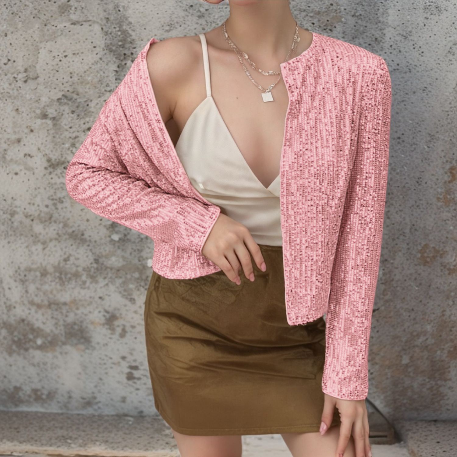 2024秋季欧美亚马逊跨境新款圆领长袖纯色开衫休闲亮片百搭外套女