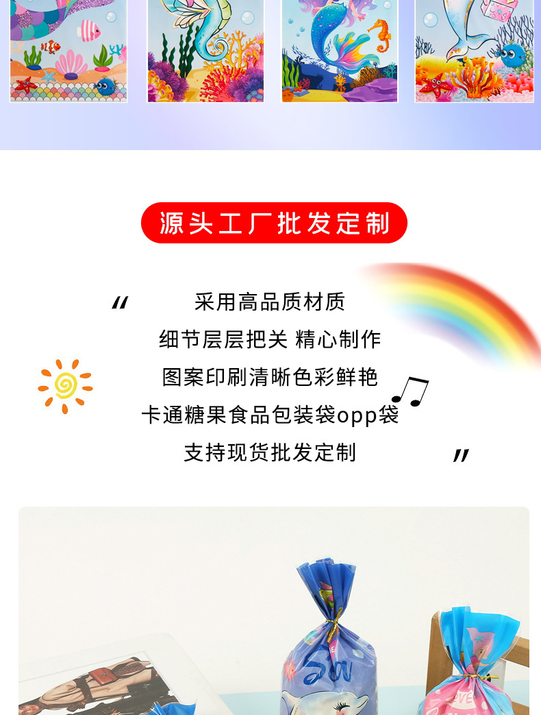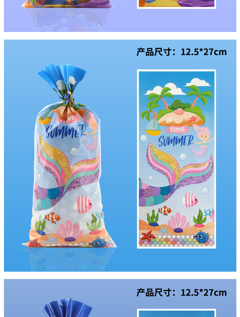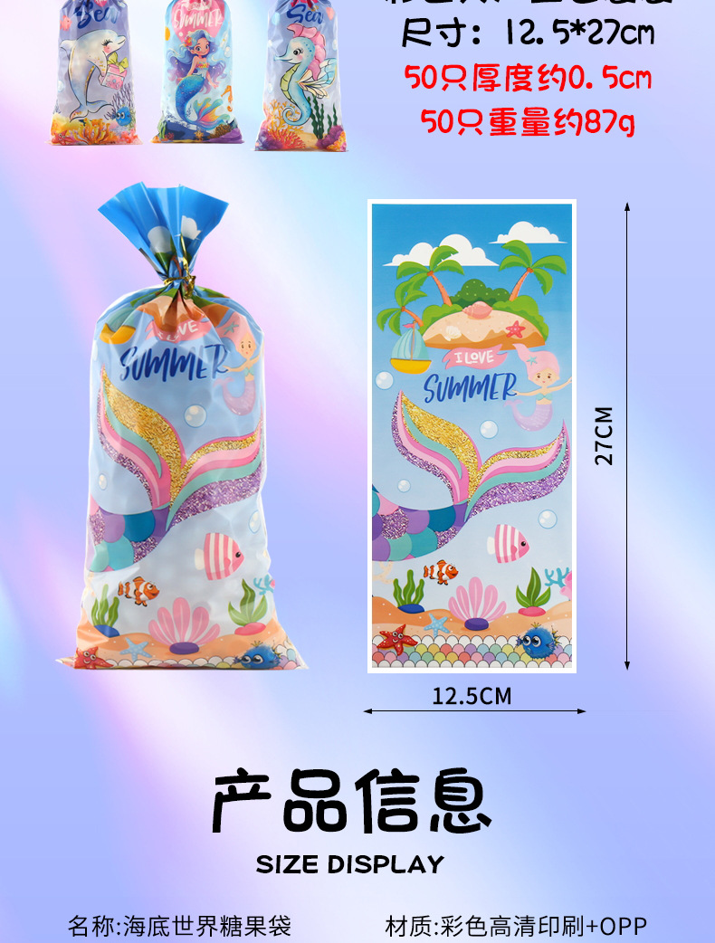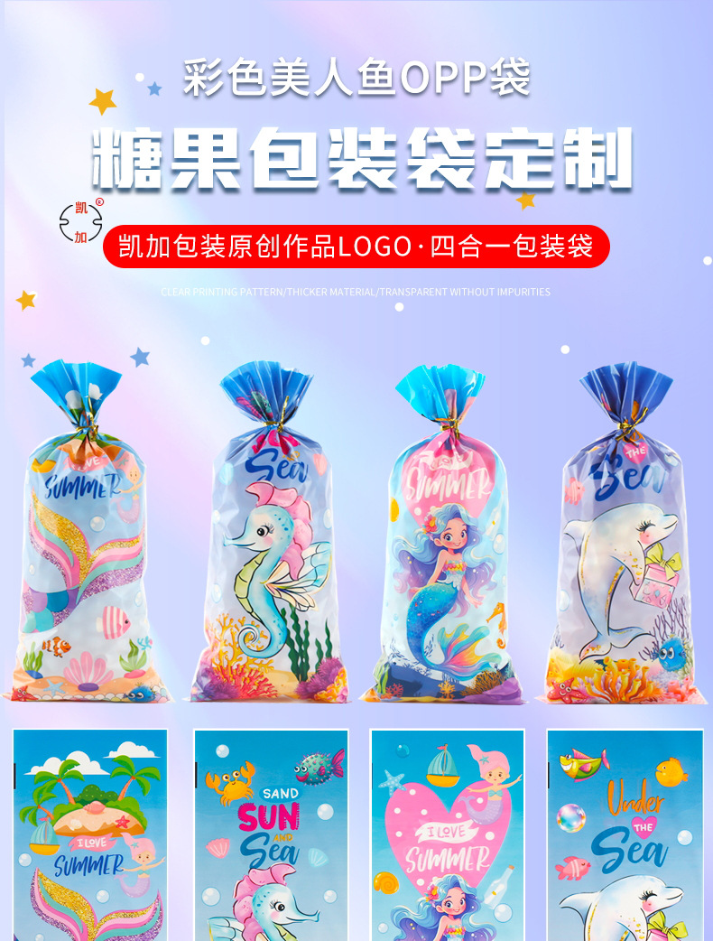 Tas kemasan permen putri duyung asli, tas popcorn, celana saku penutup datar OPP, tas sutra, tas hadiah pesta ulang tahun