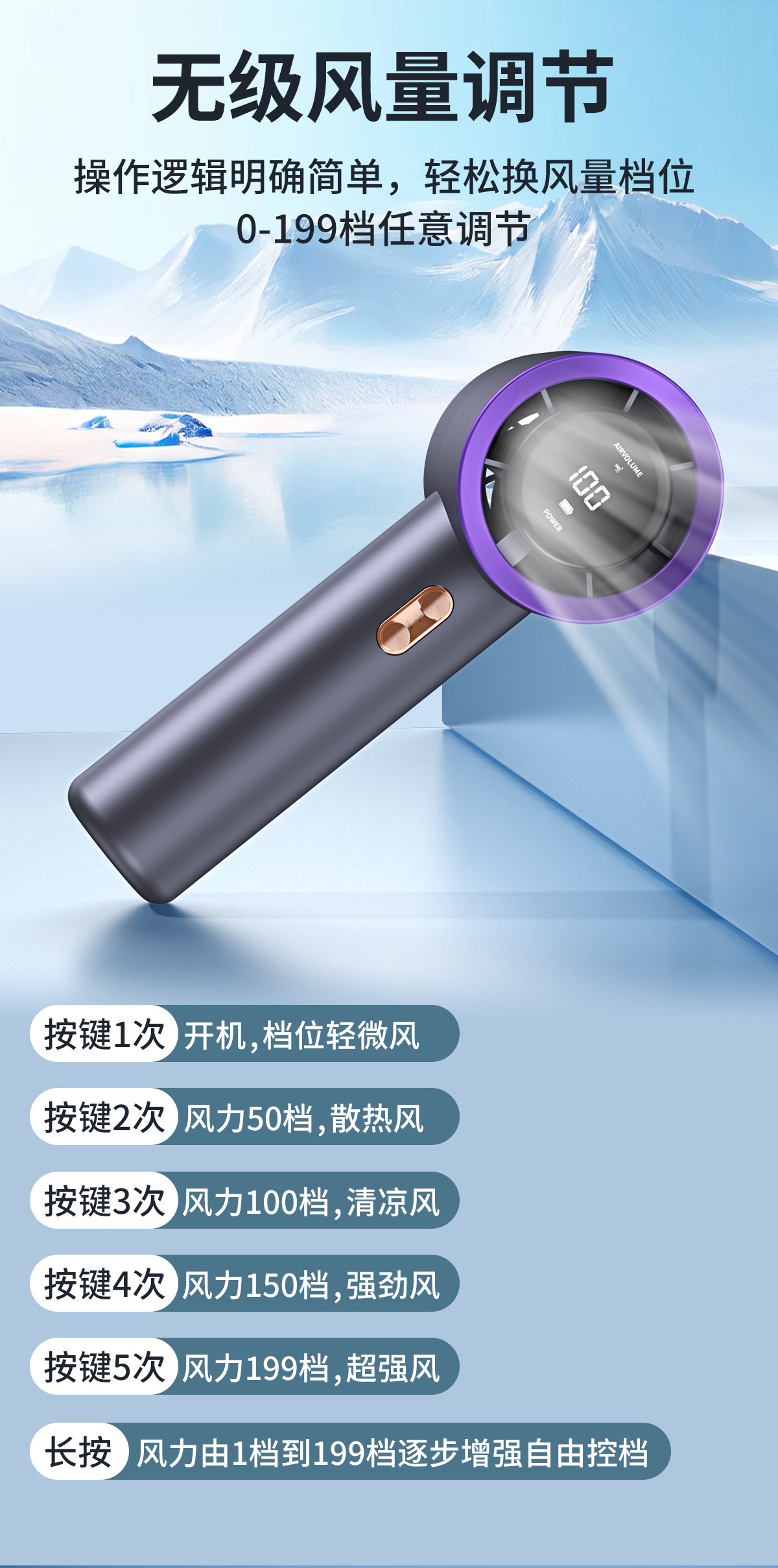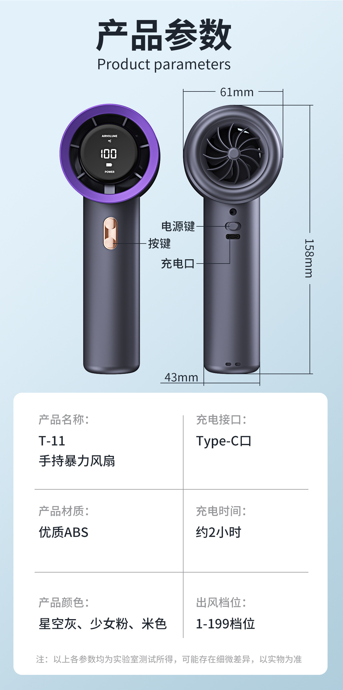 主板:TYPE-C,风扇显示灯,199档风速,输入5V1A,