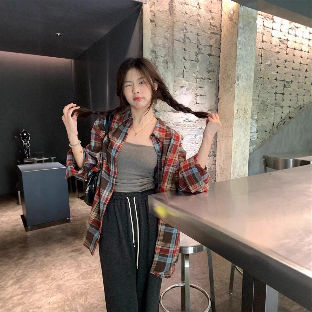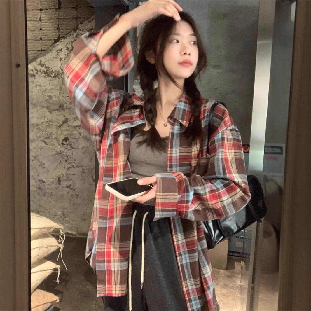 Kemeja Kotak-Kotak Warna Kuning Gaya Amerika Kemeja Dopamin Model Baru Musim Semi Jaket Atasan Pasangan Retro Kasual Longgar