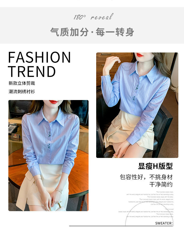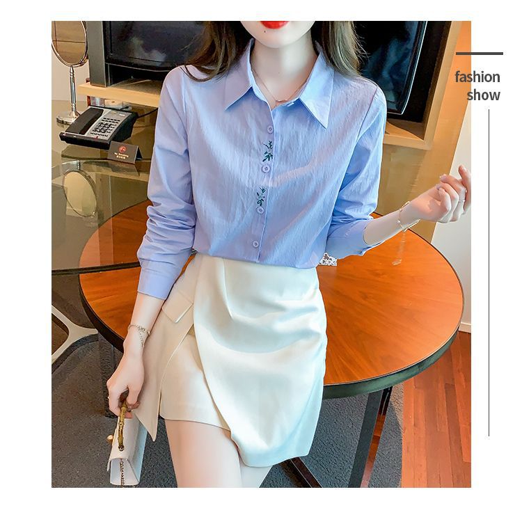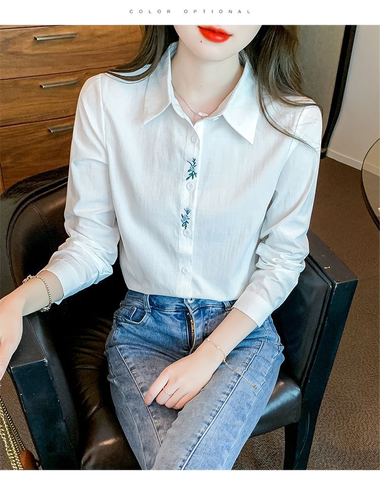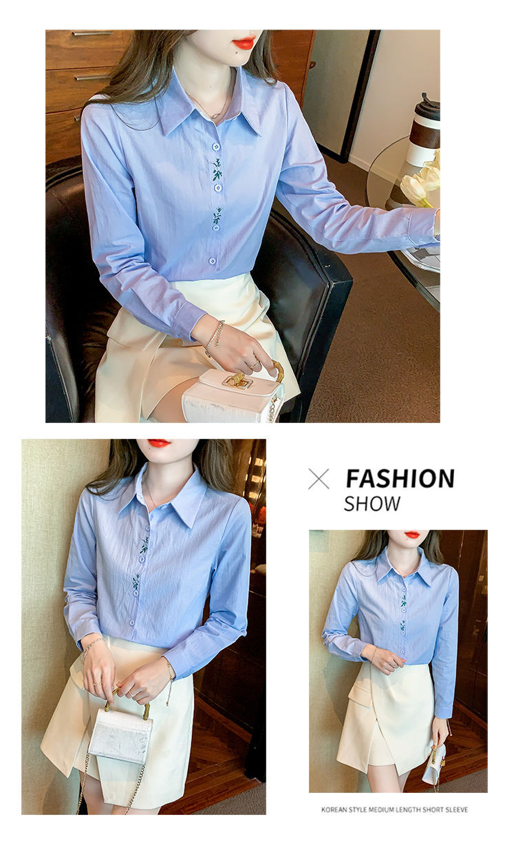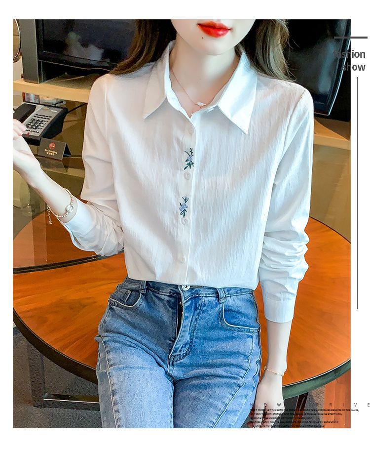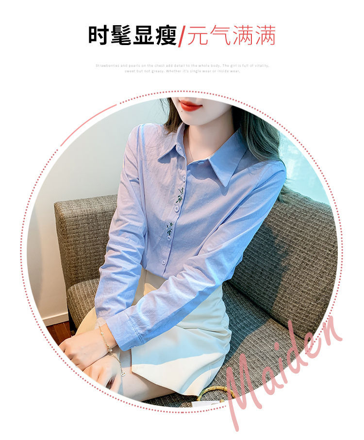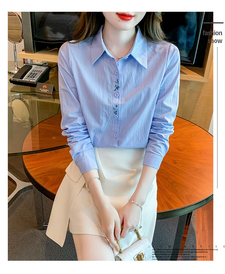 Kemeja katun murni wanita musim semi 2025, model terbaru yang menampilkan kesan awet muda, kemeja profesional bergaya dengan bordir.