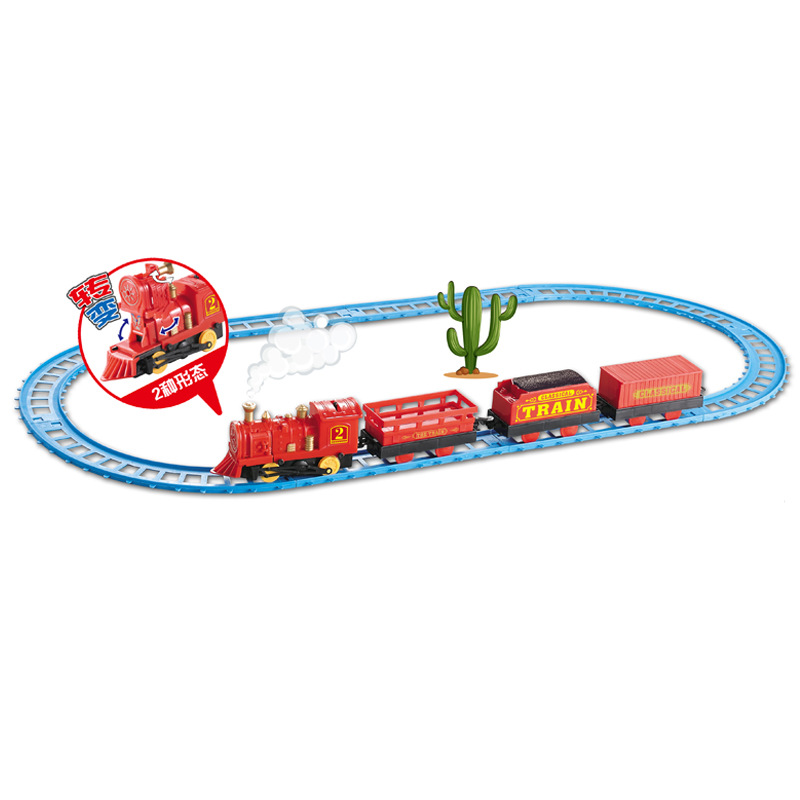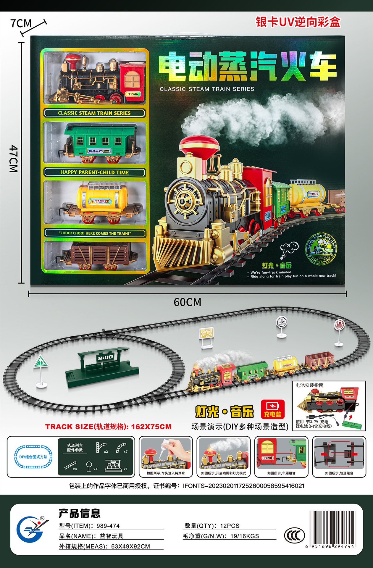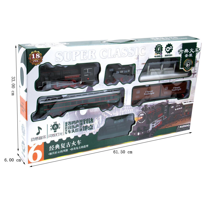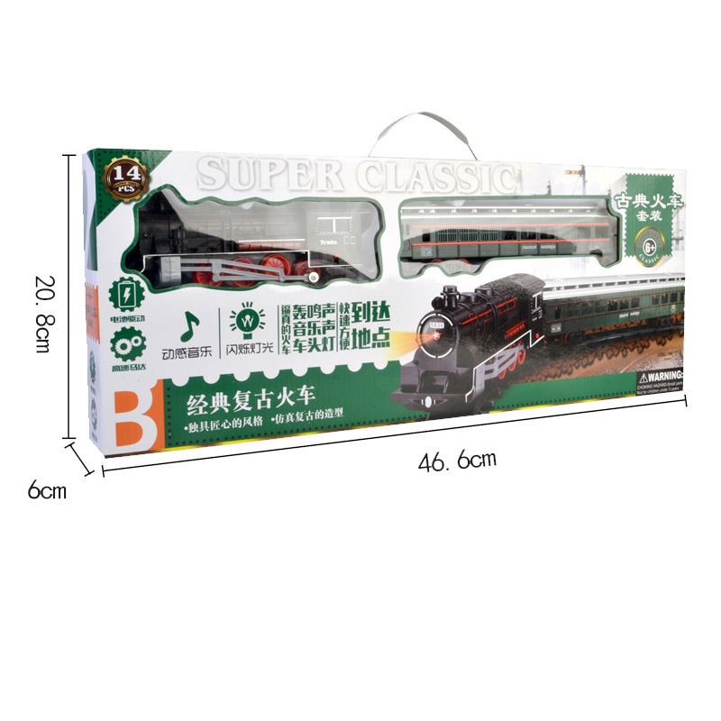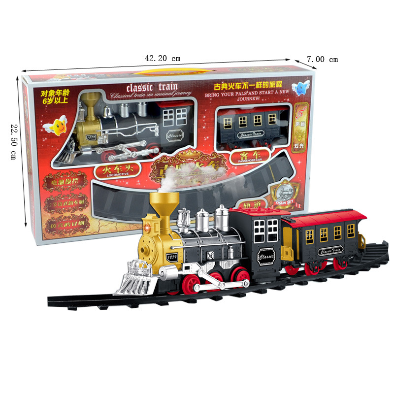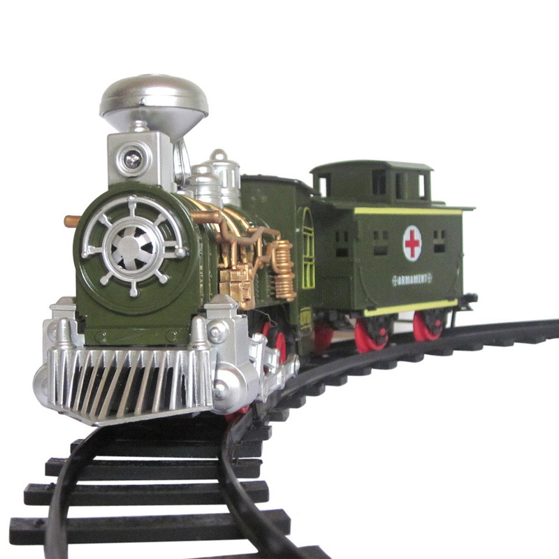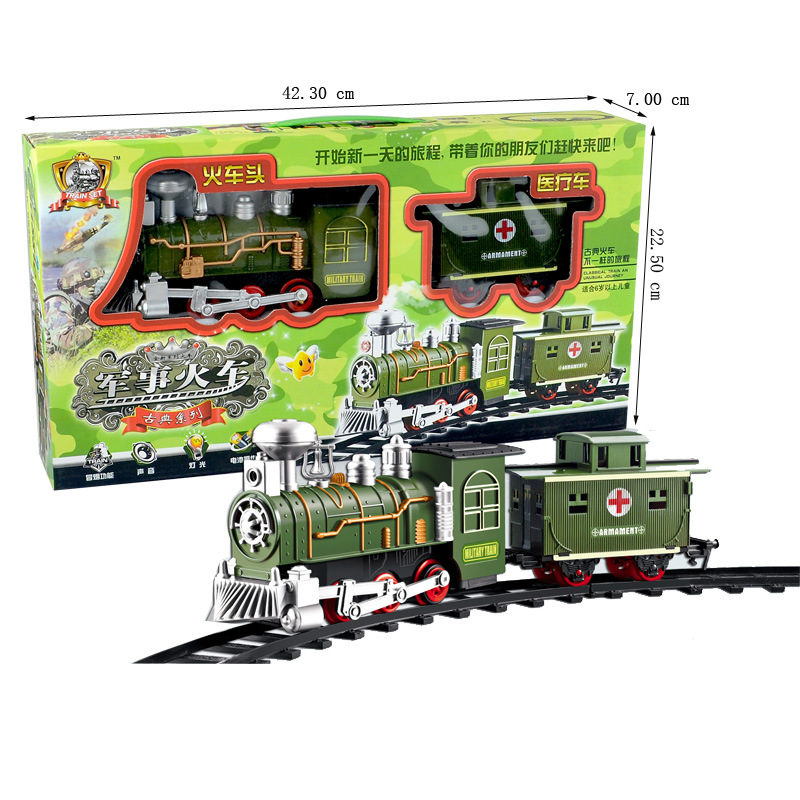 Kereta api mainan klasik Guangyu lintas batas, suara dan cahaya, efek uap, militer, elektrik, rakitan DIY, mainan Natal.