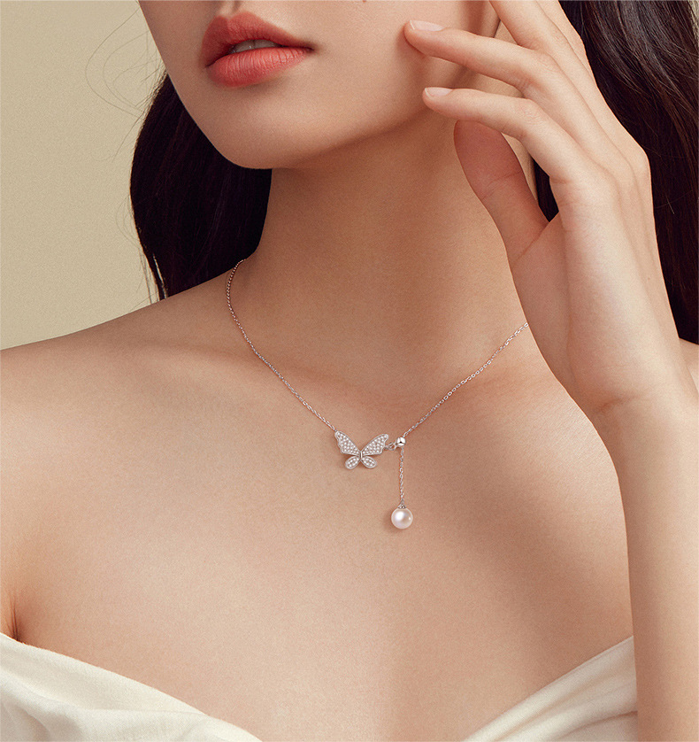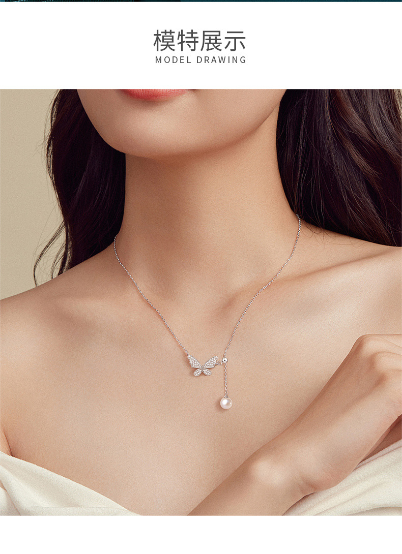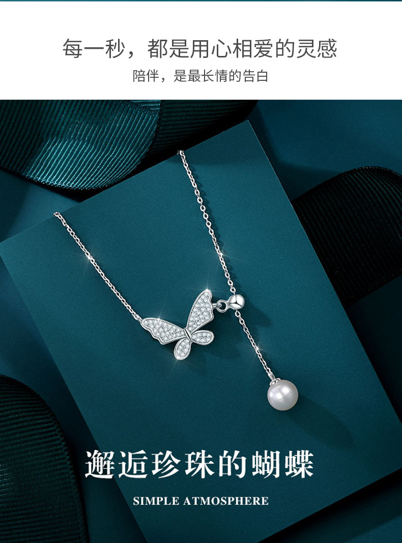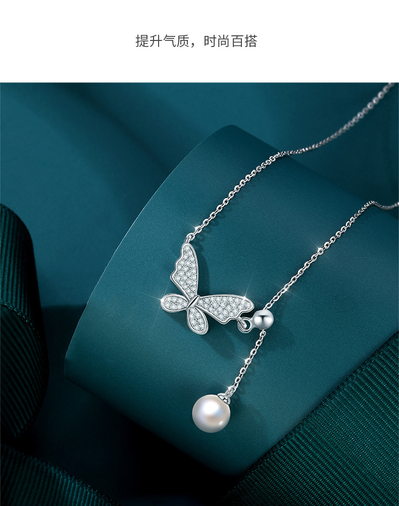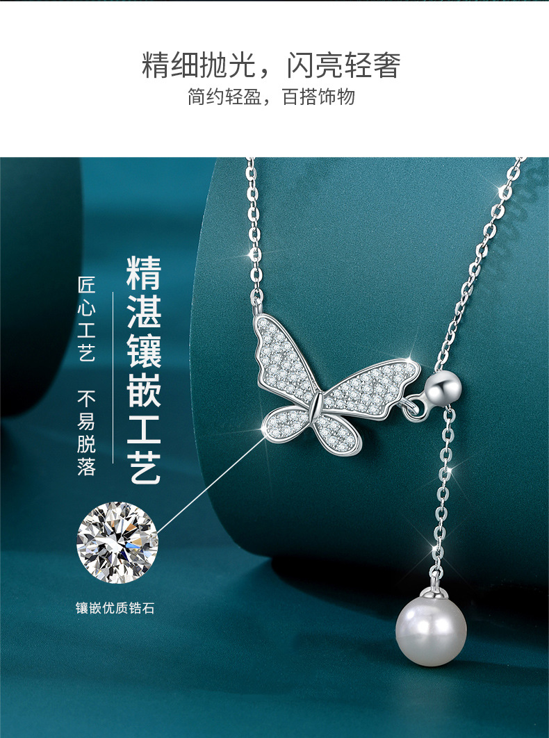 Kalung Kupu-Kupu Berlian Penuh Kalung Wanita Kalung Klavikula Rumbai Mutiara Imitasi Niche Mewah Ringan Kalung Baja Tahan Karat Dapat Disesuaikan Teleskopik