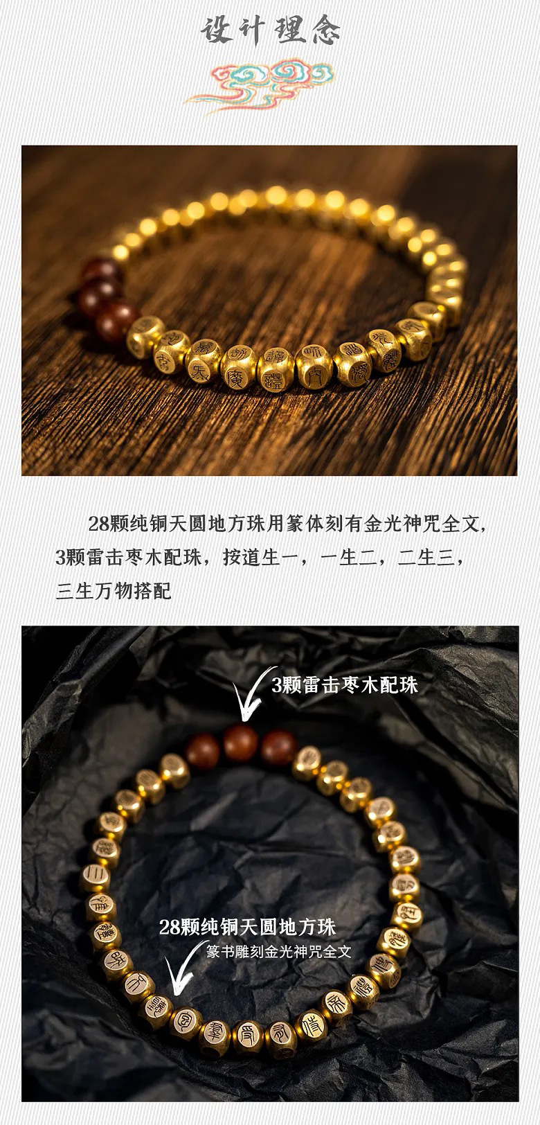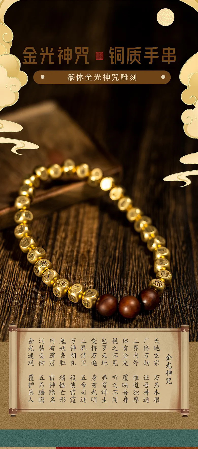 Gelang mantra emas dengan segel tembaga murni asli untuk pria, perhiasan bergaya Tao klasik, hadiah personalisasi modis dan trendi untuk teman.