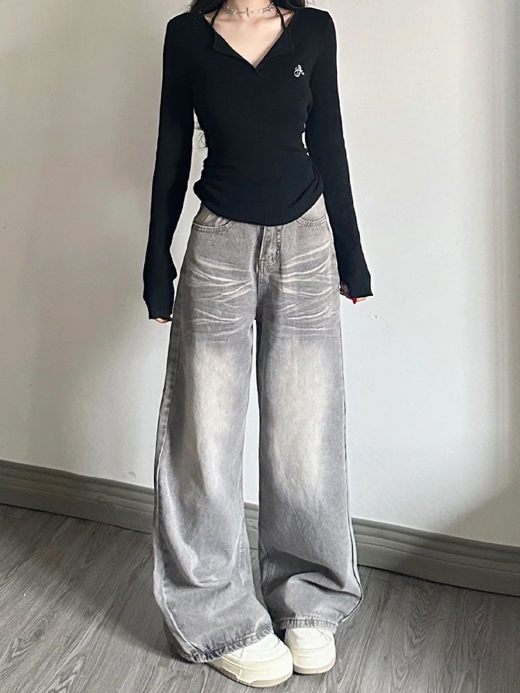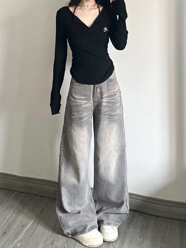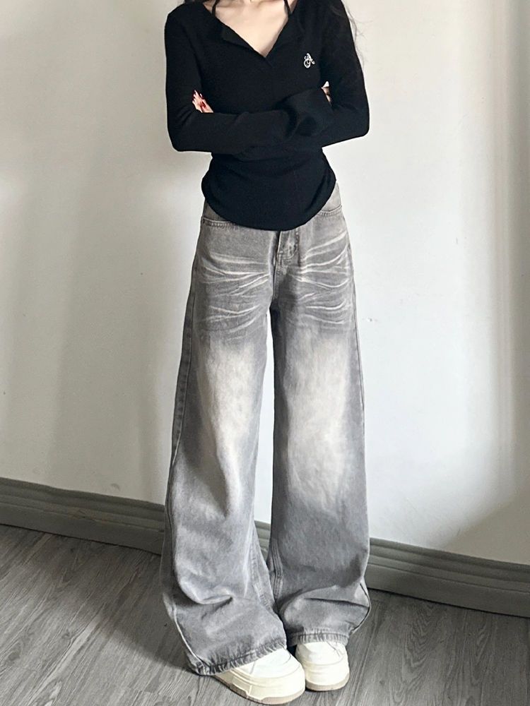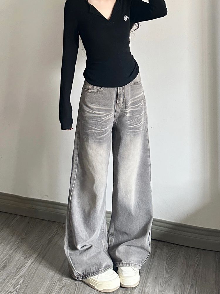 Celana Jeans Lurus Warna Abu-abu Retro Gaya Amerika Celana Panjang Longgar Terpasang Musim Panas Wanita Celana Kaki Lebar Pinggang Tinggi