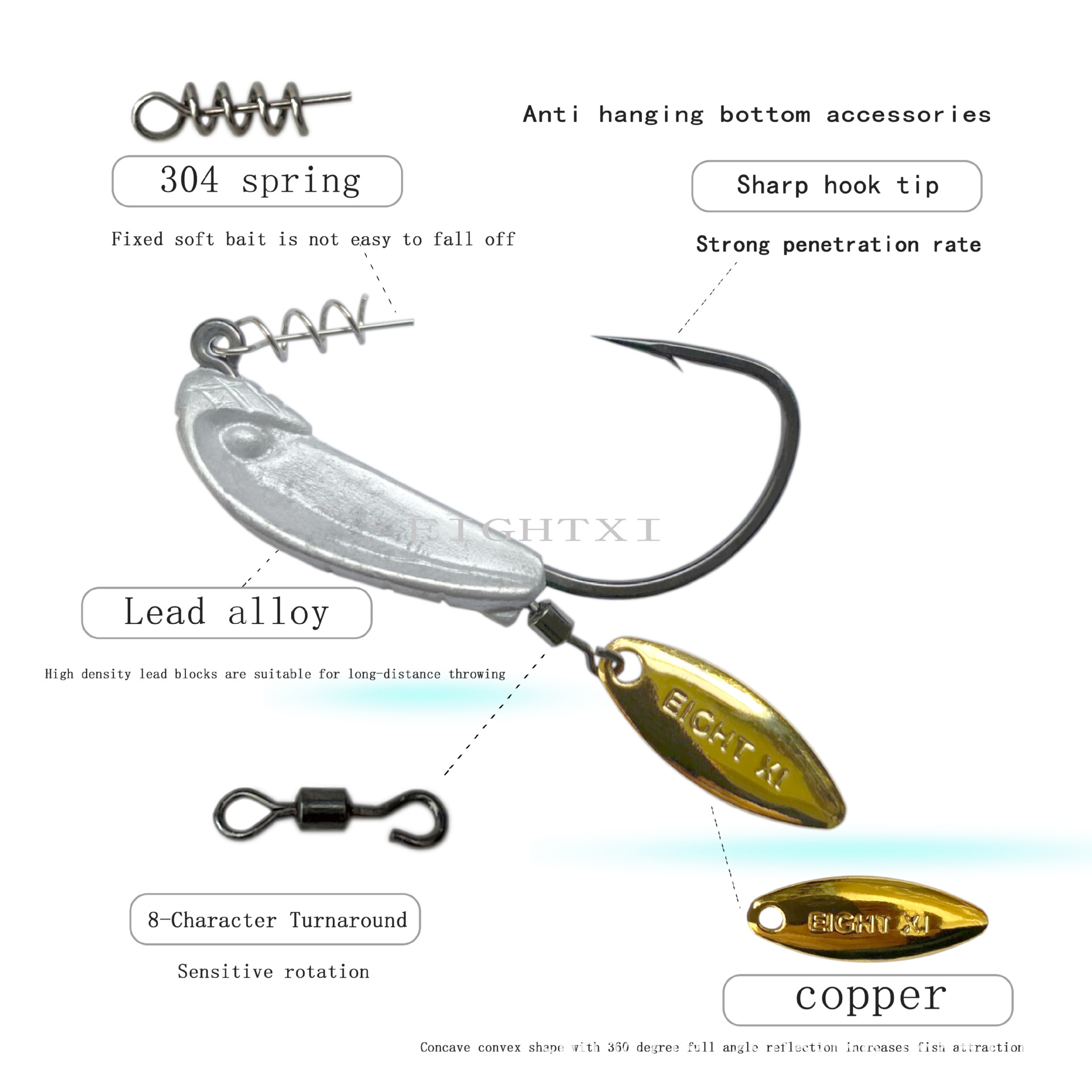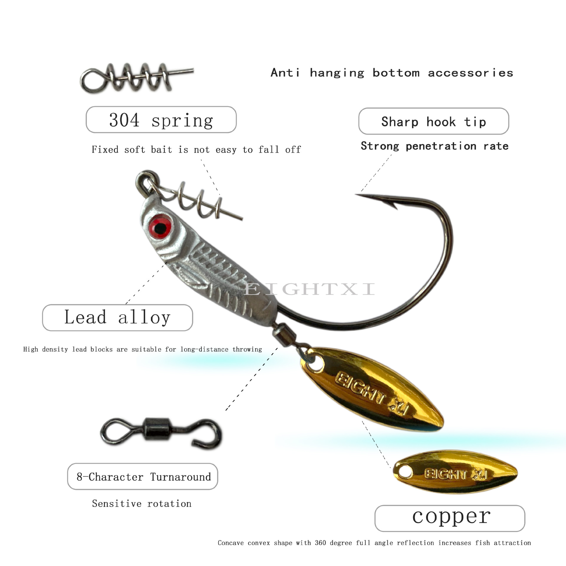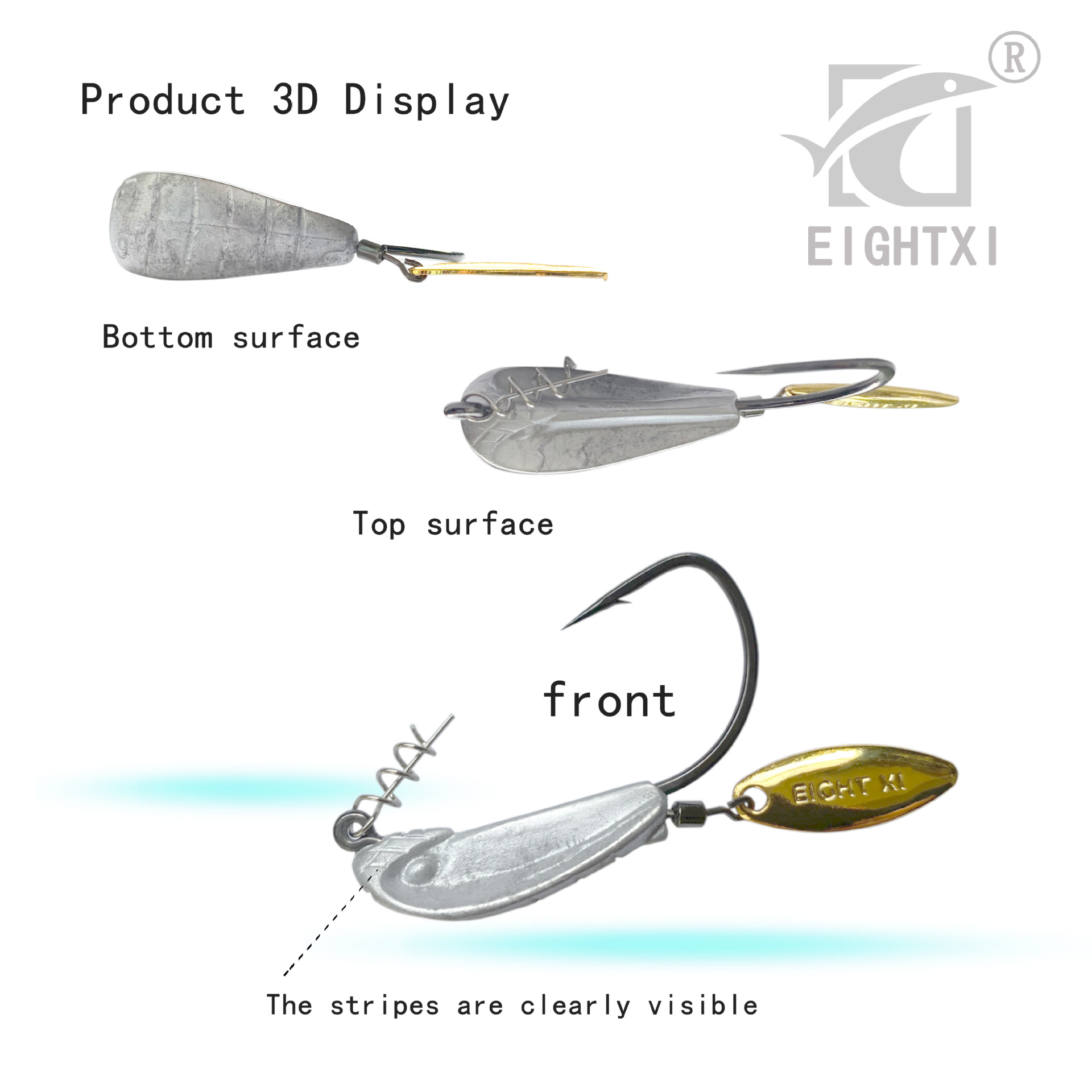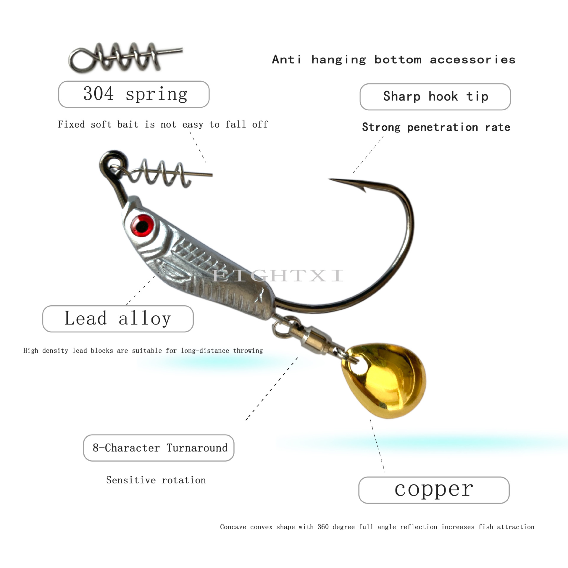 我们八溪整个钓鱼钩钩身是一个带曲柄弹簧铅钩的造型,原创的纹理和鱼眼设计,手工打磨,搭配了一个旋转小亮片,增加诱鱼性。我们八溪的铅是设计在钩子的头部,而且钩身在铅柄的中间位置。