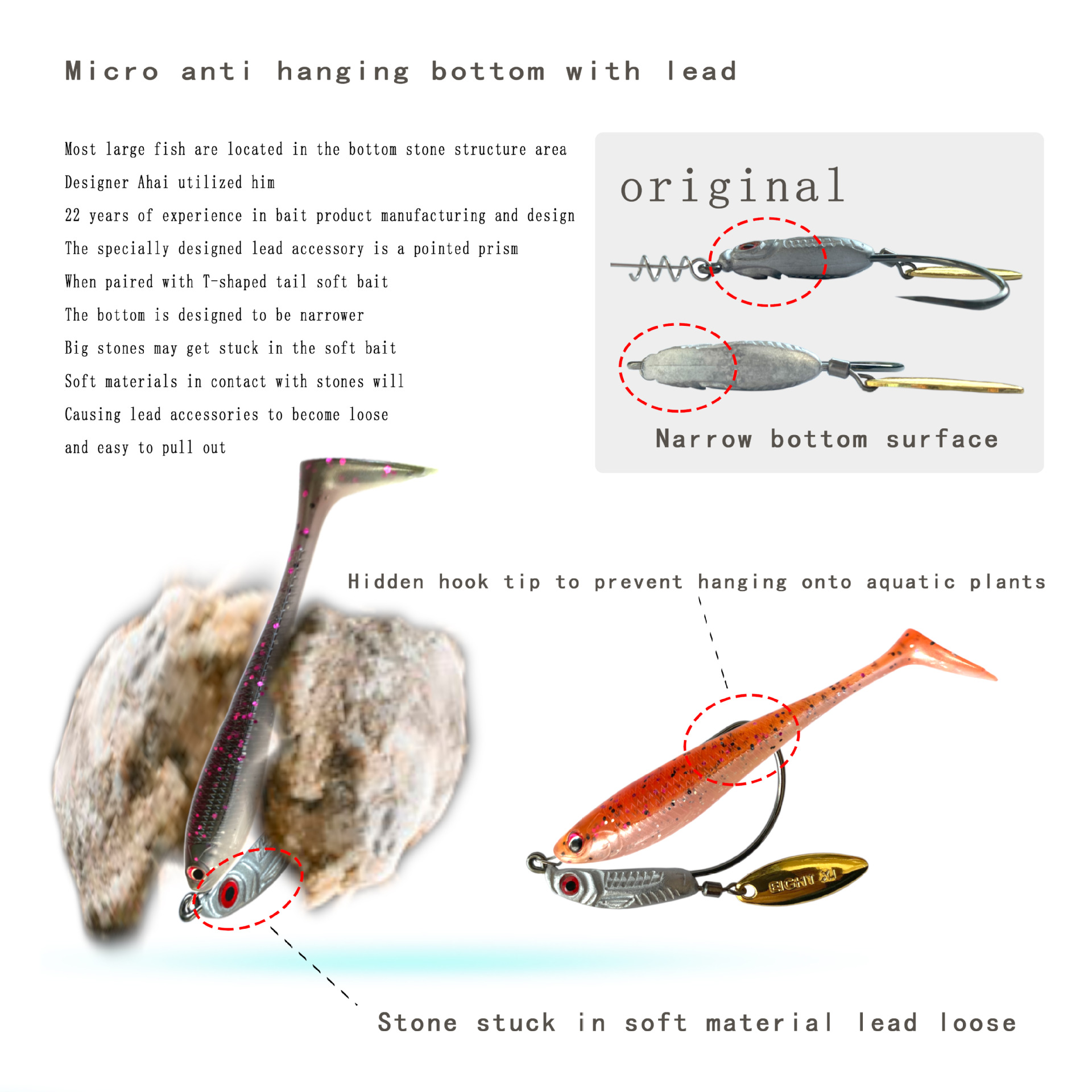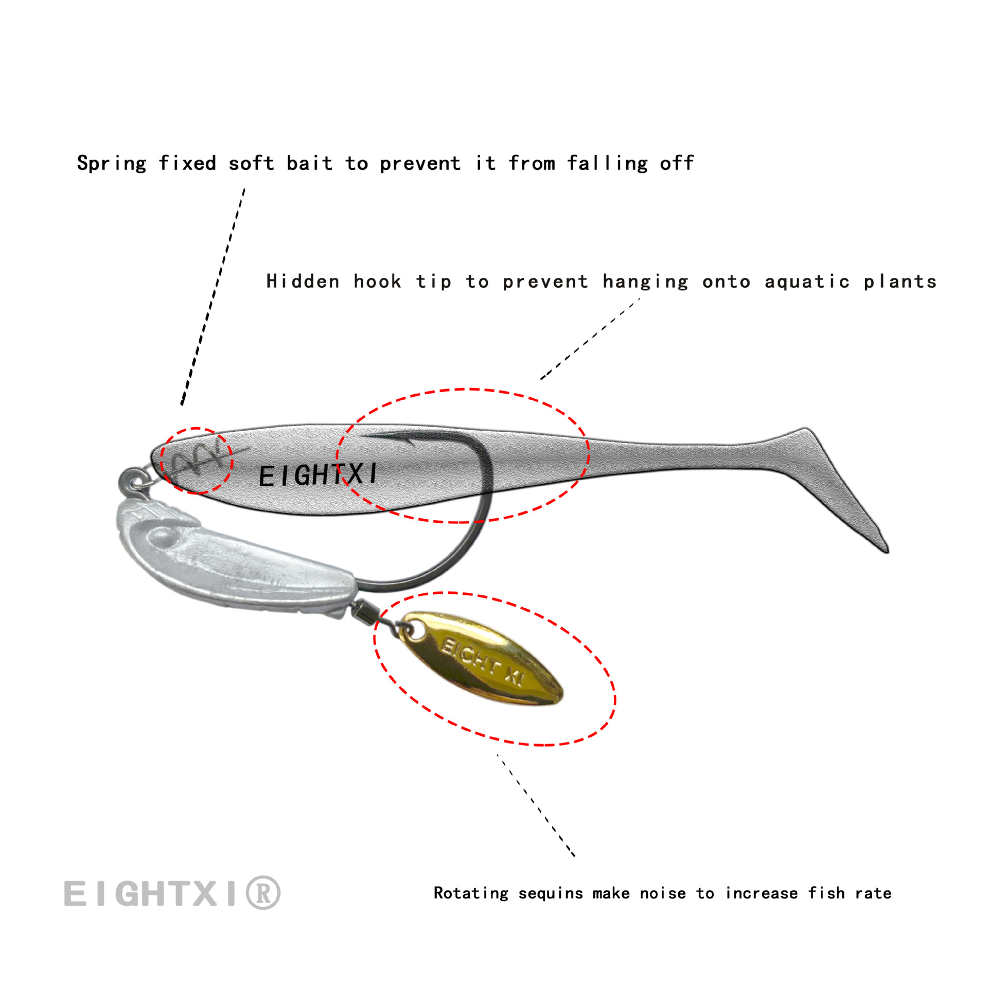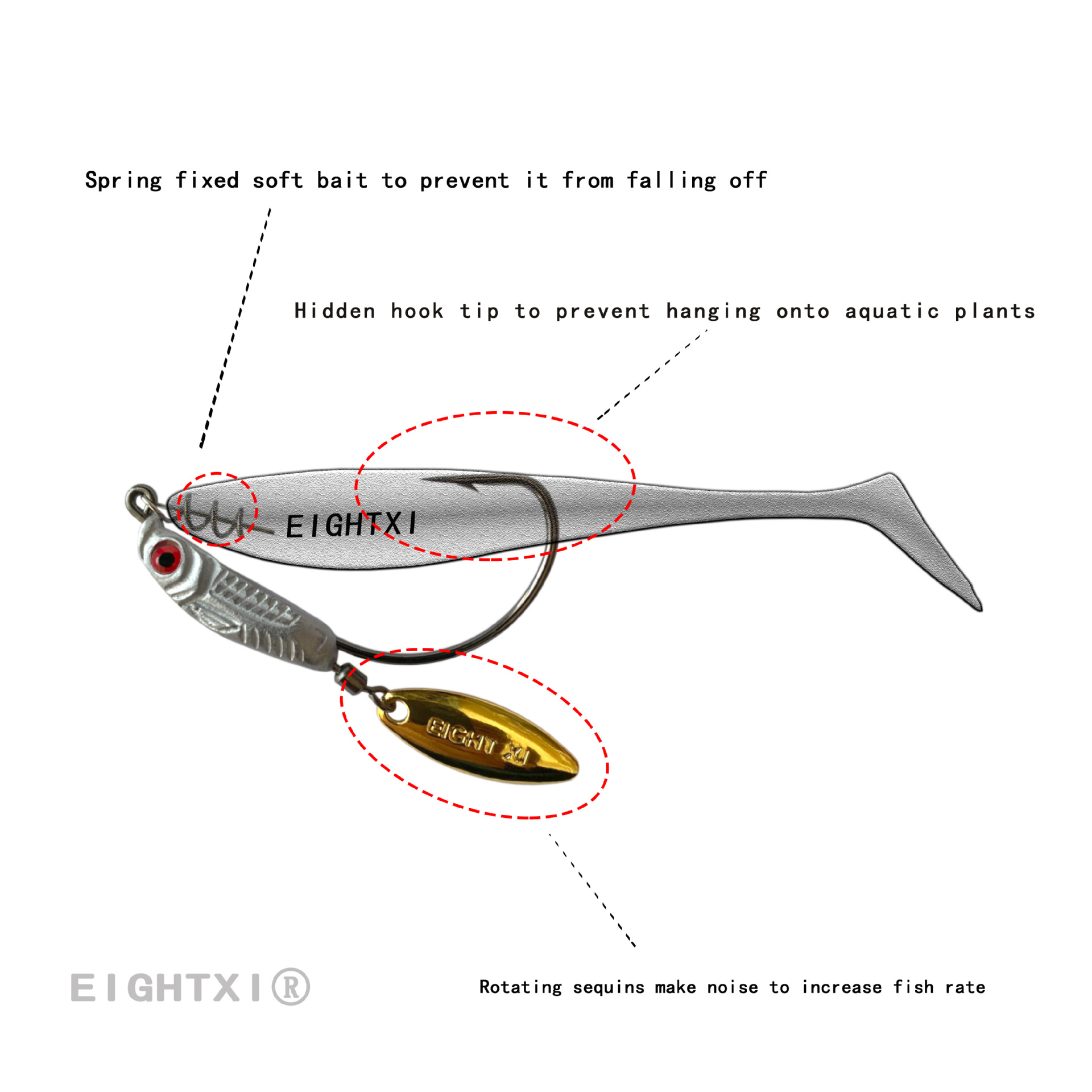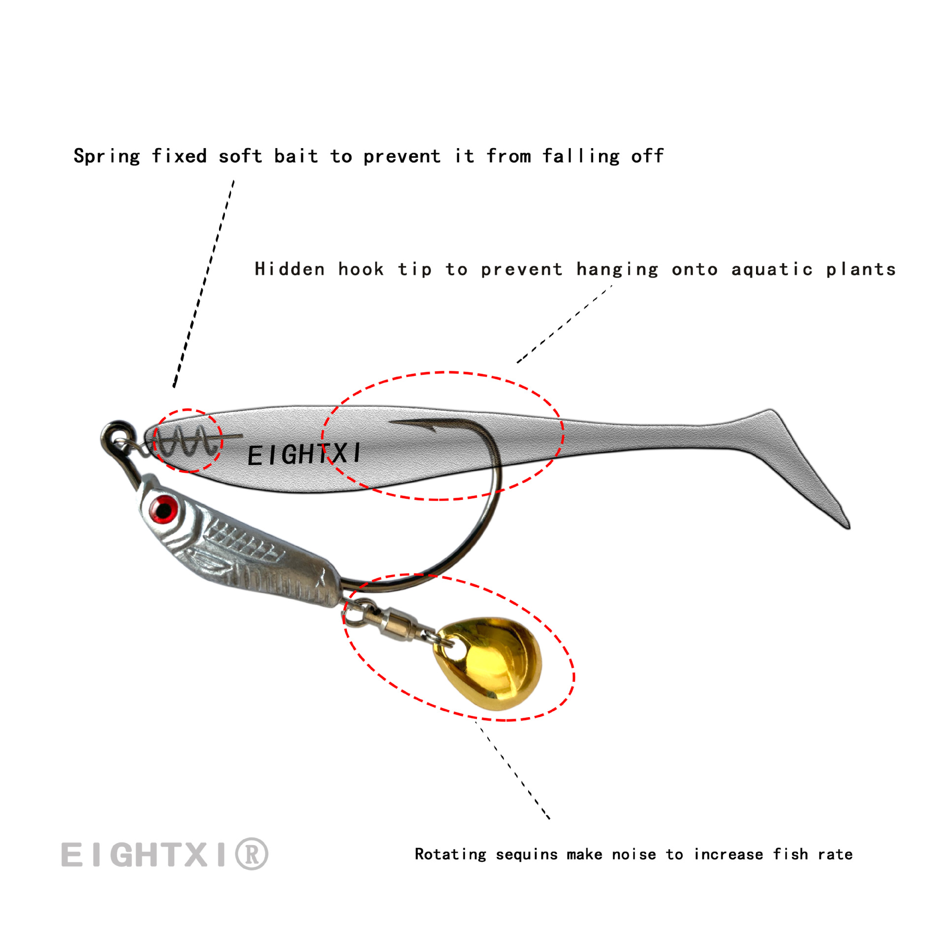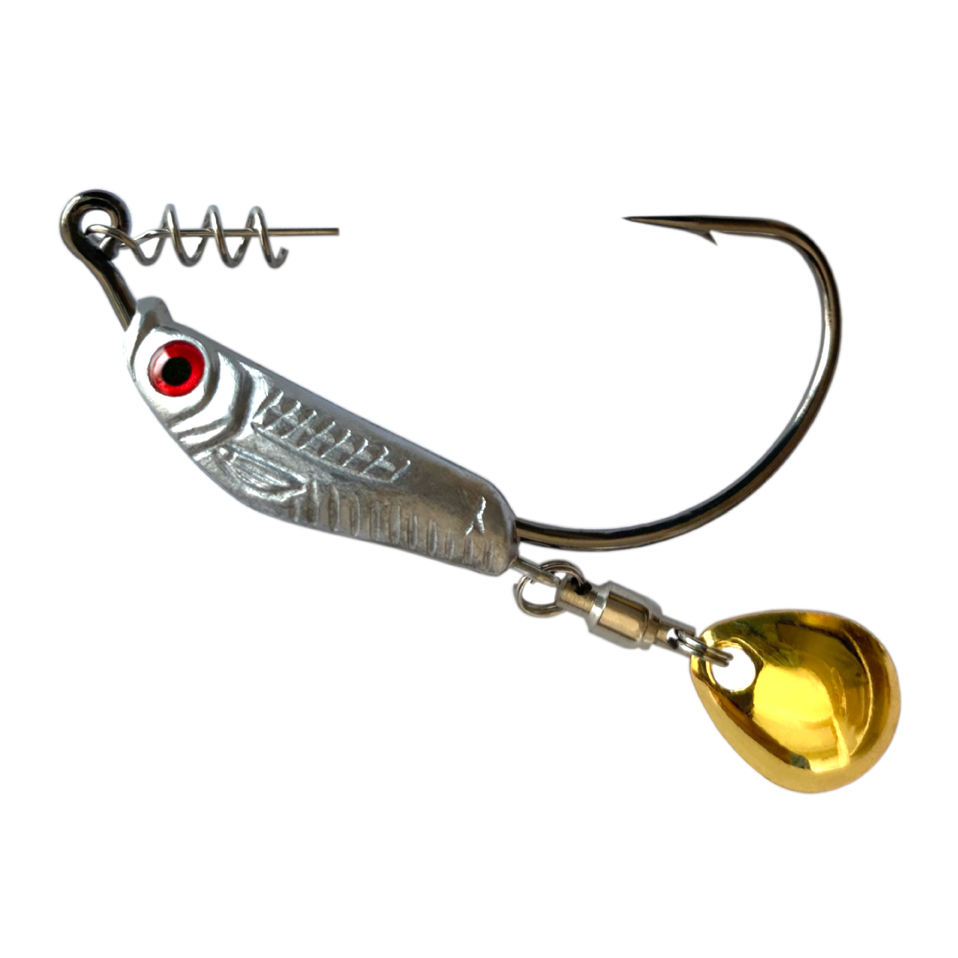 我们八溪整个钓鱼钩钩身是一个带曲柄弹簧铅钩的造型,原创的纹理和鱼眼设计,手工打磨,搭配了一个旋转小亮片,增加诱鱼性。我们八溪的铅是设计在钩子的头部,而且钩身在铅柄的中间位置。
