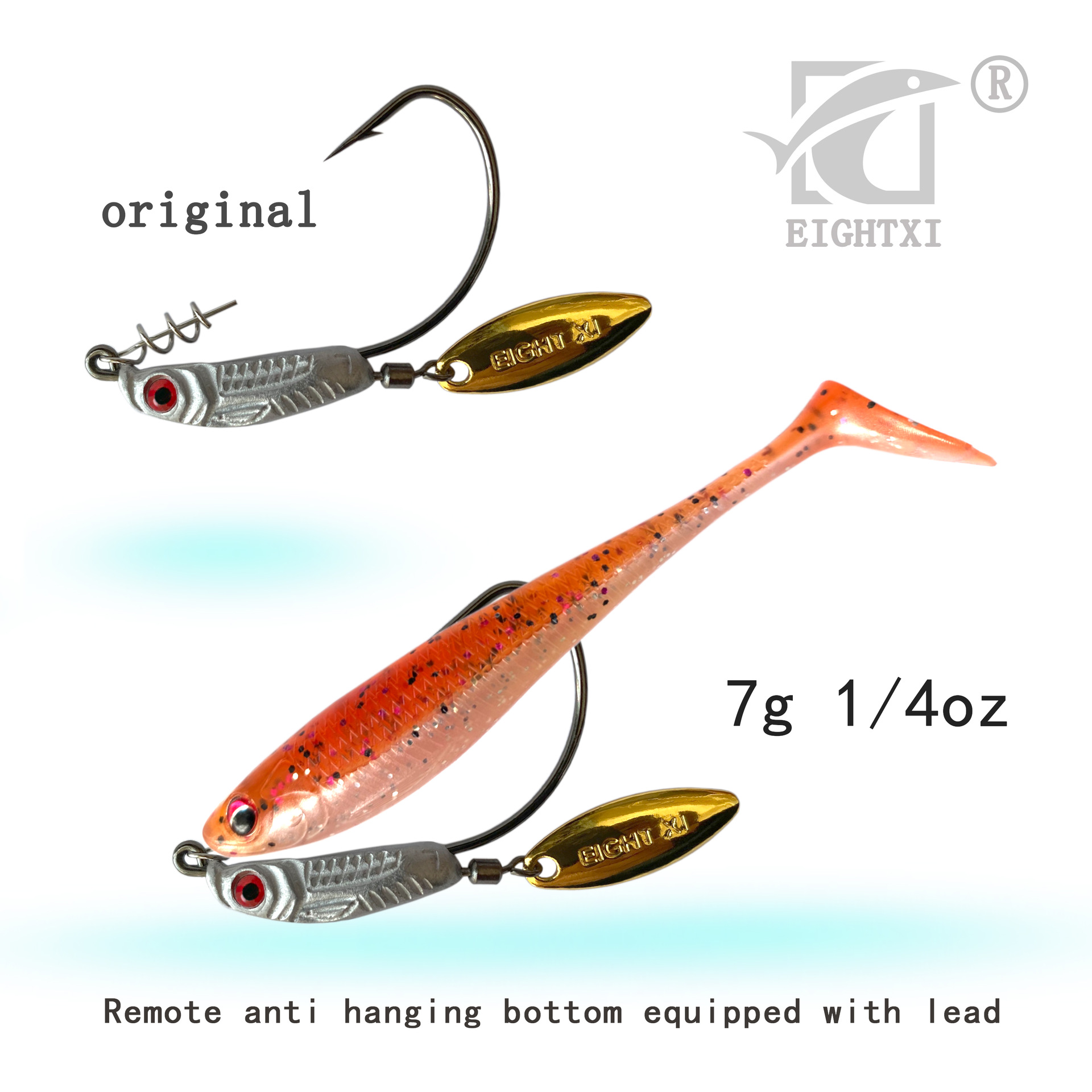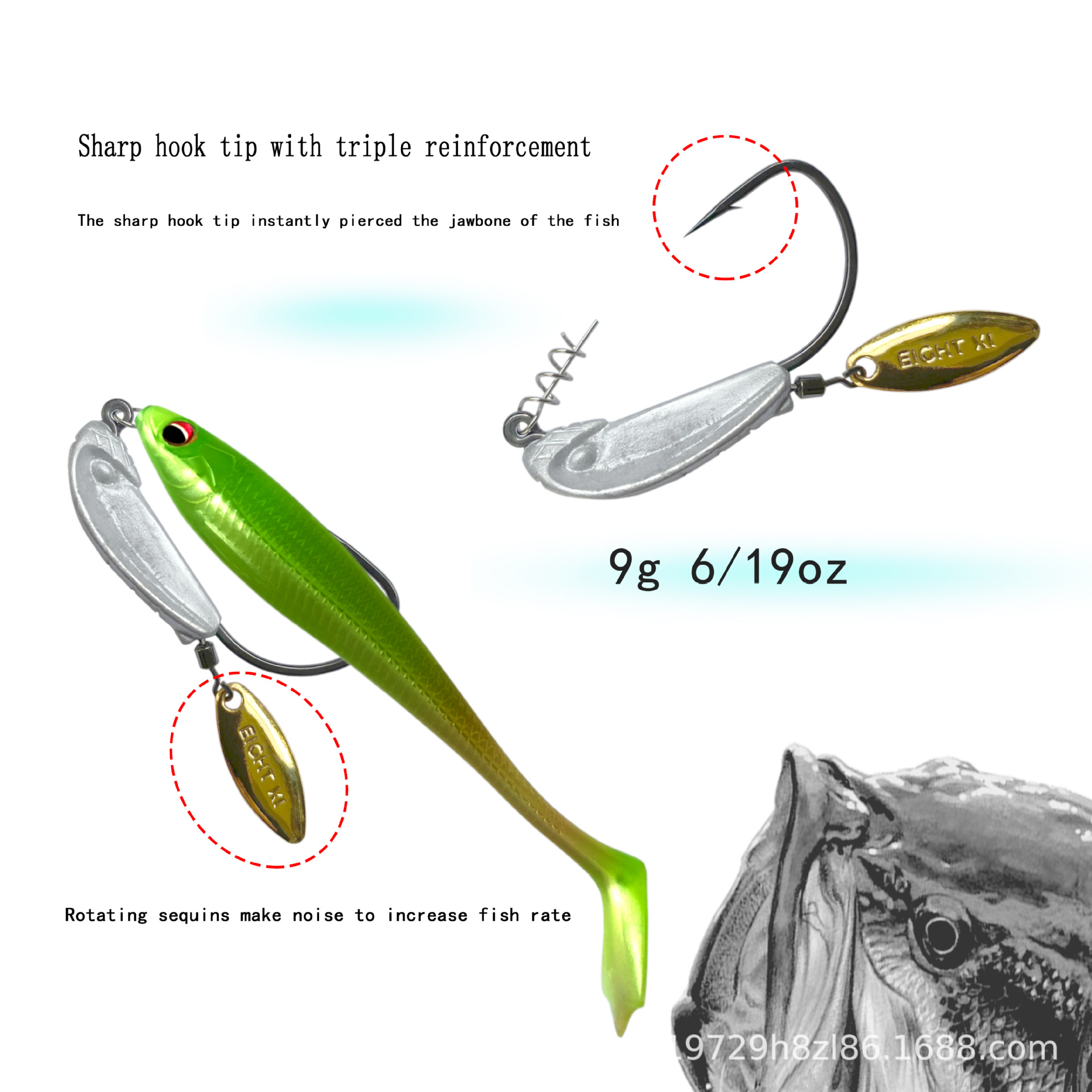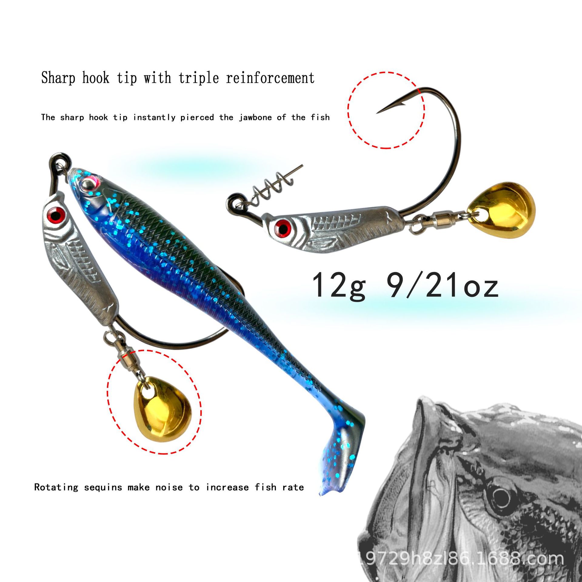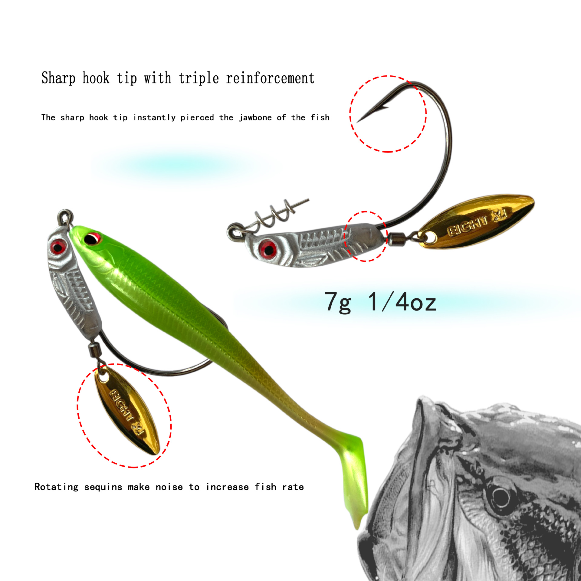 eightxi 3D鱼眼铅坠钓鱼钩 VIB亮片钓鱼钩,特氟龙电镀工艺勾尖锋利路亚Nff软饵钓鱼钩7克9克12克三种重量鱼钩选择