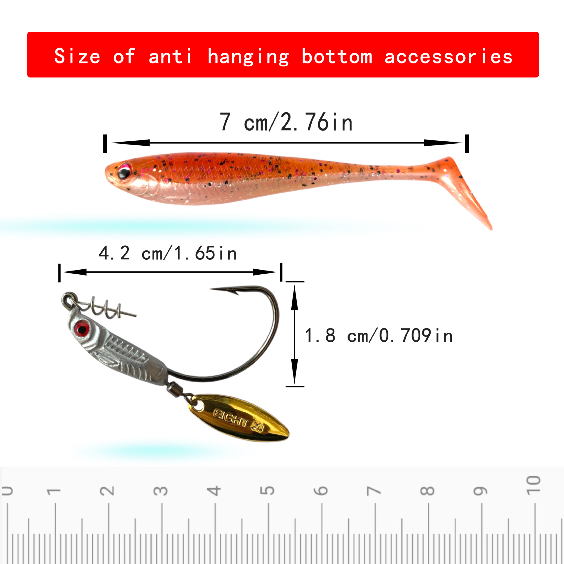 钓鱼钩尺寸:钩长2.8cm.钩门宽:1.2cm,(手工测量略有误差)