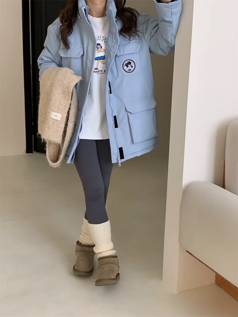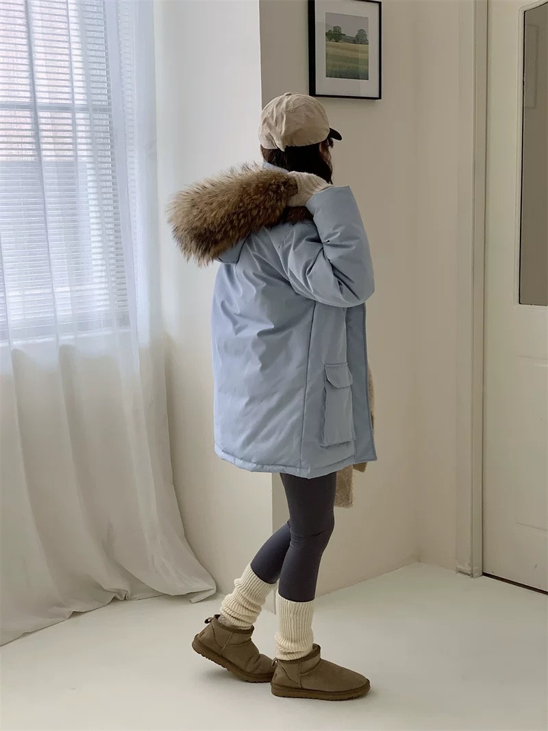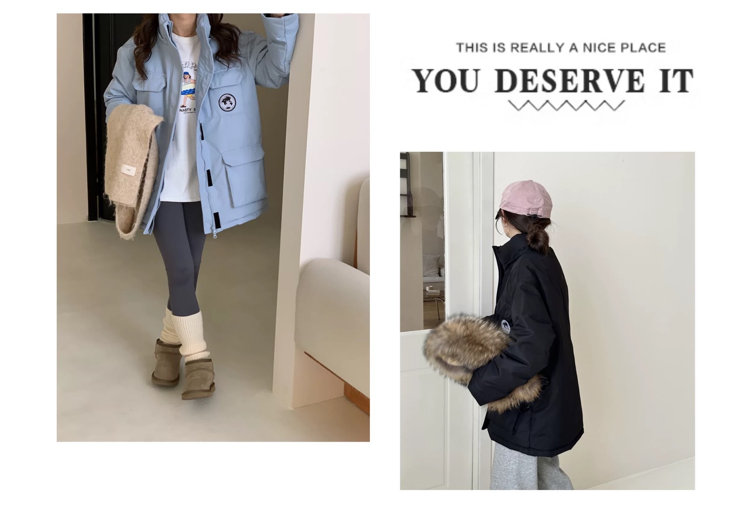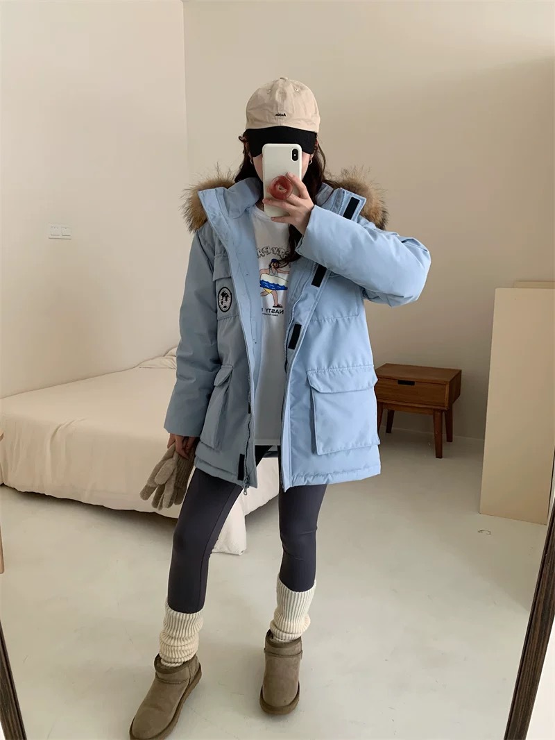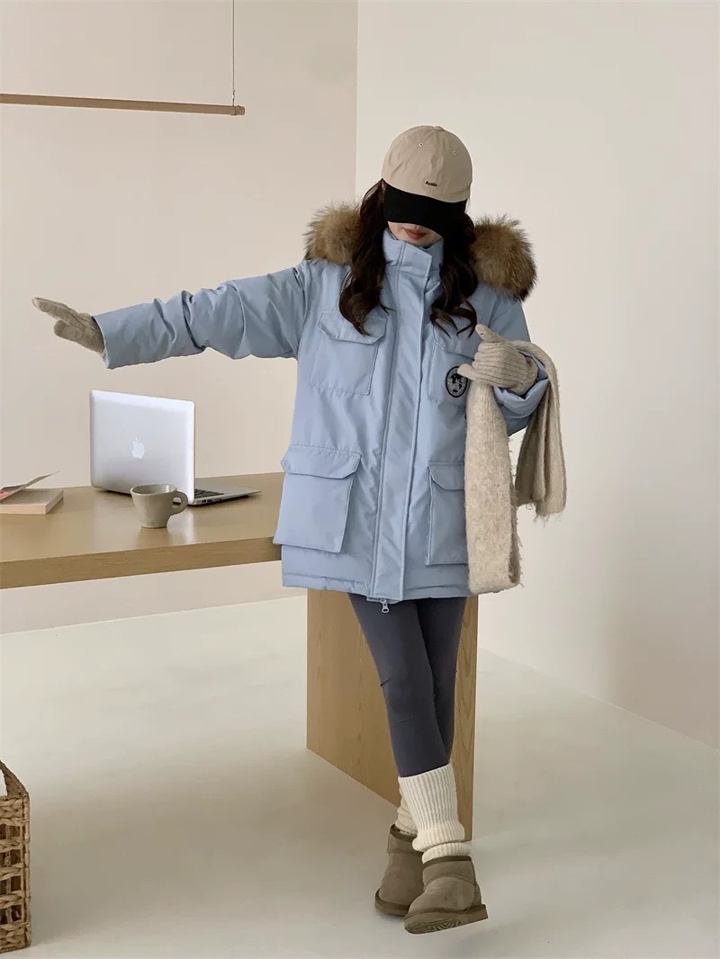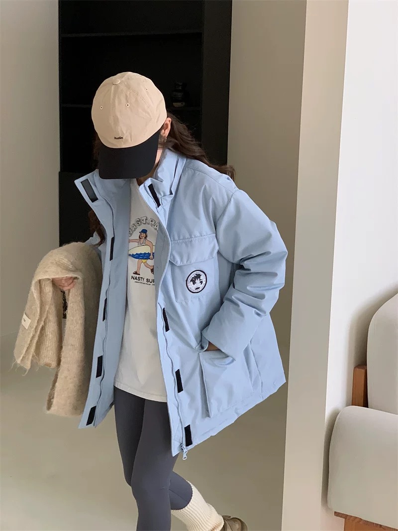 Jaket Kerja Warna Biru Jaket Couple Longgar Ekstra Tebal Model Panjang Sedang Pakaian Pike Model Baru 2025 Pria Kecil Wanita Jaket Musim Dingin