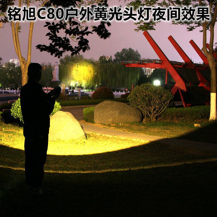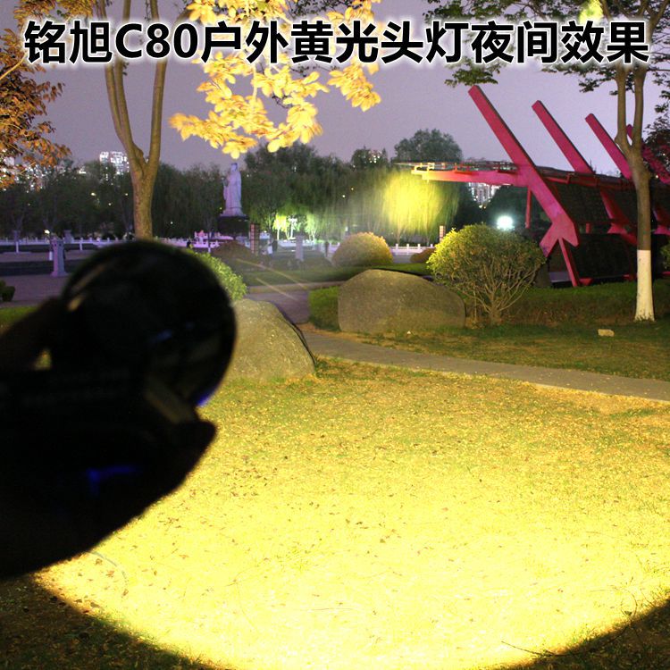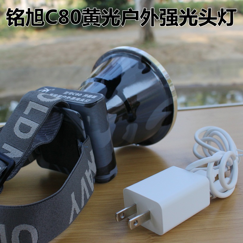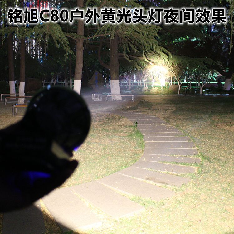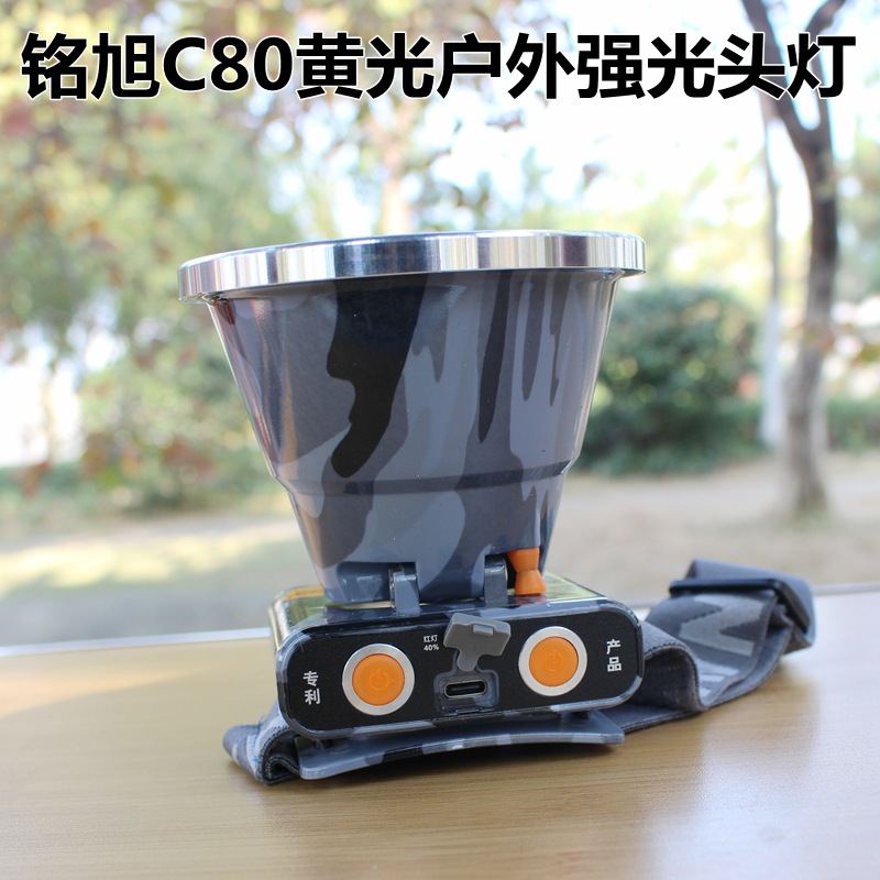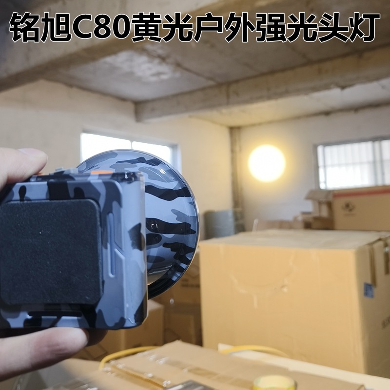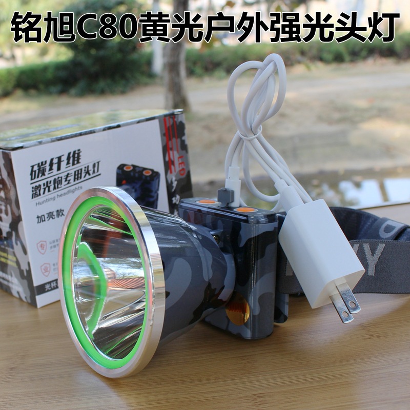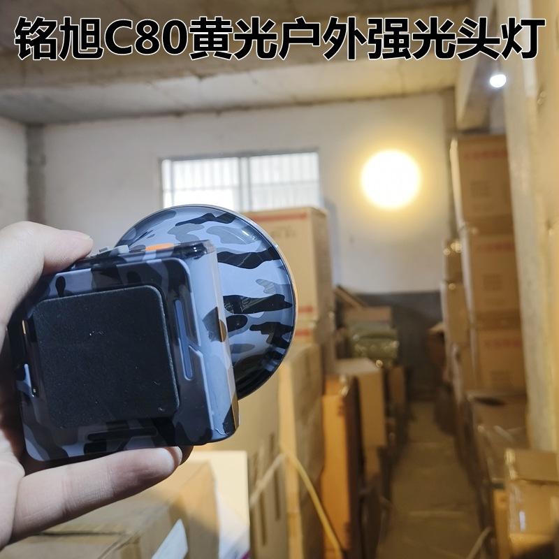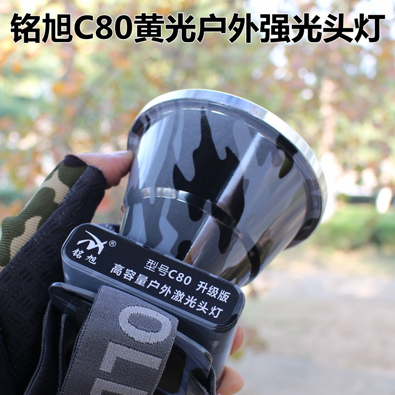 铭旭C80(黄光)大功率户外激光头灯,进口激光灯珠,有效射程1000米,纯黄光3500K光源,灯头直径10.5CM,内置三节18650高容量锂电池,带电量指示,强光连续照明8小时,3个档位:强光、弱光、爆闪;高容量超长续航、轻巧耐用,适合户外水面捕鱼、蚂蝗、探险等多种夜间照明!
