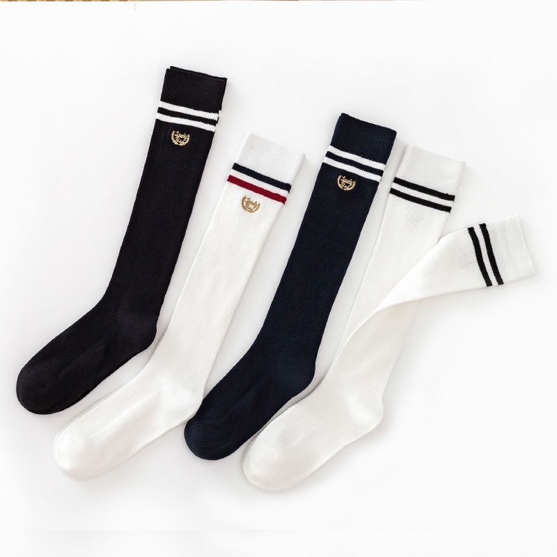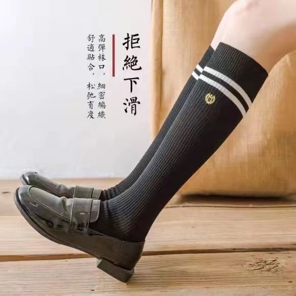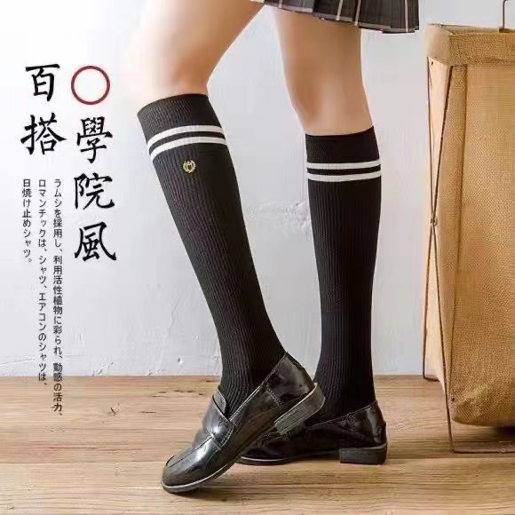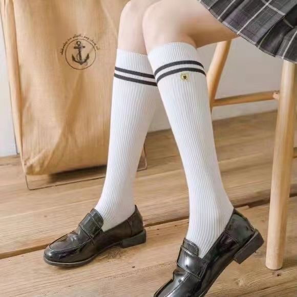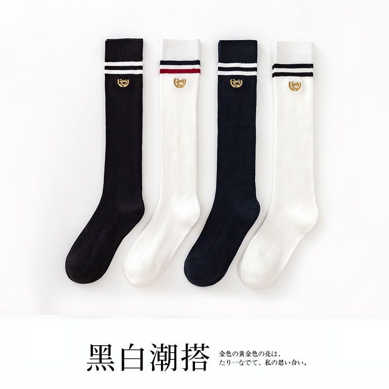 Kaus kaki betis jk kaus kaki wanita hitam dan putih dua bar panjang setengah betis musim semi dan musim panas gaya mahasiswa ramping stoking tinggi gaya Korea