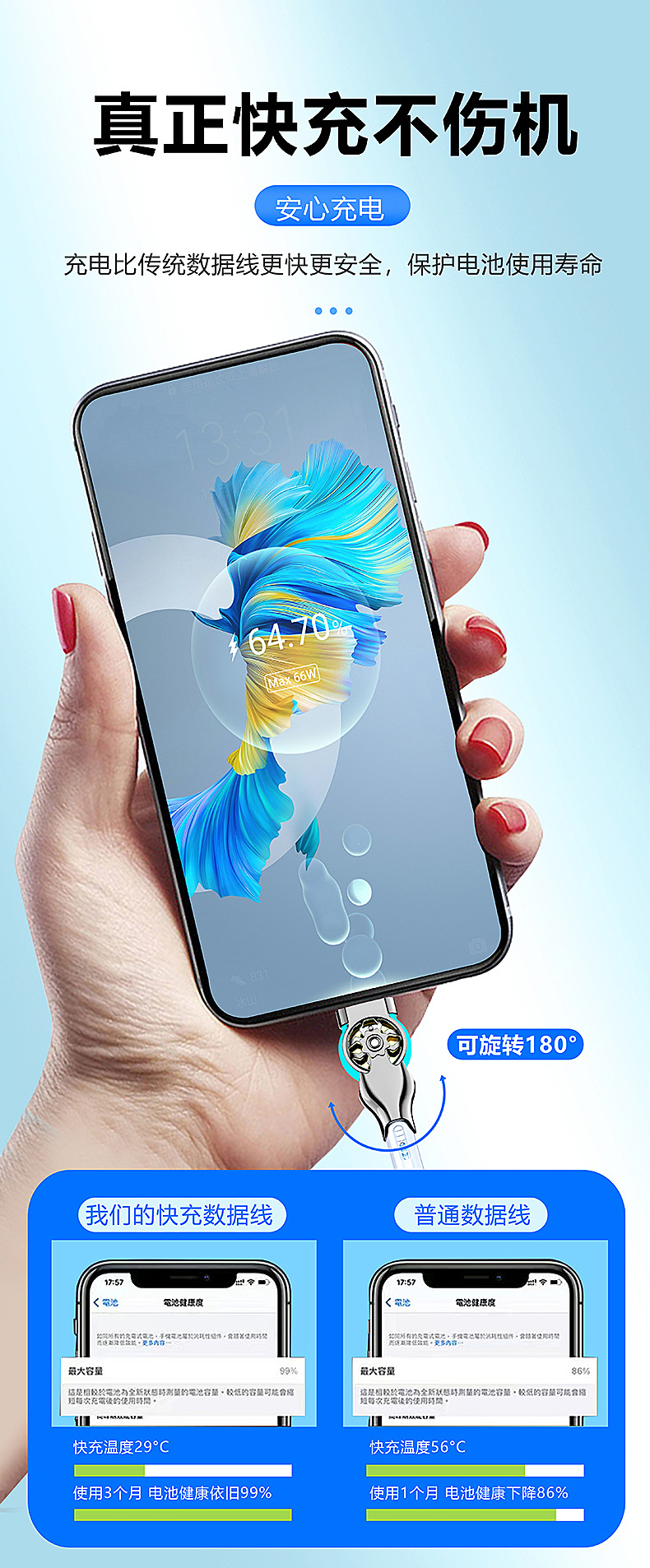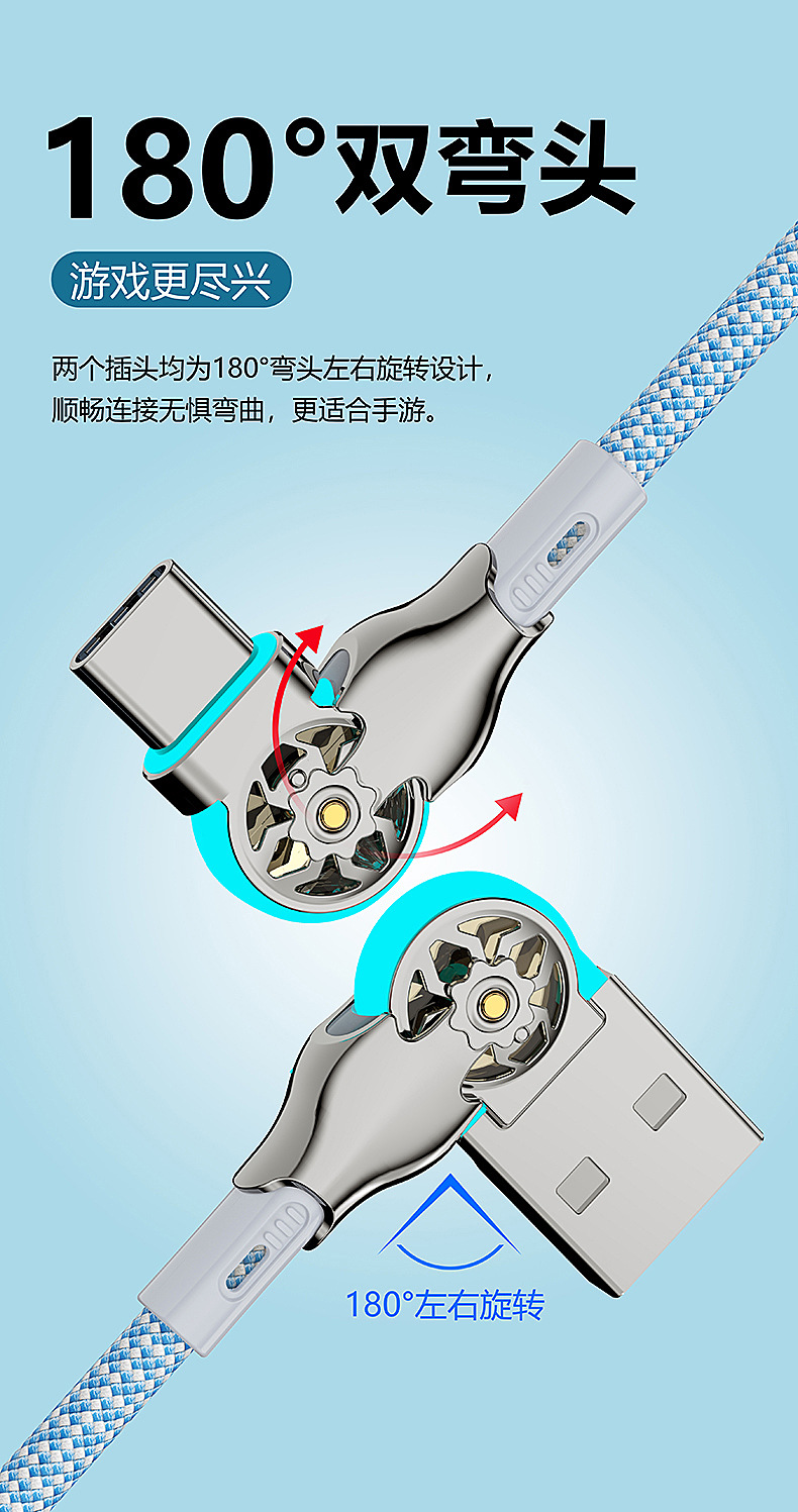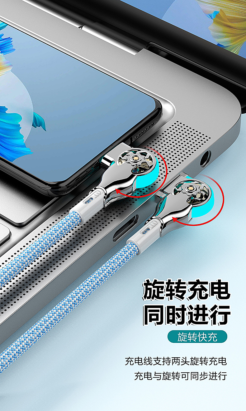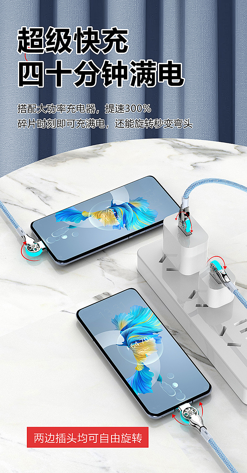 Kabel data pengisian daya cepat untuk mobil, kabel pengisian daya ponsel Android Apple, kabel pengisian daya Cepat tipe-c panjang, lampu berputar siku ganda