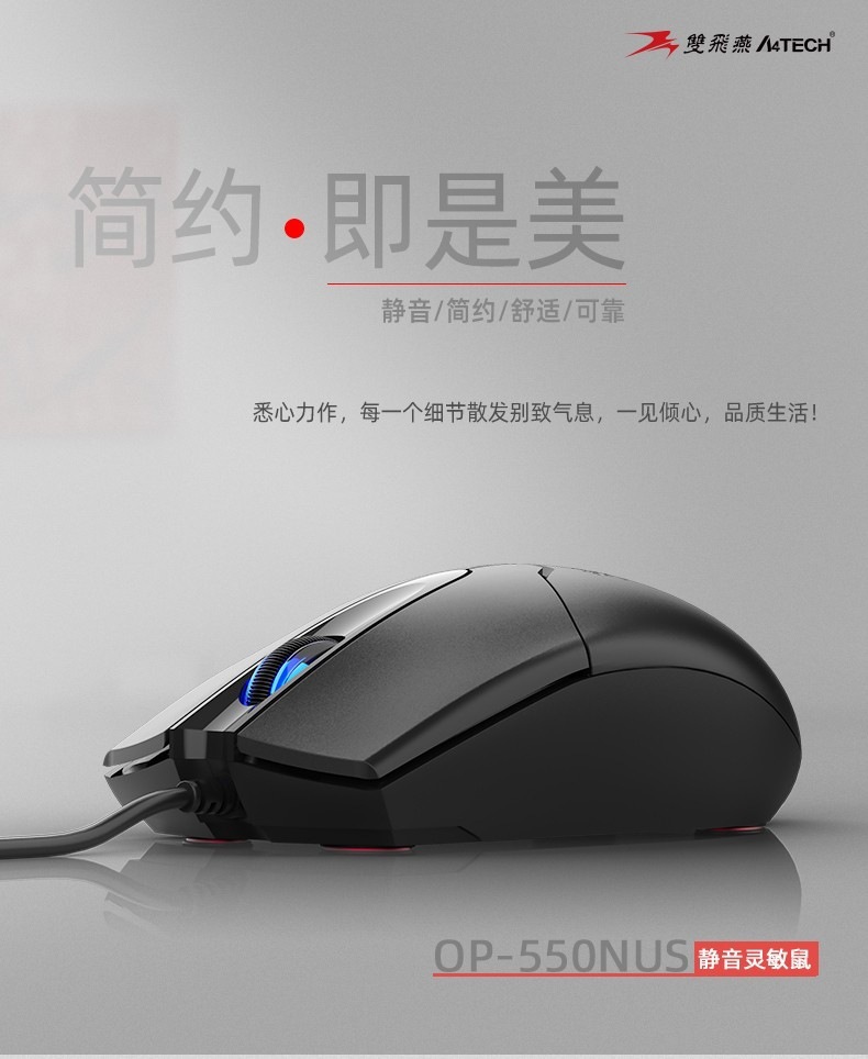 双飞燕OP-550有线鼠标左右按键为经典的分离式设计,手感清脆,回弹有力。