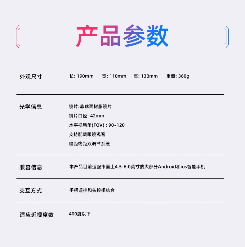 VR魔镜本身没有屏幕也无需用电池,必须配合手机一起使用;使用中所有的画面和声音来自于手机本身。因此体验效果跟手机本身的配置有非常重要的关系! The VR Magic Mirror itself does not have a screen and does not require a battery. It needs to be used in conjunction with a mobile phone. All the visuals and sounds during usage come from the mobile phone itself, so the experience is highly dependent on the configuration of the mobile phone.