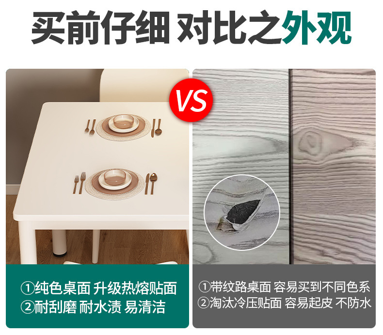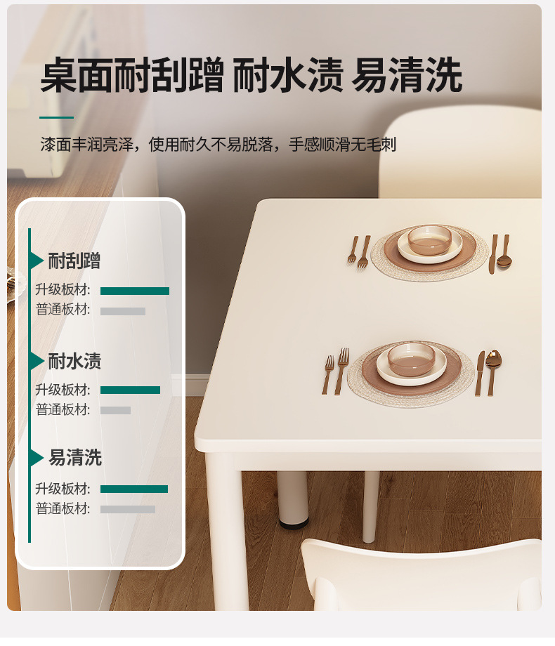 Meja makan persegi panjang minimalis modern untuk apartemen kecil, meja makan panjang bergaya INS warna krem, meja makan dan kursi untuk apartemen sewa.