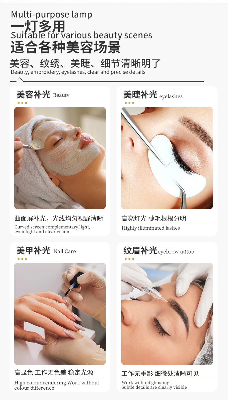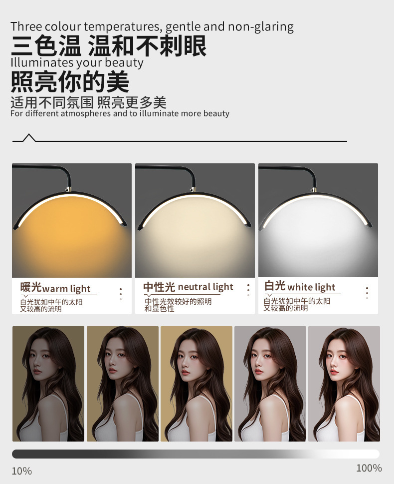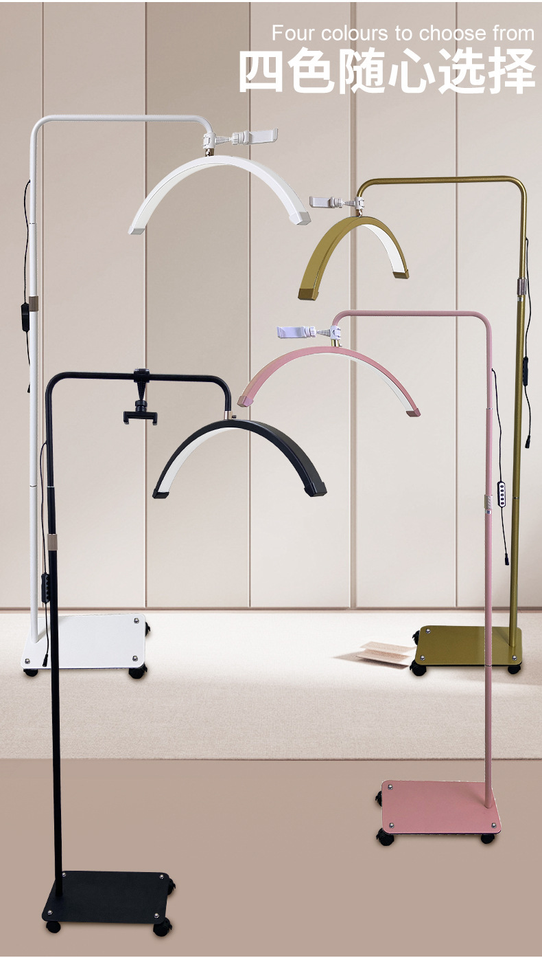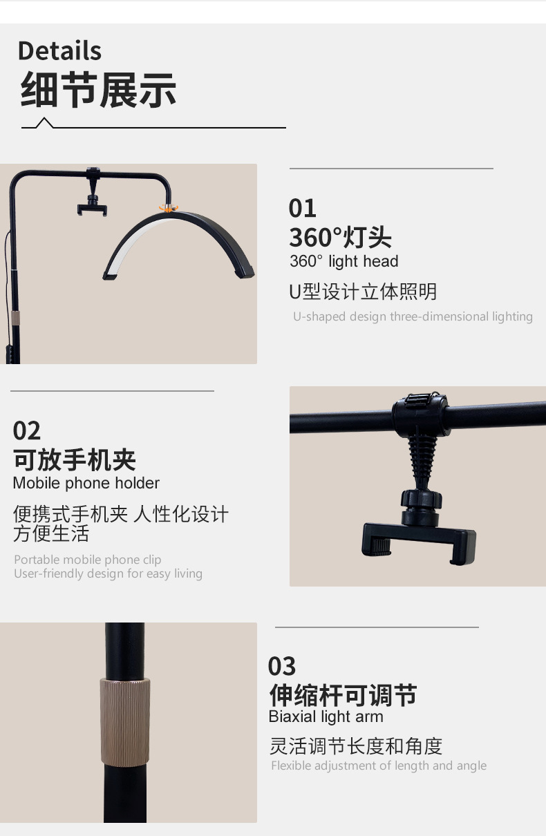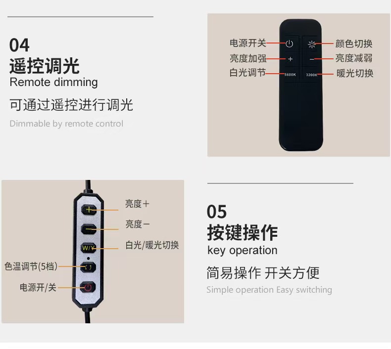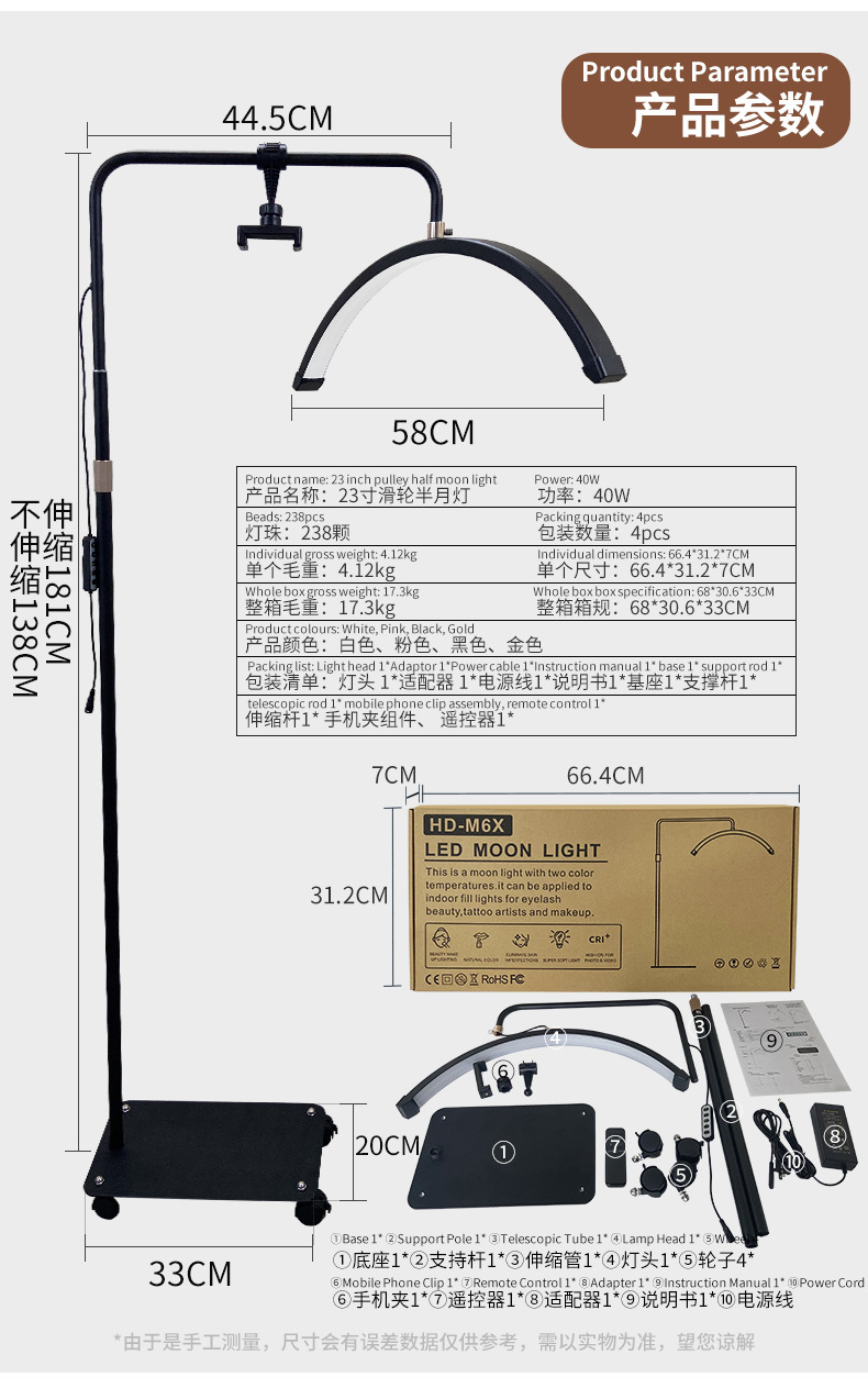 包装清单:灯头 24V2A适配器 AC电源线 说明书 基座 支撑杆 伸缩杆组件 手机夹组件 遥控器 滑轮