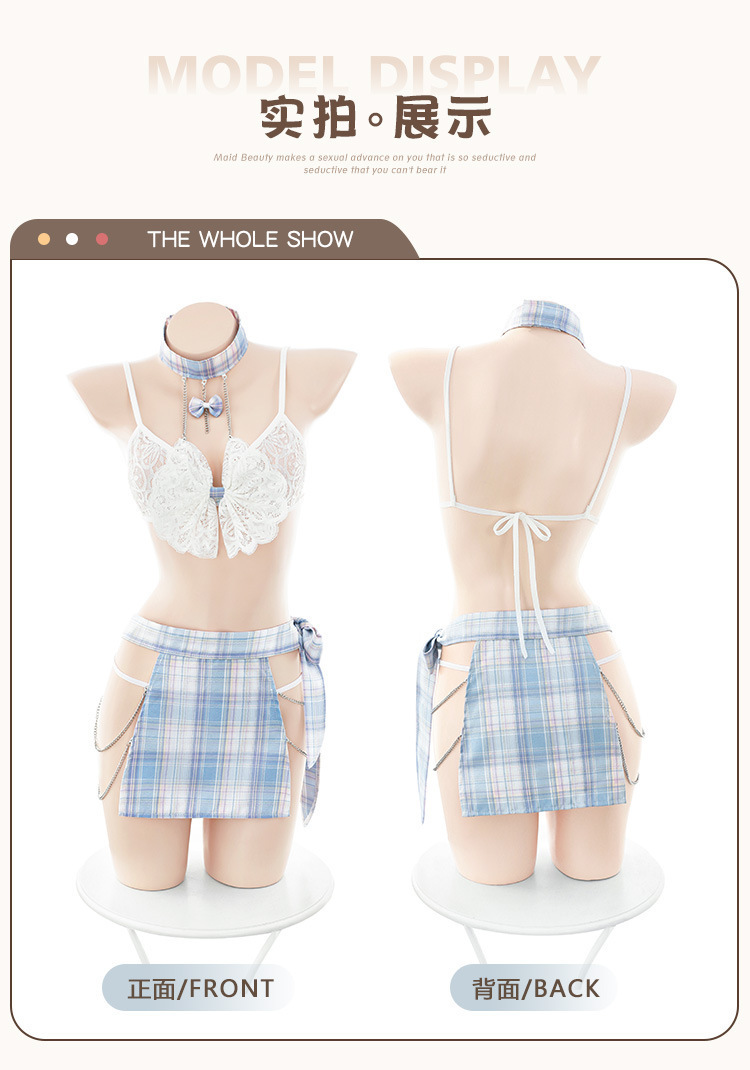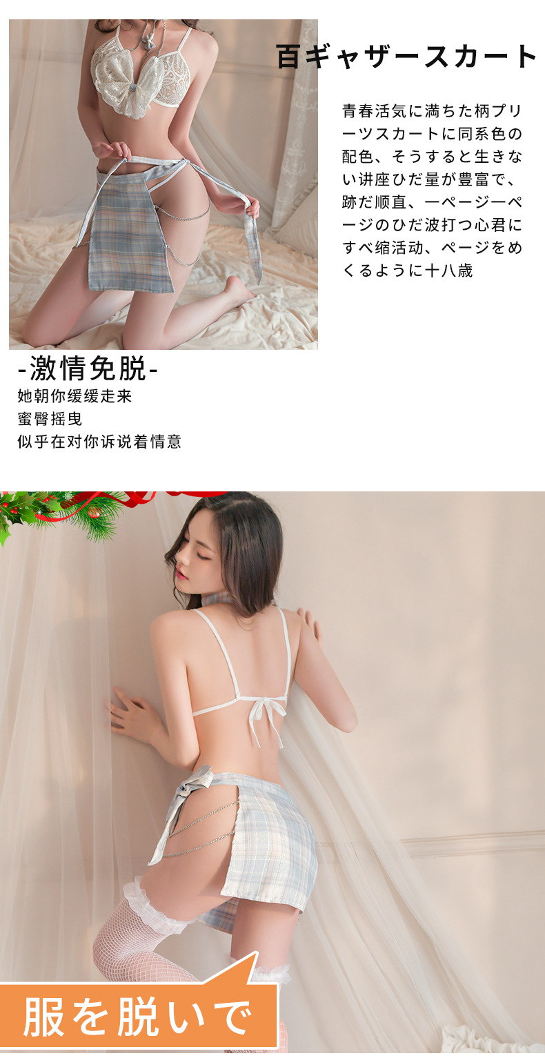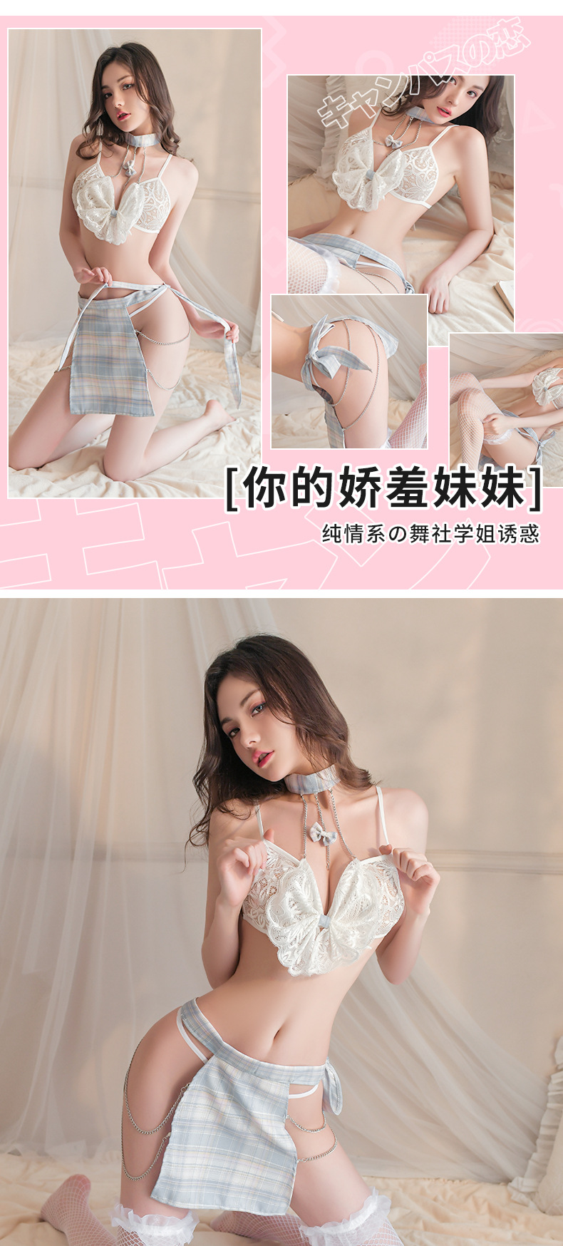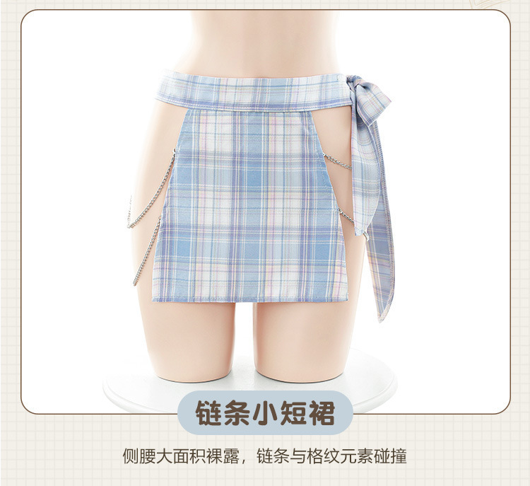 Seragam lingerie seksi gairah menggoda gadis manis rantai busur setelan terpisah rok JK kotak-kotak biru 2308 sweetheart