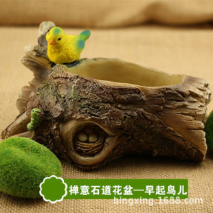 秉兴厂家直销防木头树桩创意多肉植物微景观小鸟禅意树脂花盆容器