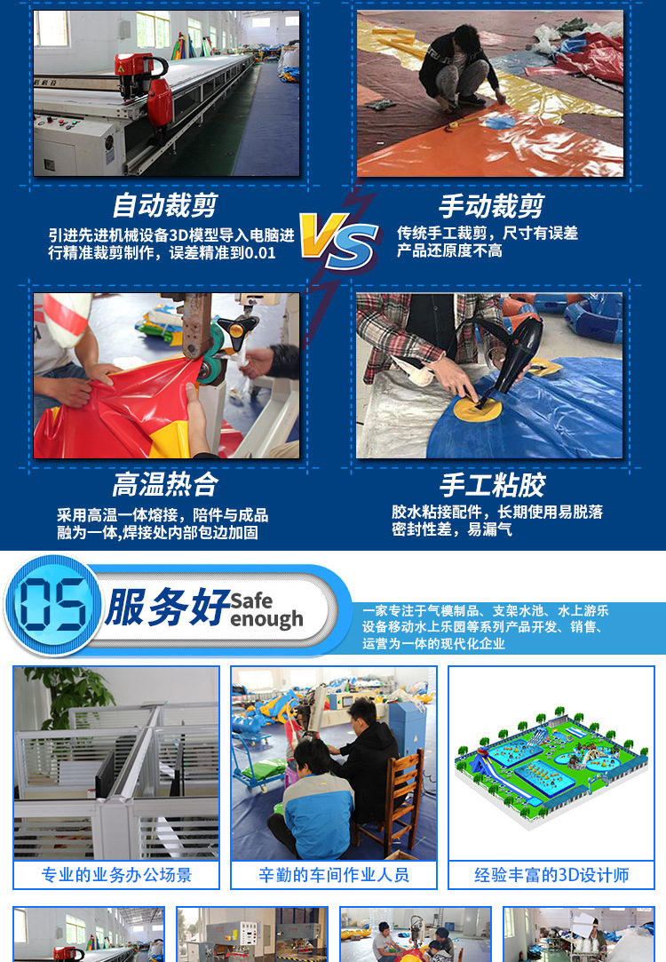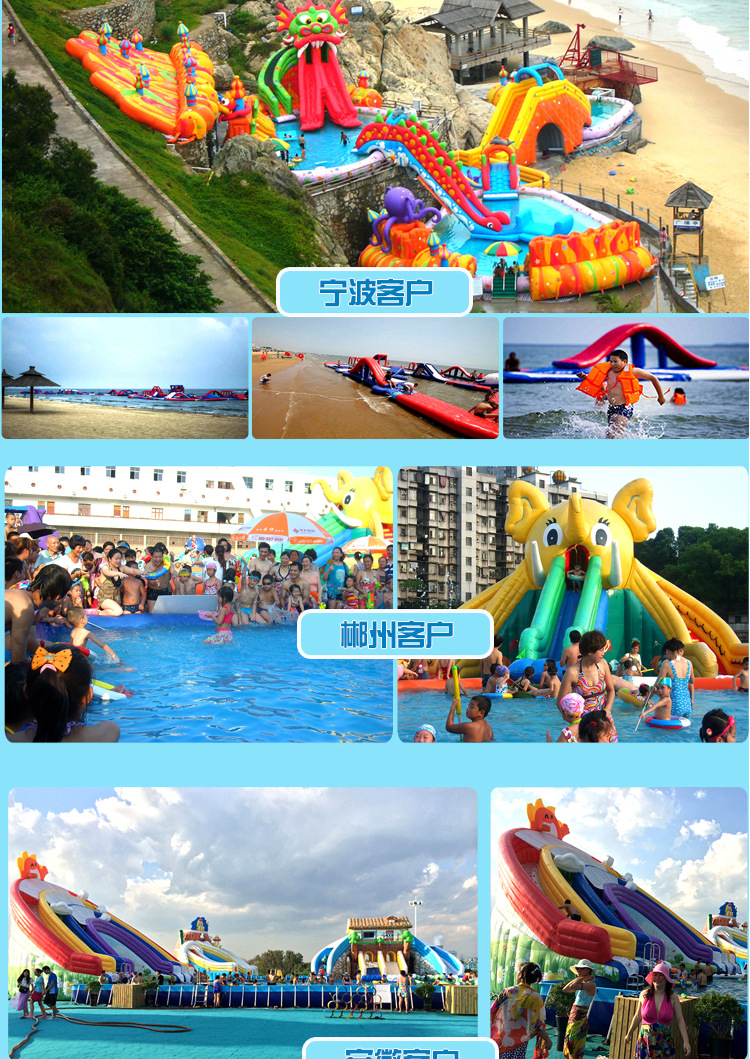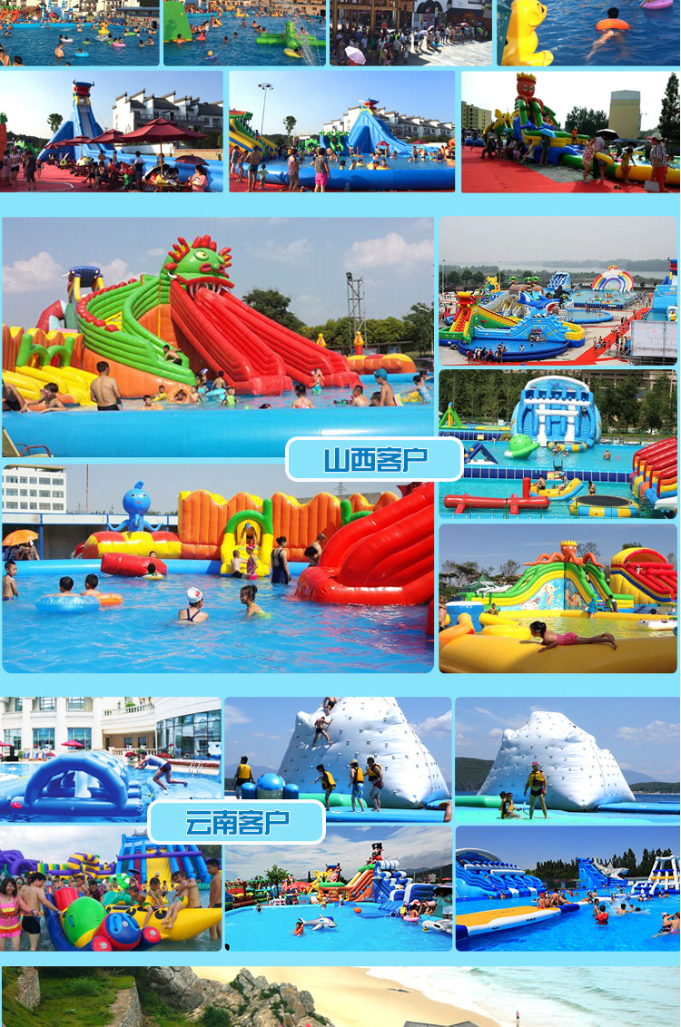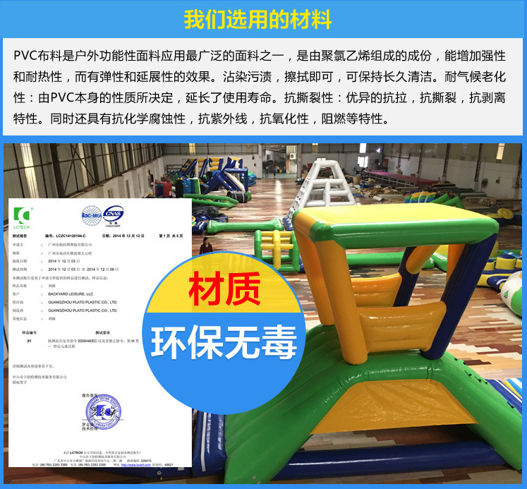广州正粤充气制品有限公司是一家大型专业生产气模的厂家,我公司占地面积达4000平方,两间大型仓库保证客户产品储存。专业生产大型充气水上乐园、充气水上冲关。水池滑梯组合、充气水池、支架水池、大型充气城堡、充气滑梯、陆地大滑梯、淘气堡、陆地闯关、儿童乐园、大黄鸭、跷跷板、等各种水上漂浮玩具。水上玩具、户外帐篷,趣味运动组合,彩光气模,商业广告卡通、升空球、拱门等,水上游乐设施,海域游乐冲关设备等产品,拥有完整、生产、销售、科学的管理质量认证体系。