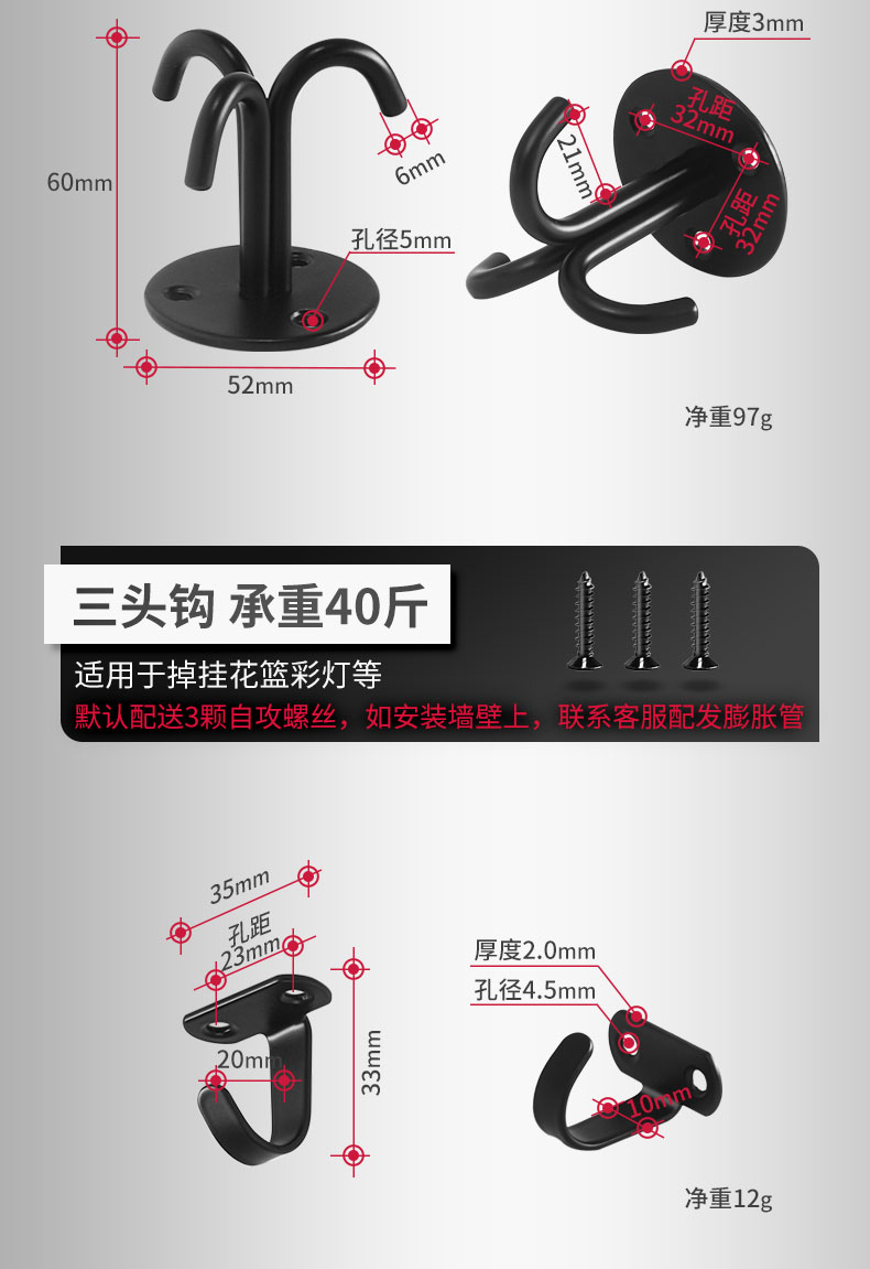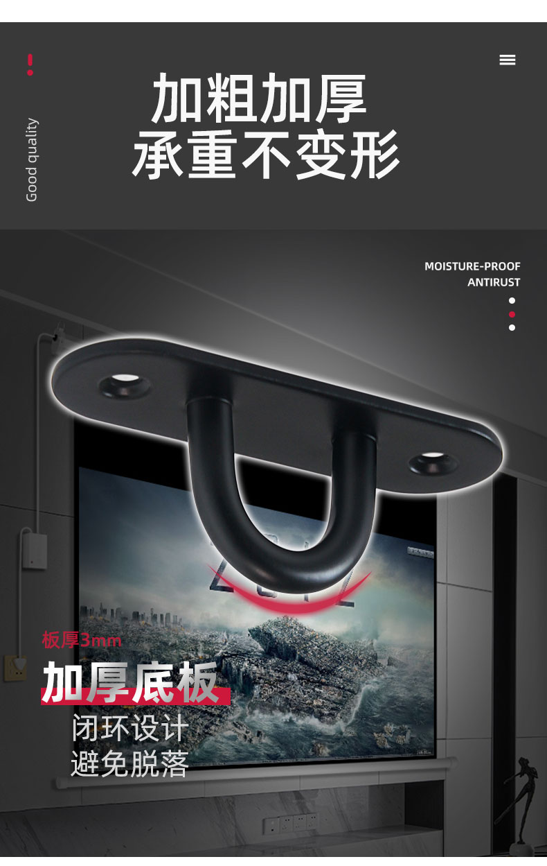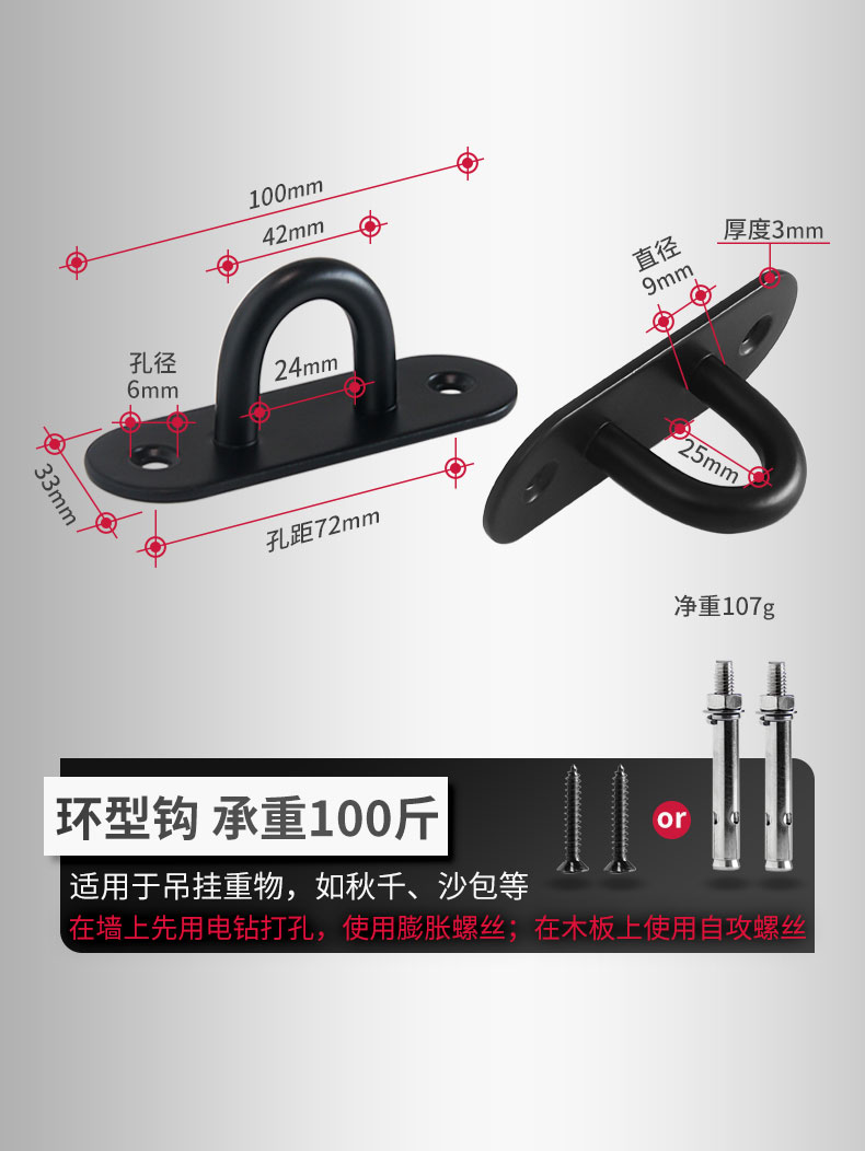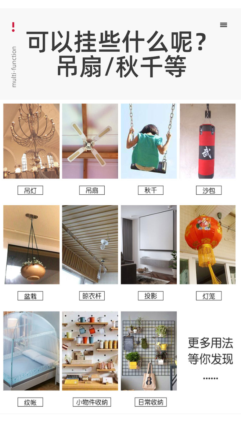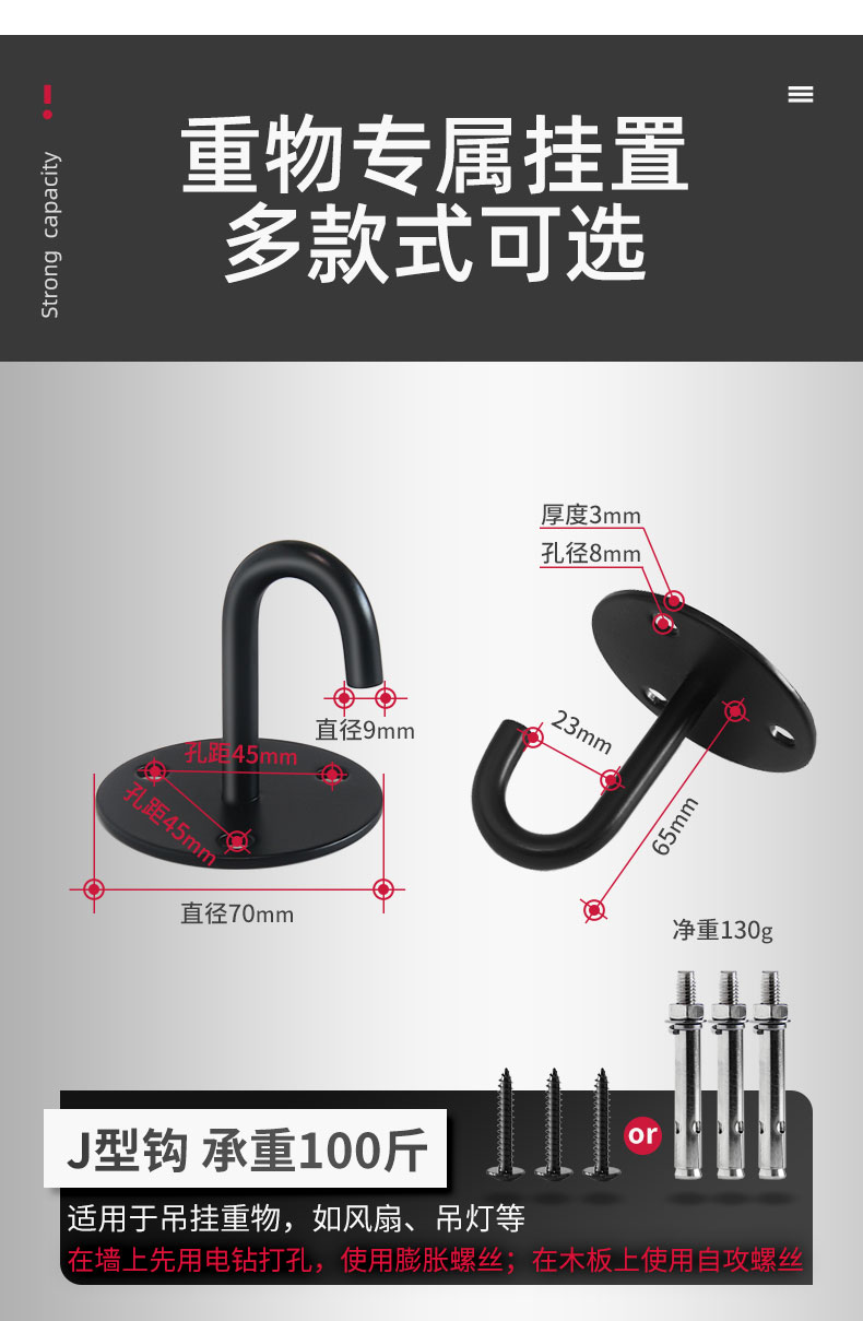 Kait langit-langit baja tahan karat hitam 6S untuk menggantung layar proyektor, lentera, kait gantung tugas berat di atas langit-langit.