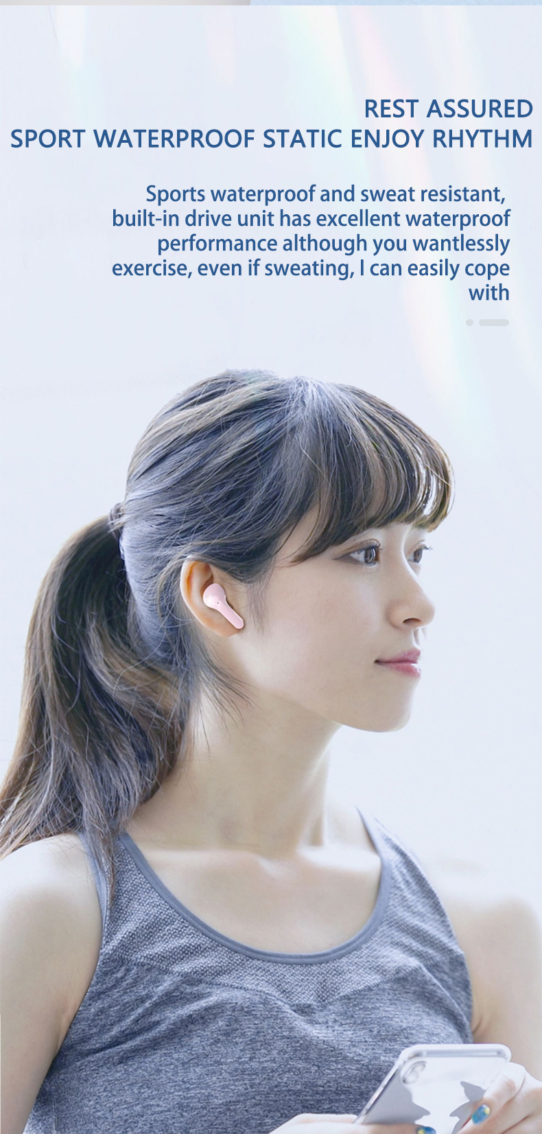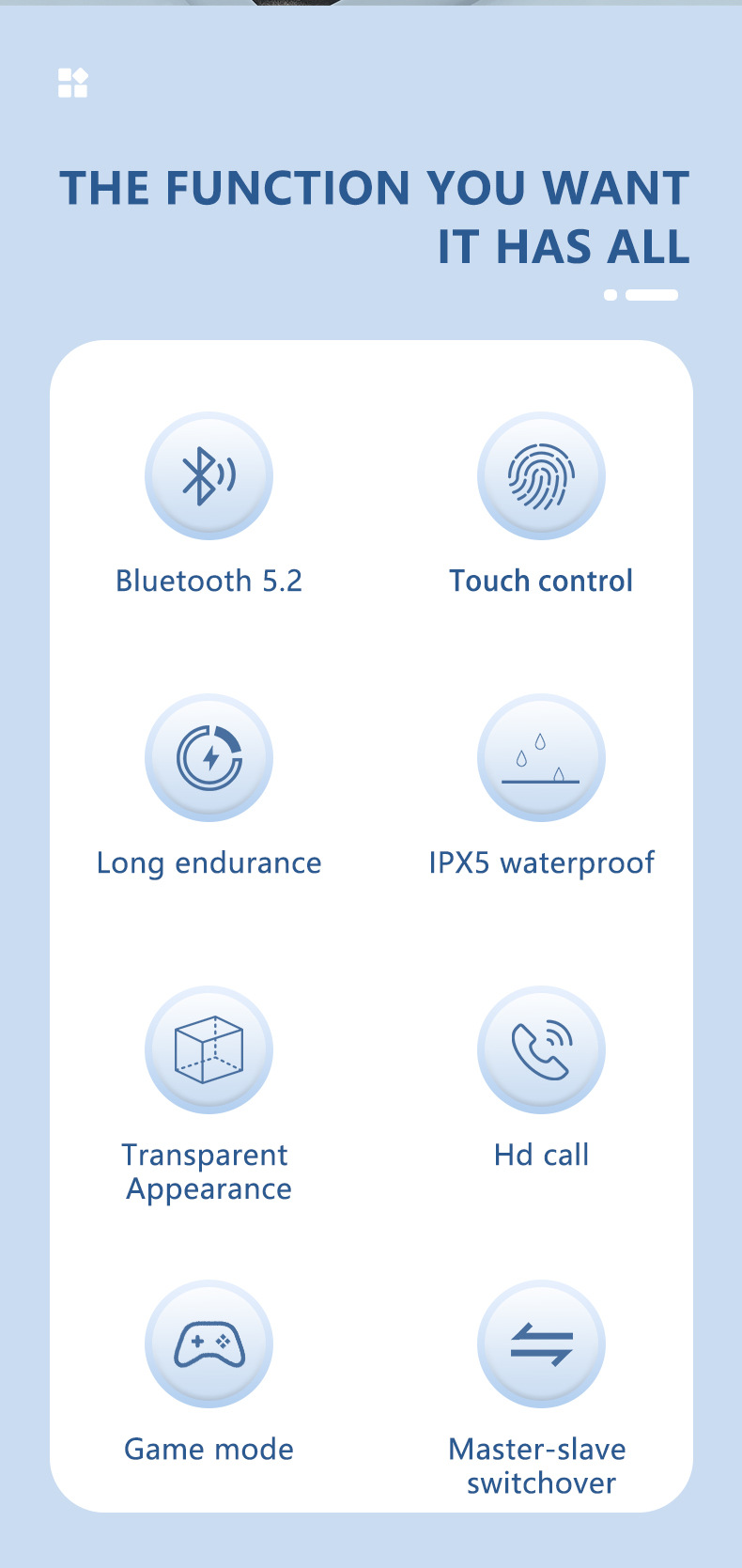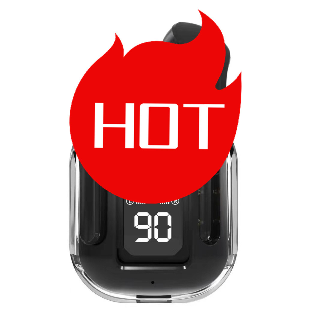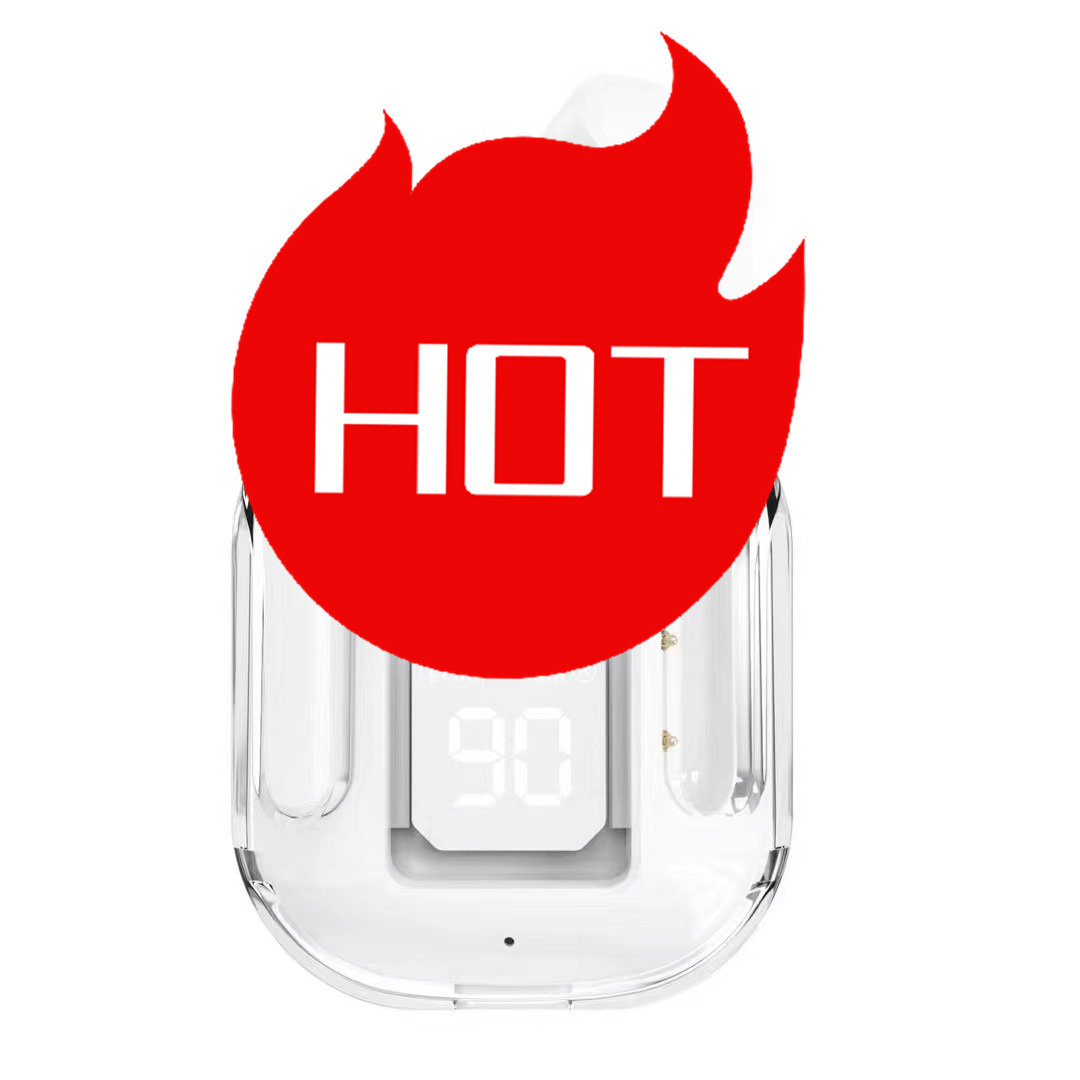 Earphone Bluetooth nirkabel TWS dengan tampilan digital transparan, earbud stereo in-ear kiri dan kanan, nirkabel sejati dengan konektivitas ganda.