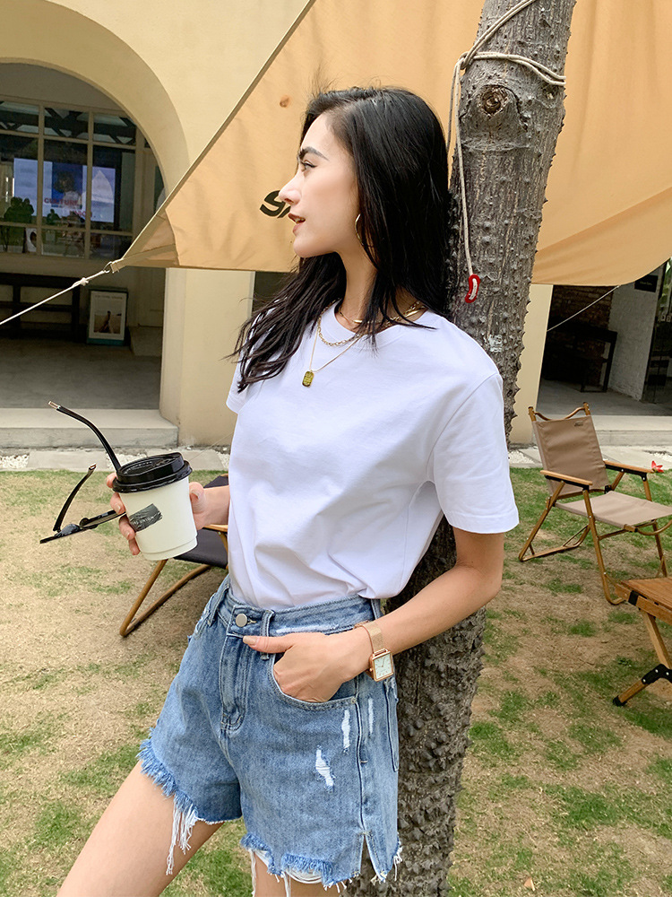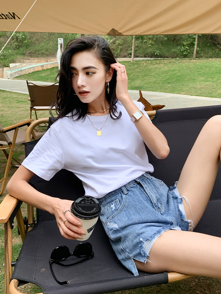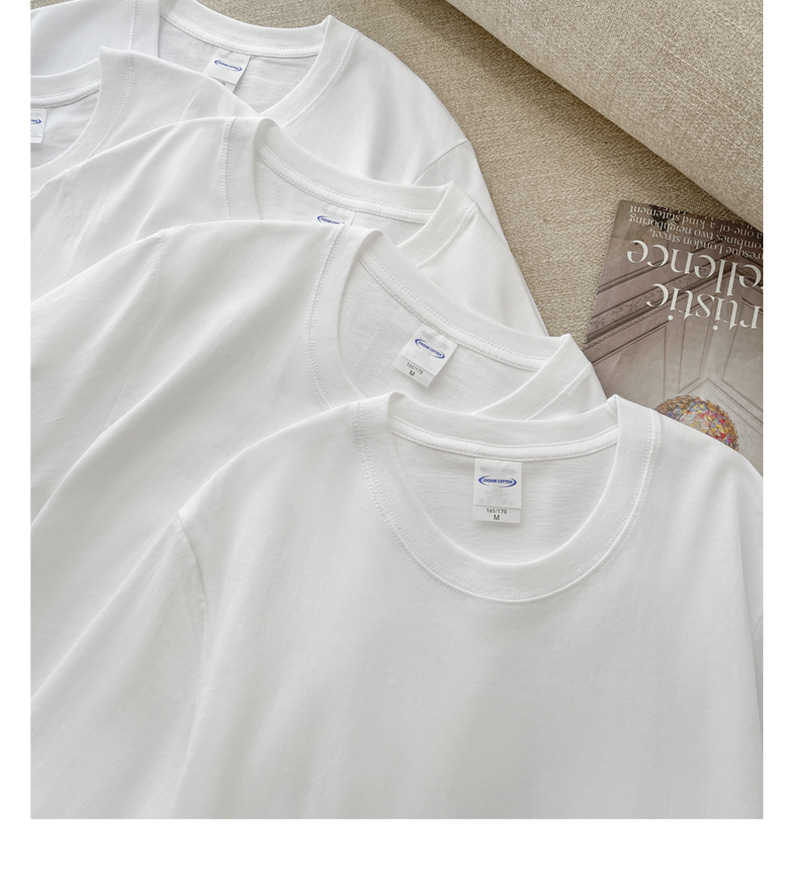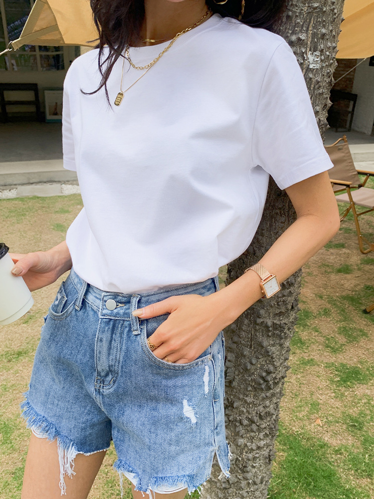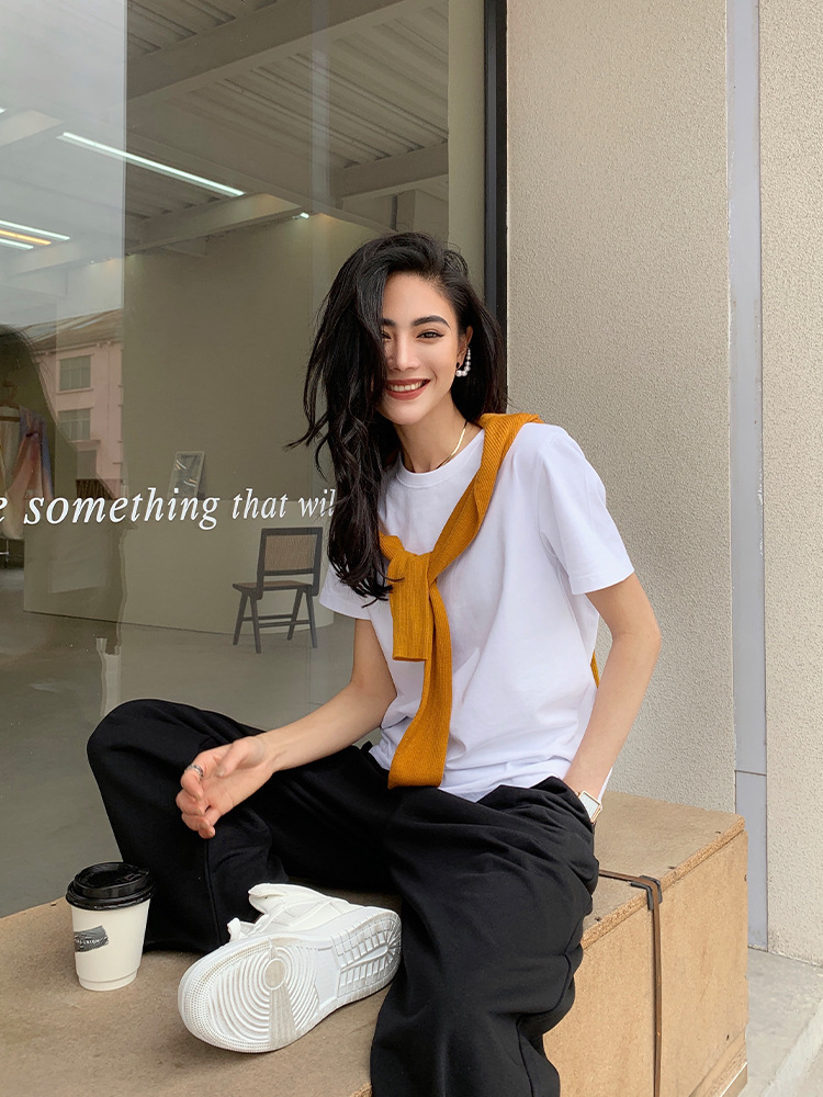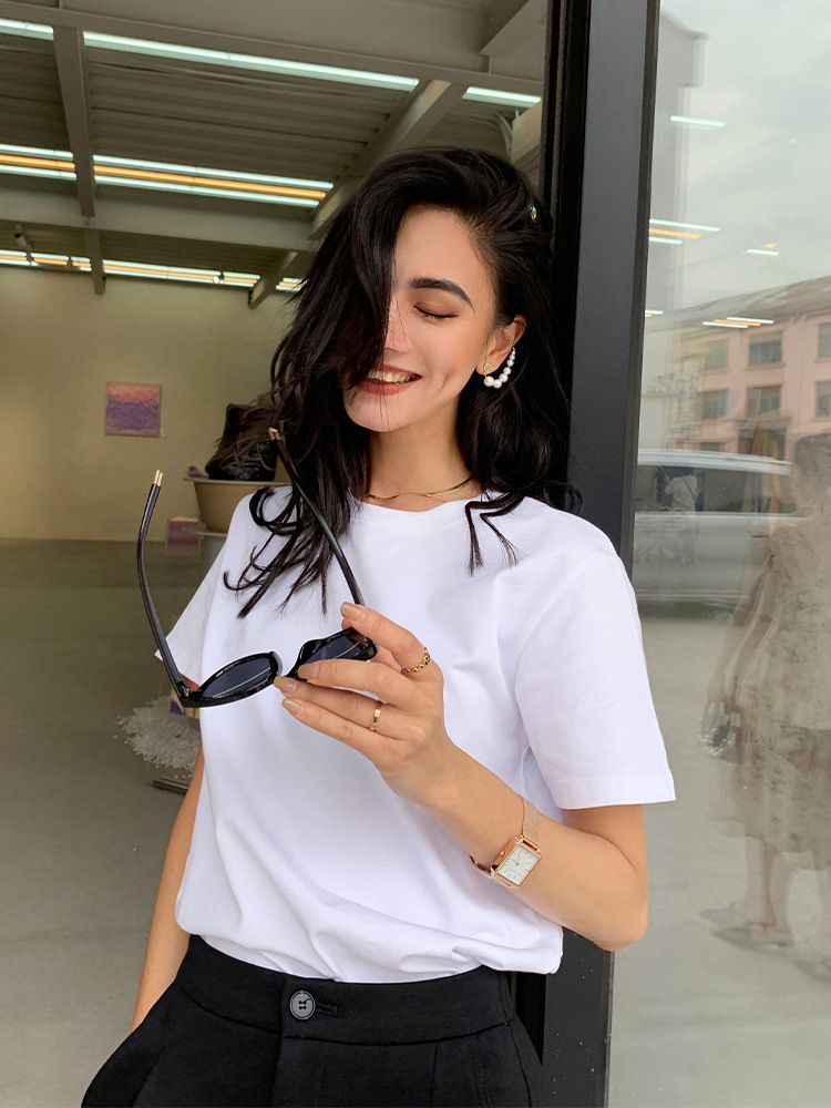 Kaos putih katun murni untuk wanita, bahu regular, gaya baru musim semi/musim panas 2026 ~ kemeja dasar lengan pendek warna solid, dapat dikenakan di luar, atasan lapisan dalam leher bulat