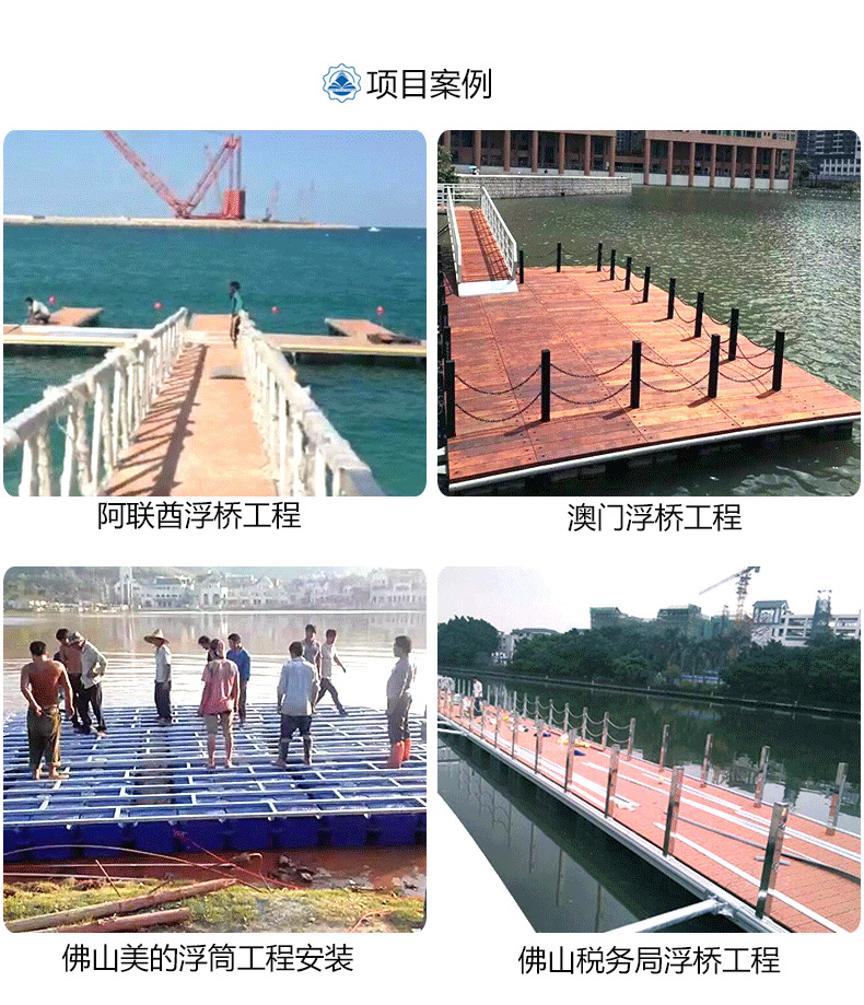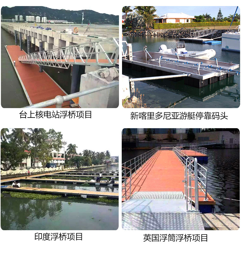 我司从事游艇码头项目开发,游艇码头的设计及施工,海洋工程材料的生产及出口的企业。涵盖的产品有引桥,浮桥,浮筒,浮箱,有专业的码头配件,水电设备,系泊设备,安全设备等等。