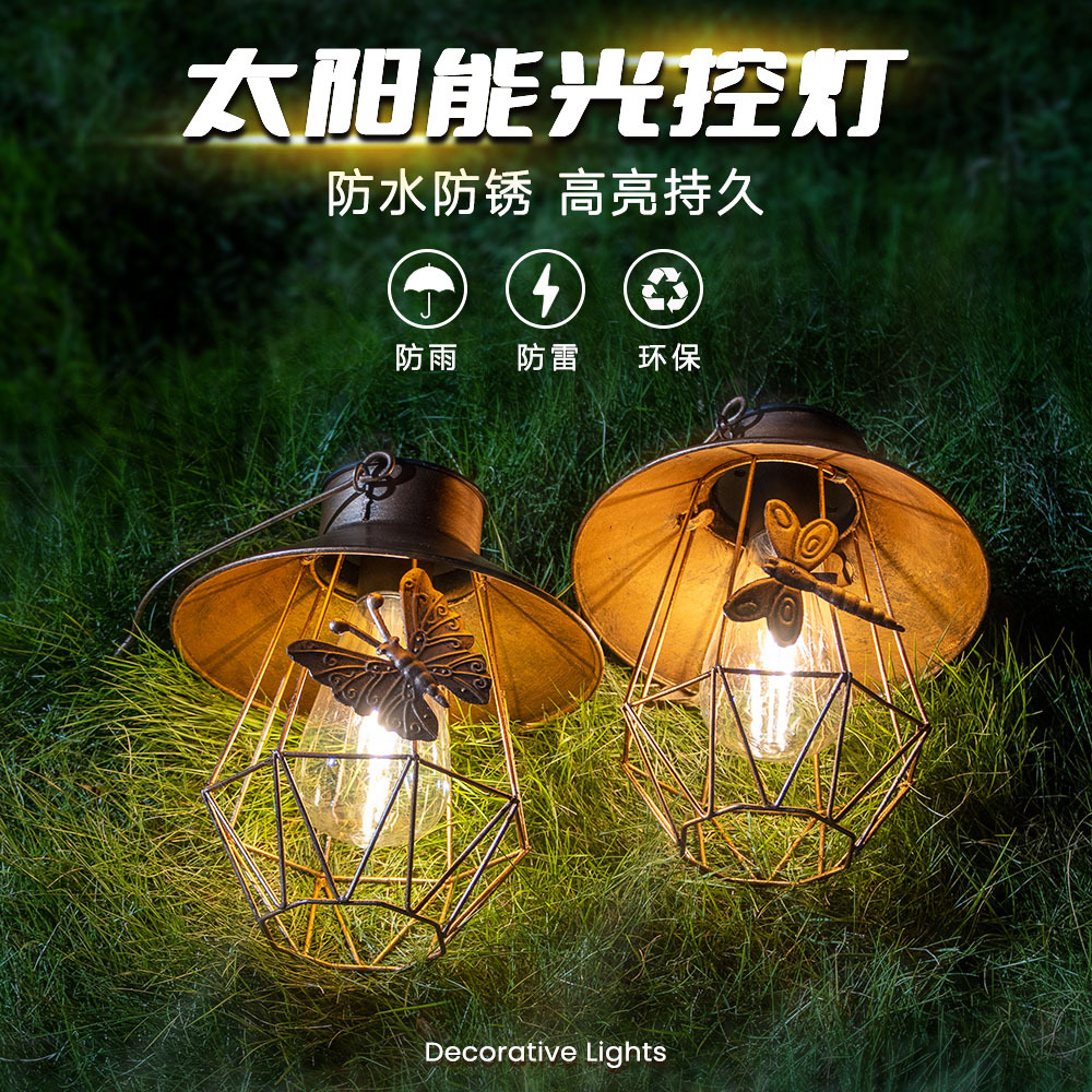 跨境新款现货太阳能复古铁艺灯高亮钨丝挂灯草坪庭院装饰LED灯笼