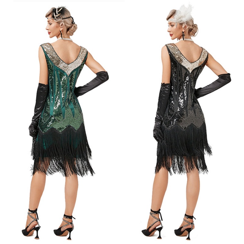Gaun rumbai kerah V 1920, kostum Gatsby retro Eropa dan Amerika, gaun manik-manik berpayet bola dansa Latin