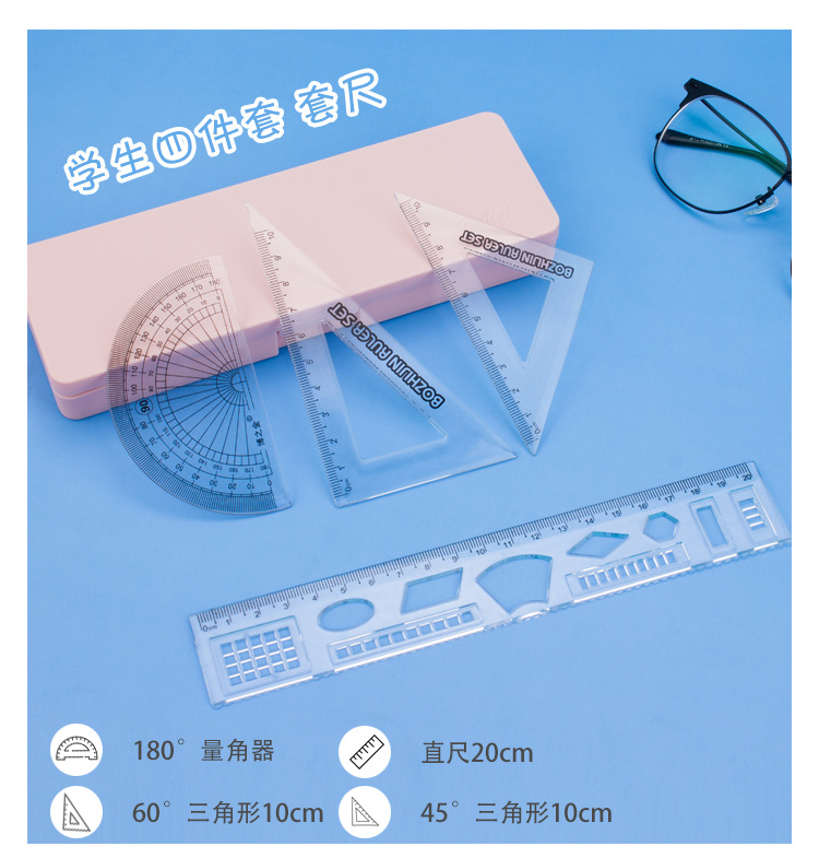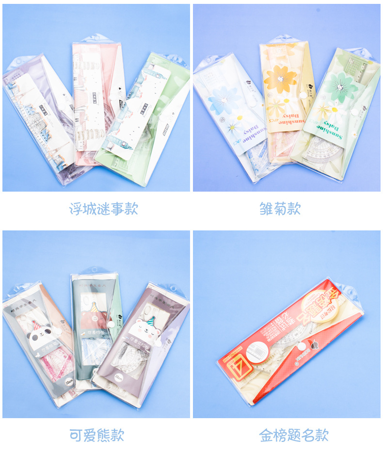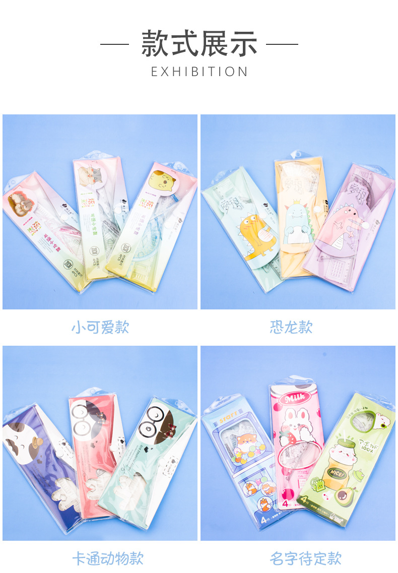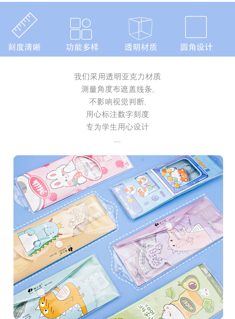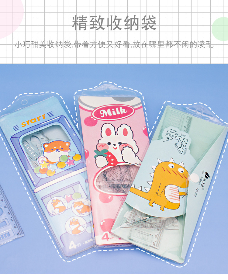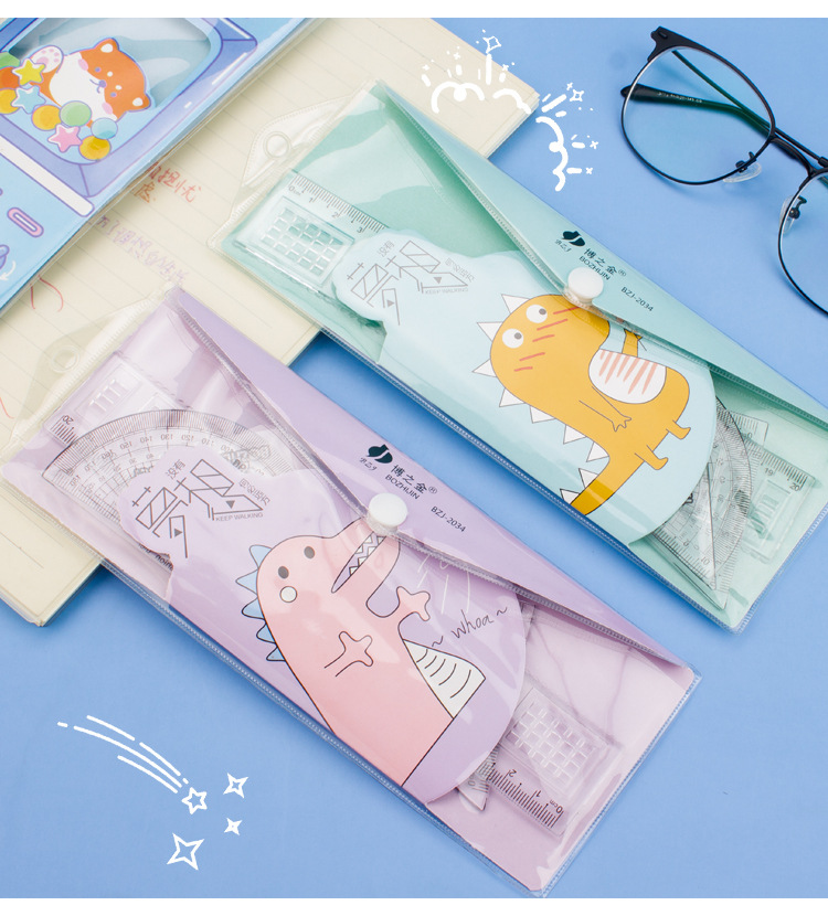 Penggaris setelan anak, perlengkapan alat tulis belajar kartun multifungsi, penggaris segitiga