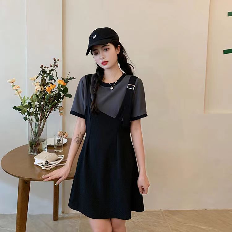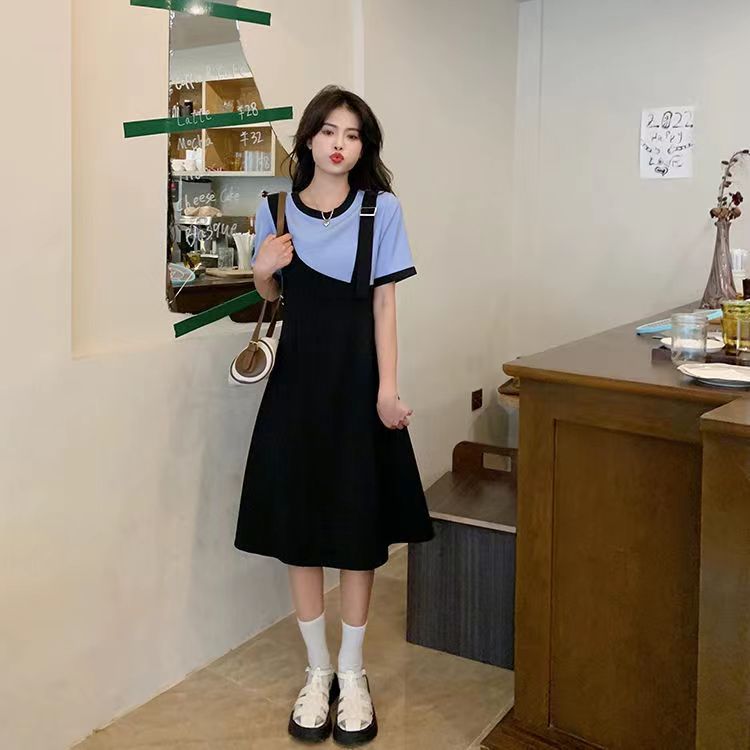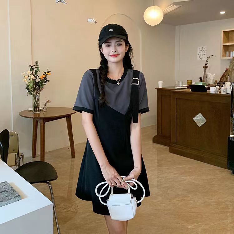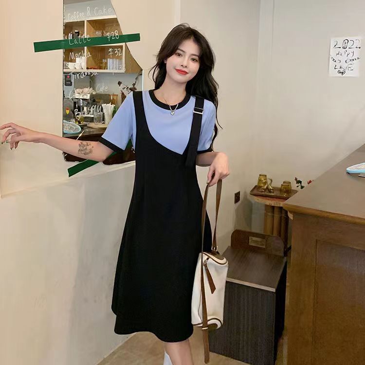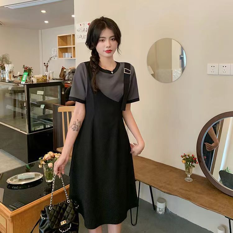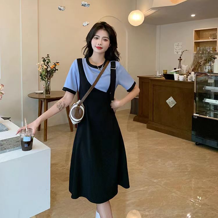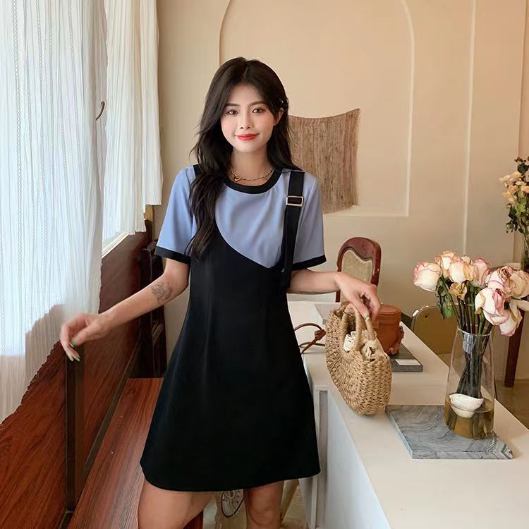 Gaun Musim Panas MM Gemuk Ukuran Plus Desain Ceruk Baru Jahitan Warna Kontras Rok Dua Potong Palsu Yang Menutupi Daging dan Terlihat Melangsingkan untuk Wanita
