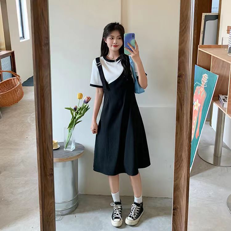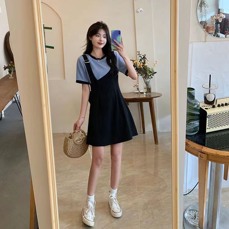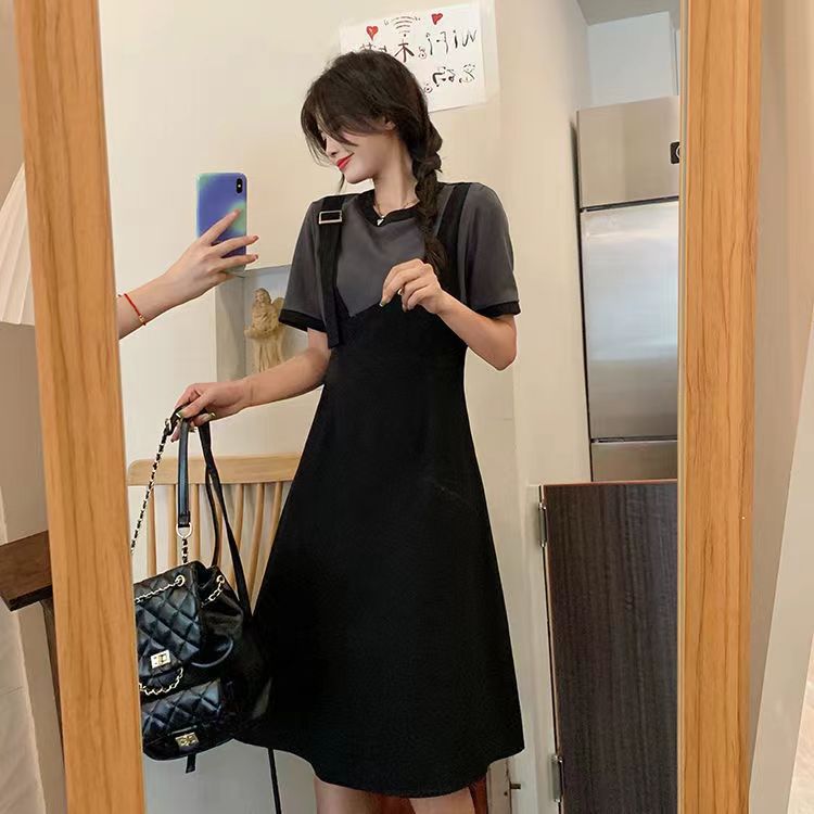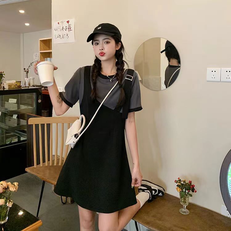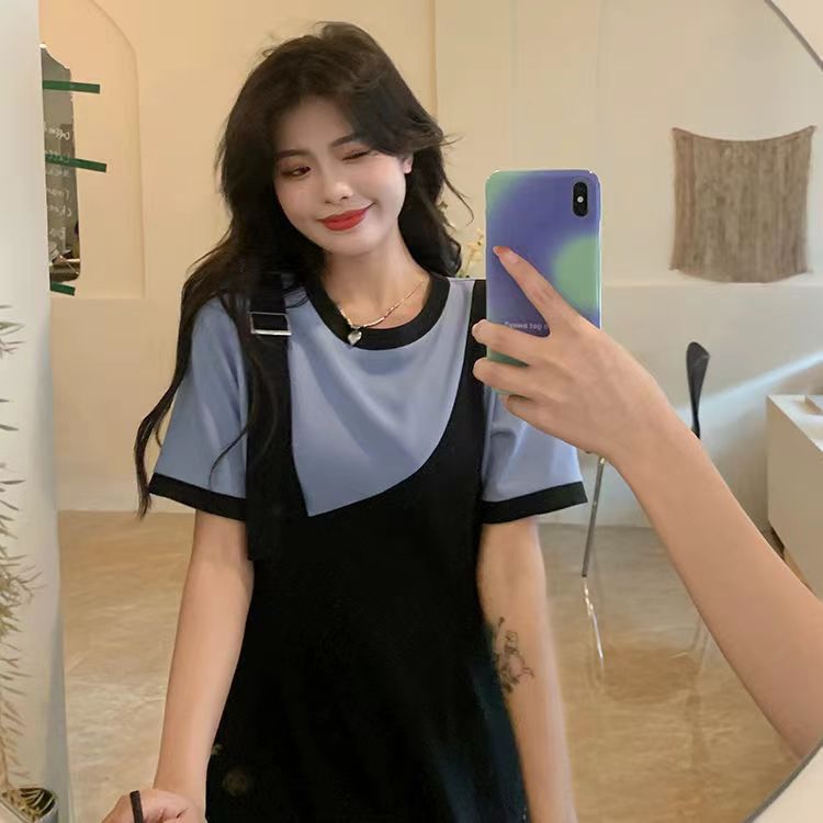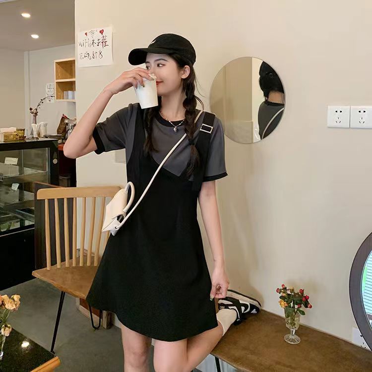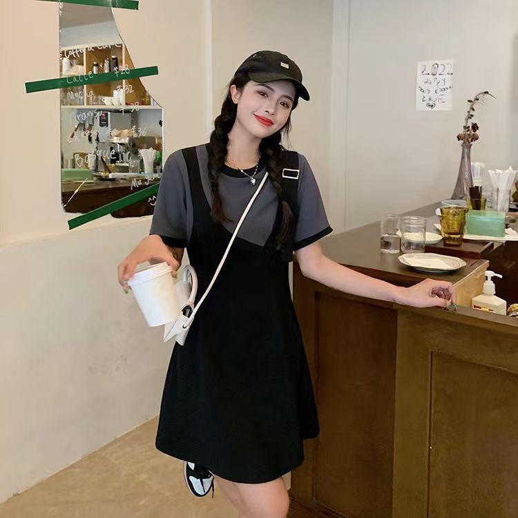Gaun Musim Panas MM Gemuk Ukuran Plus Desain Ceruk Baru Jahitan Warna Kontras Rok Dua Potong Palsu Yang Menutupi Daging dan Terlihat Melangsingkan untuk Wanita