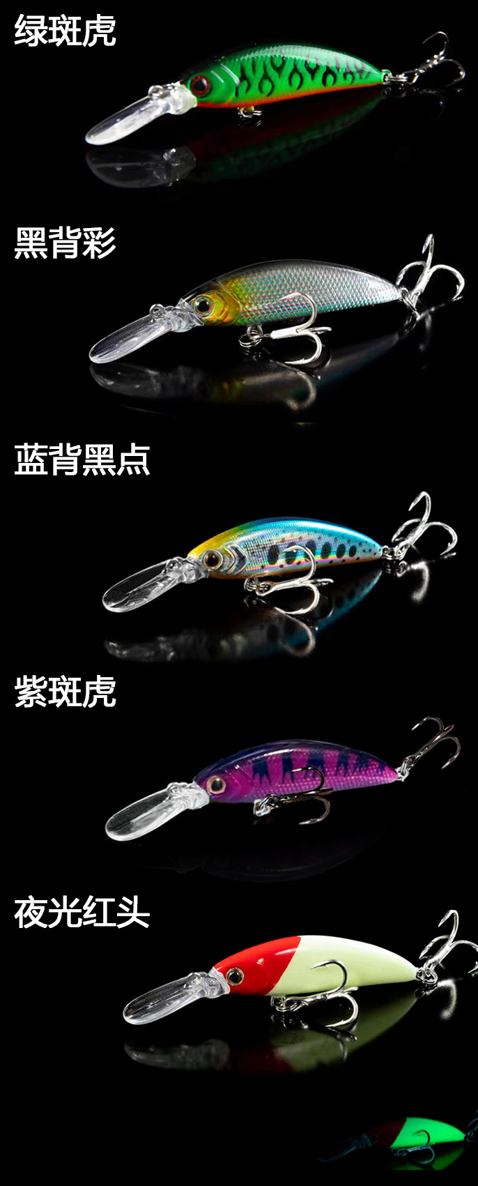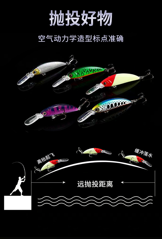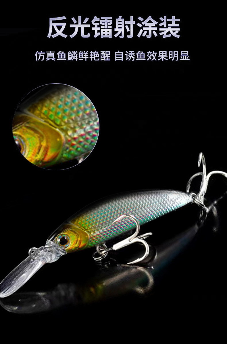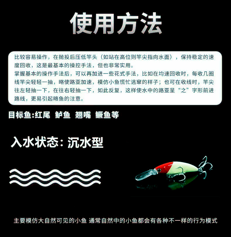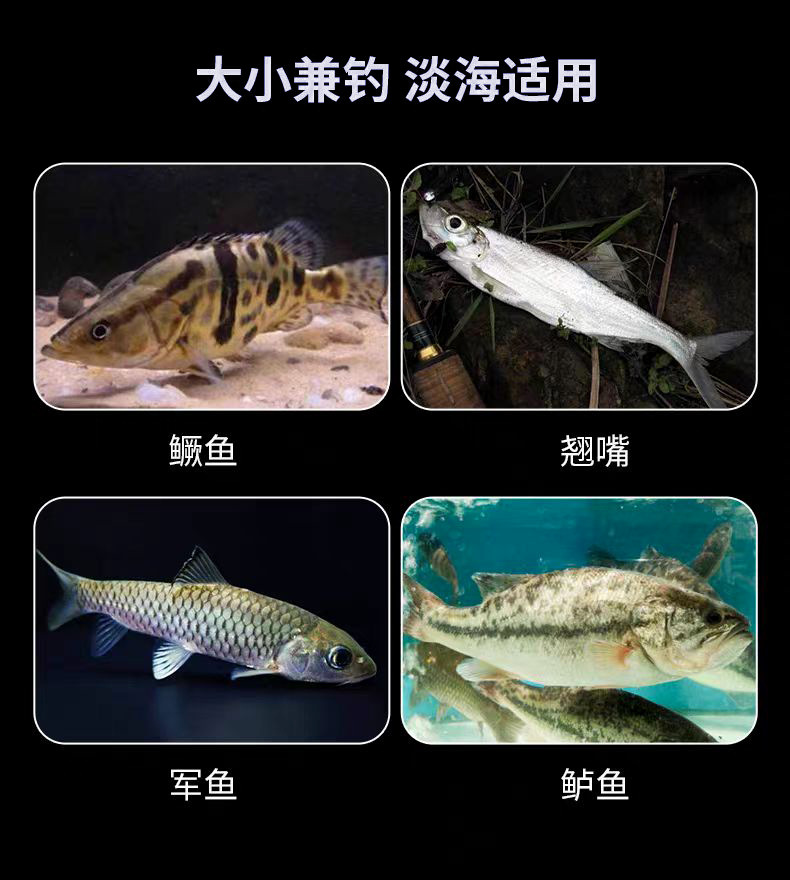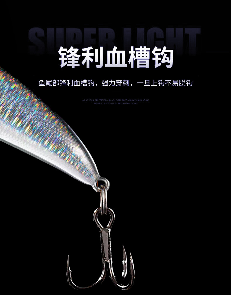 因图片背景是黑色,拍照时挂是白色鱼钩。产品实际配钩为黑色血槽钩,介意者慎拍。