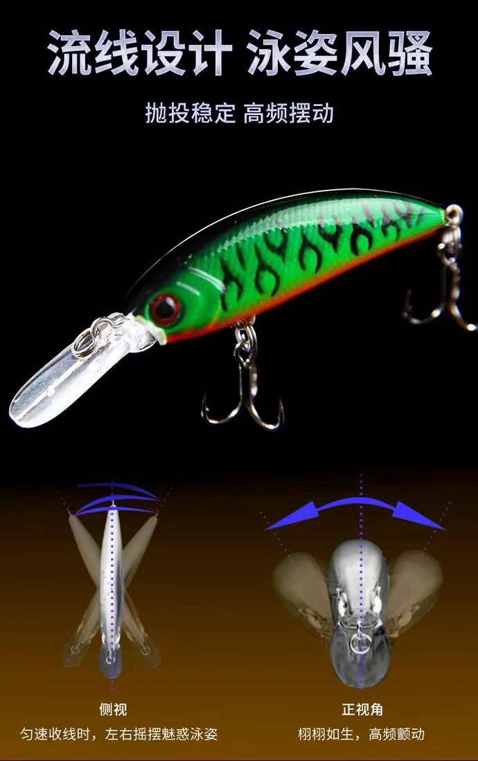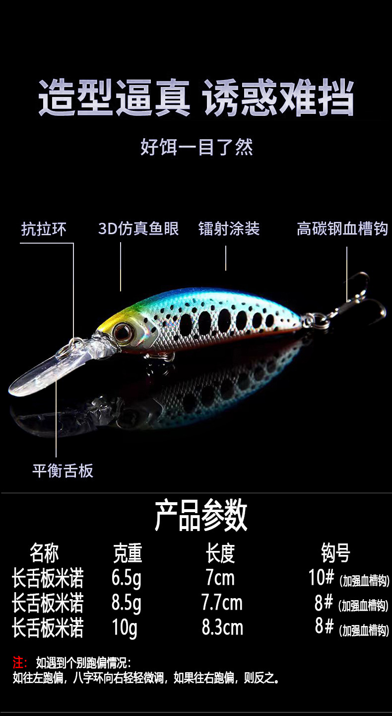 本款饵可能存在跑偏情况,但很容易解决,饵往哪边偏就将舌头圆环往另一边轻微调整就行。视频有介绍怎么调整。