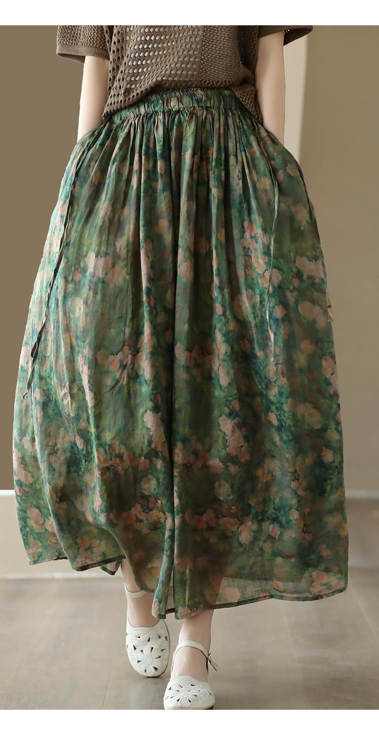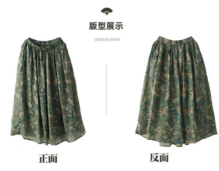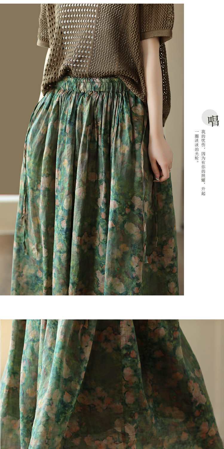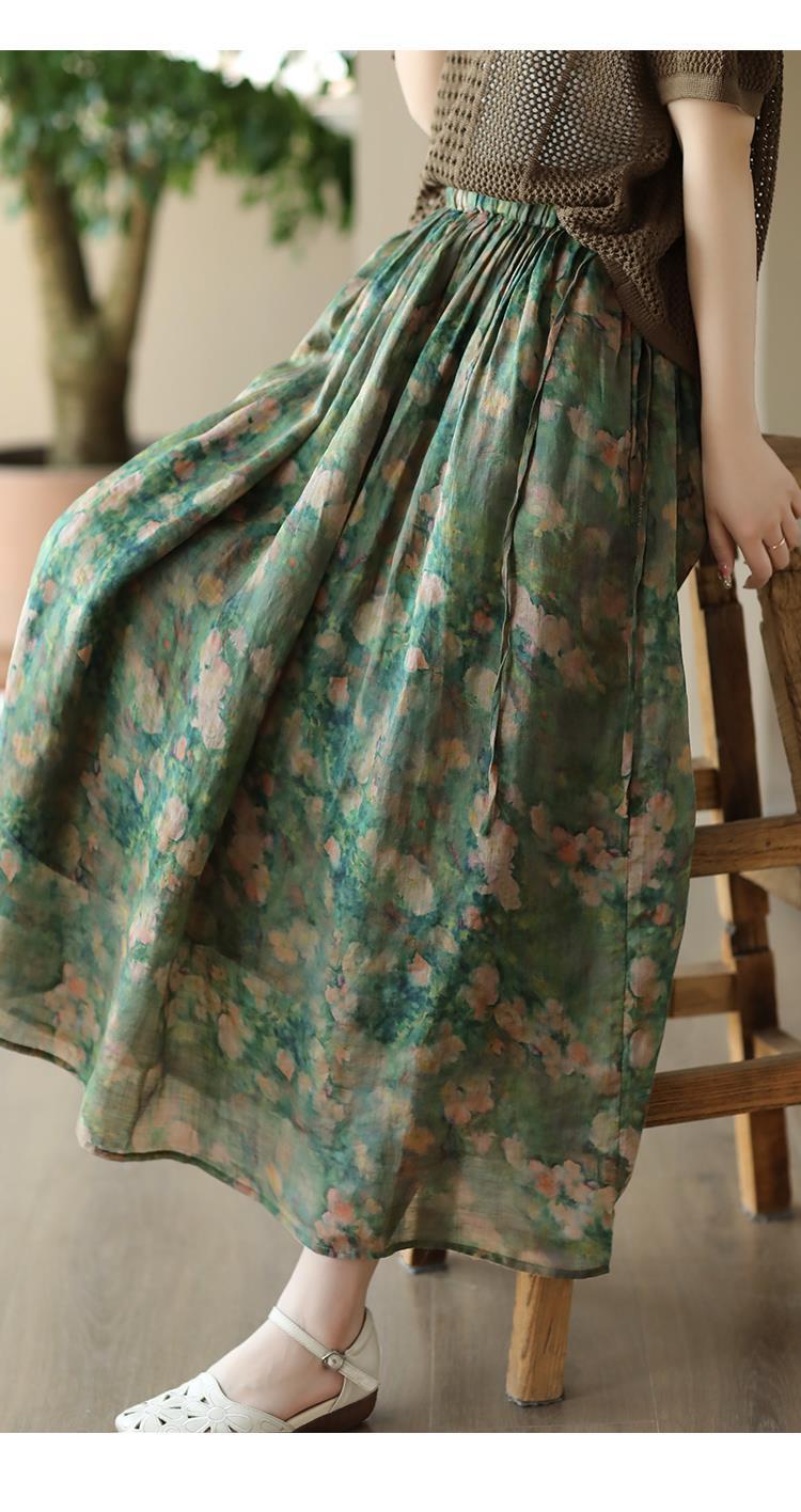 Rok Midi Katun Linen Motif Bunga Bordir Tebal Musim Panas 2023, Rok A-Line Motif Bunga Vintage untuk Wanita