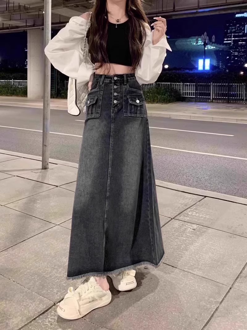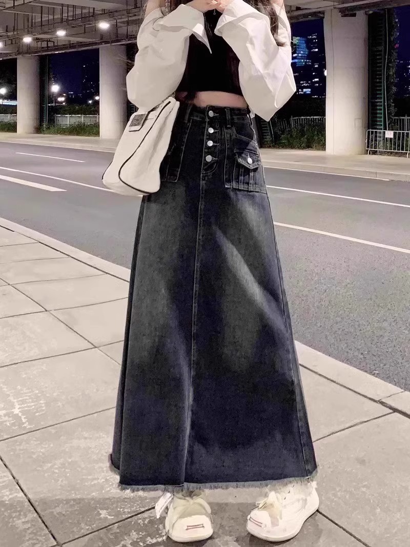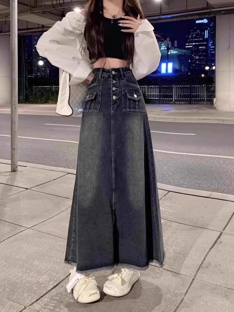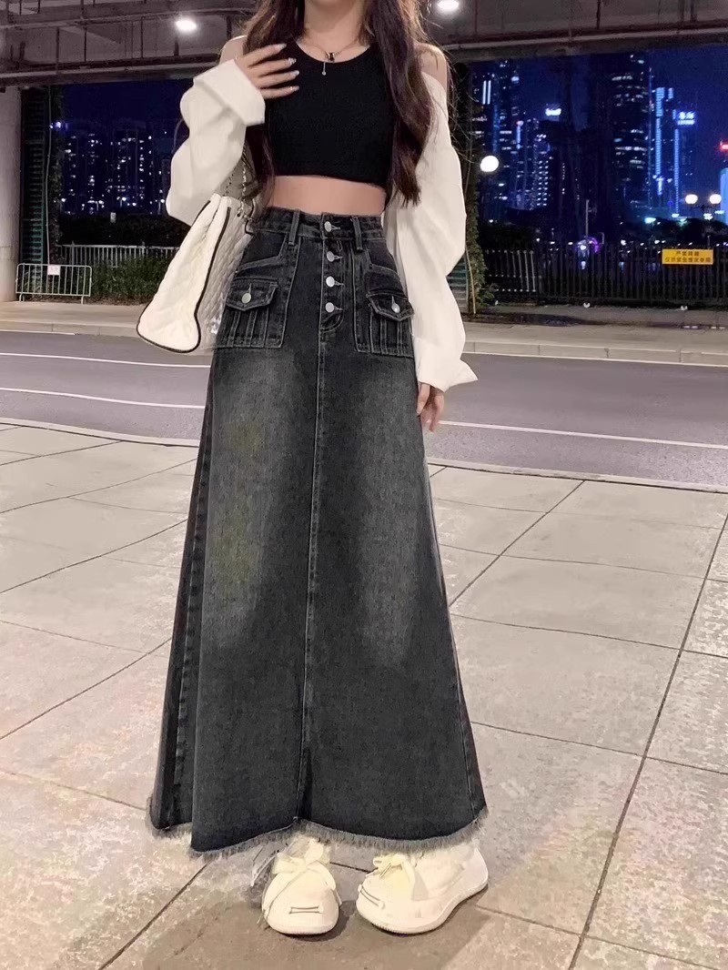 Rok Denim bergaya Amerika untuk wanita, rok Denim bergaya retro pinggang tinggi ukuran ekstra besar, rok payung panjang setengah berjumbai
