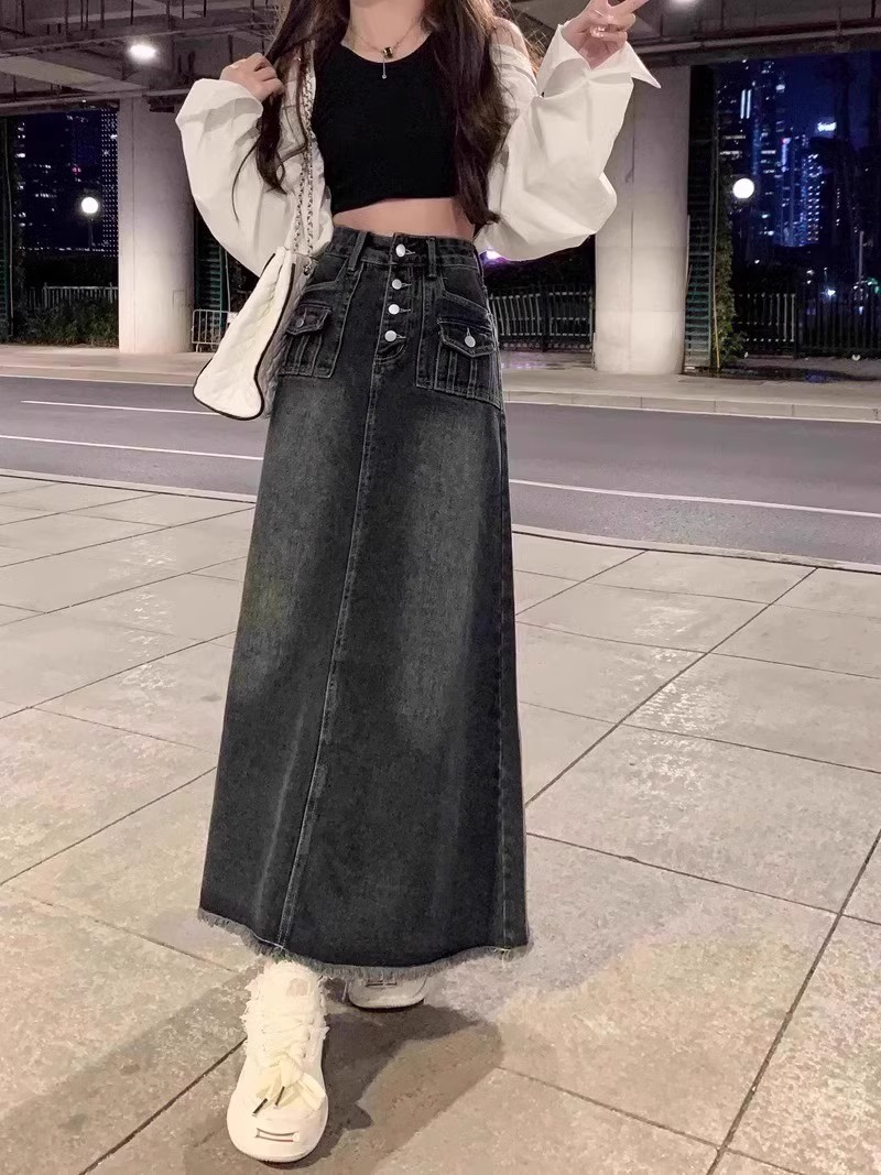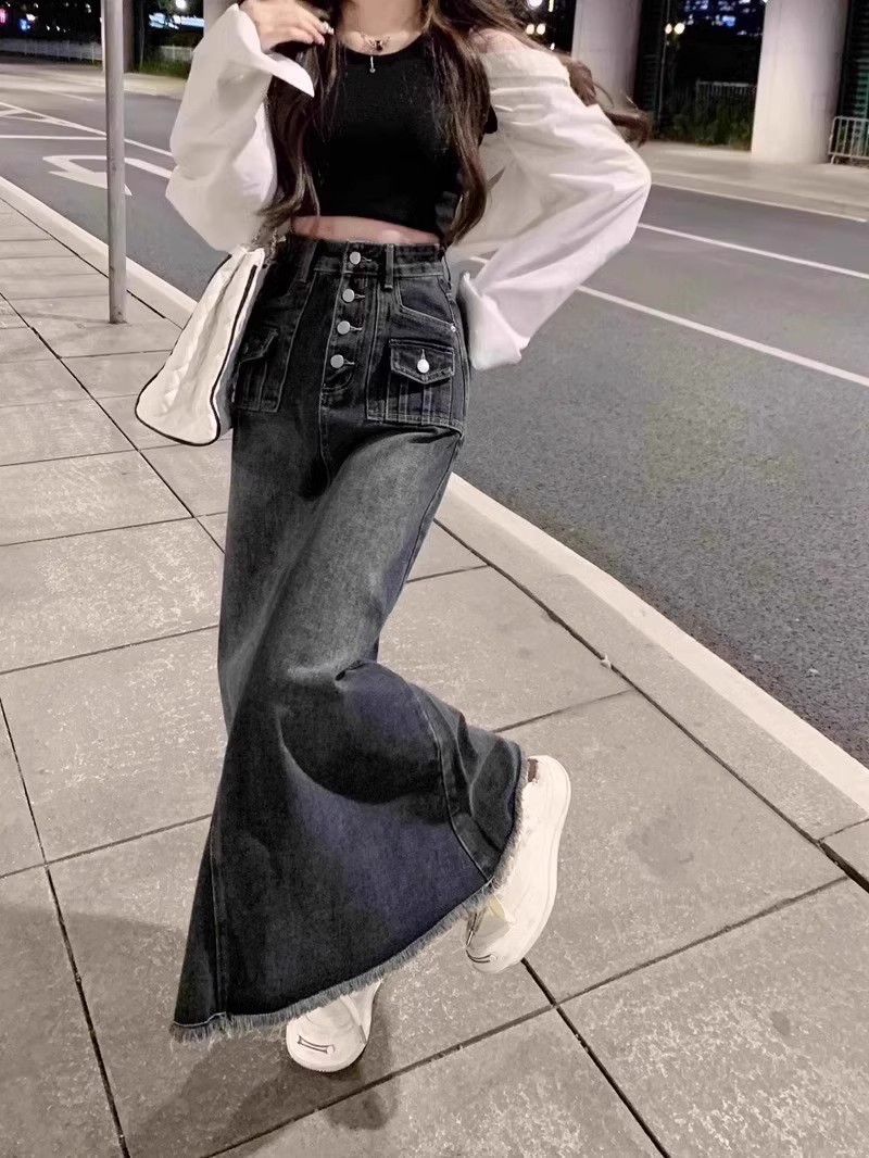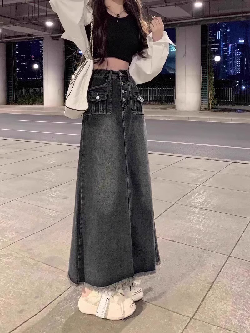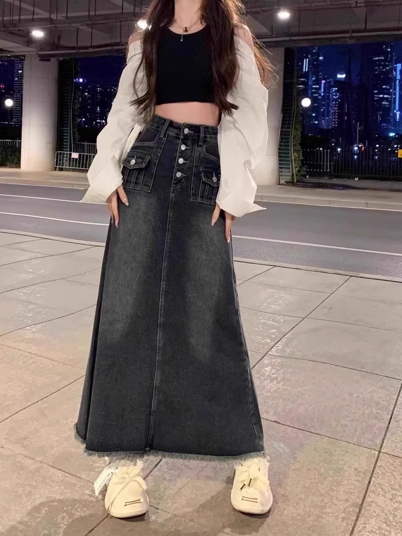 Rok Denim bergaya Amerika untuk wanita, rok Denim bergaya retro pinggang tinggi ukuran ekstra besar, rok payung panjang setengah berjumbai