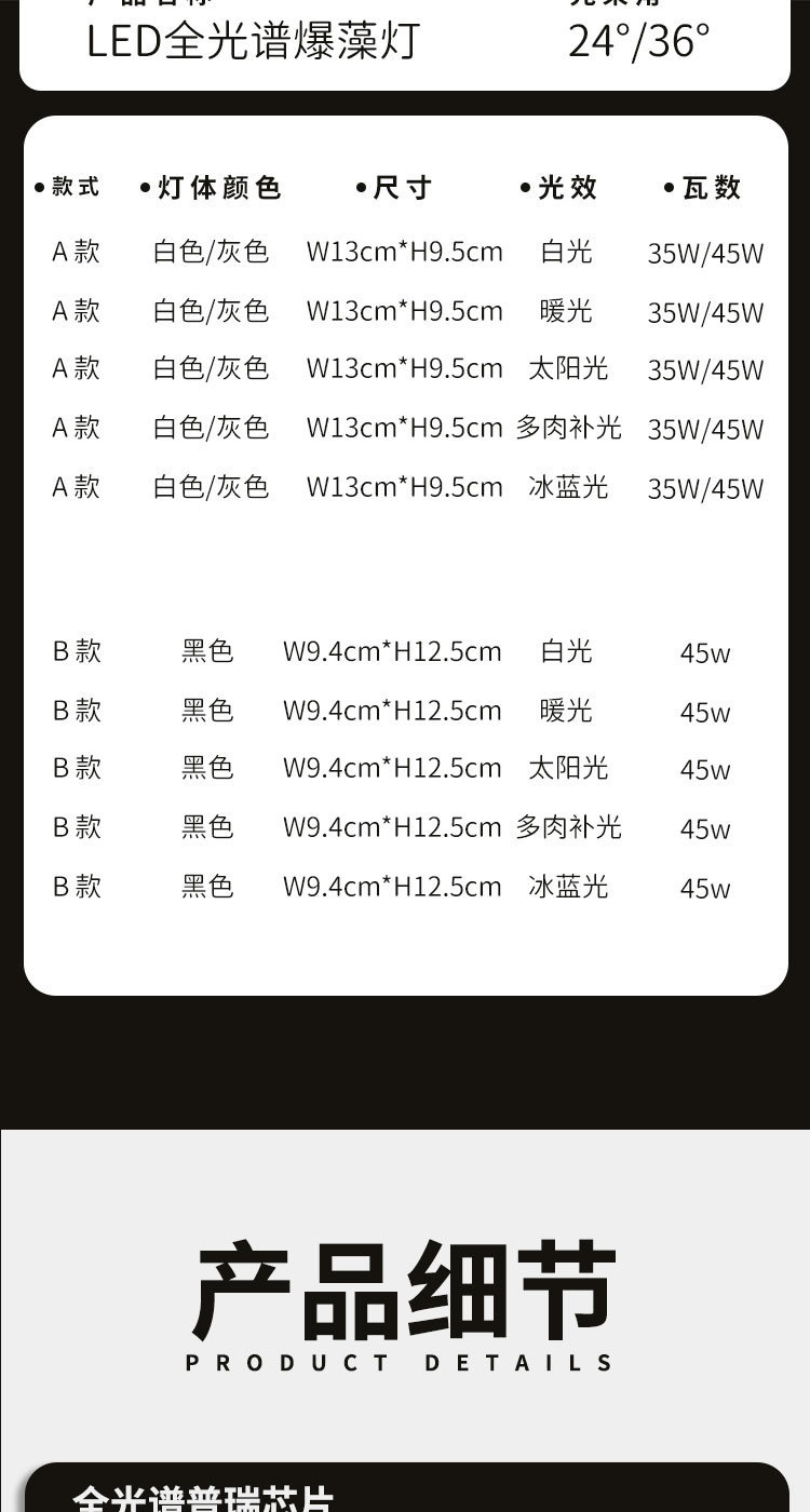 工厂为源头工厂,可以大量拿货、支持品牌打标,也可以一件代发。支持定制光谱类型(爆藻类,绿植类,兰科类,多肉类等多种光谱)