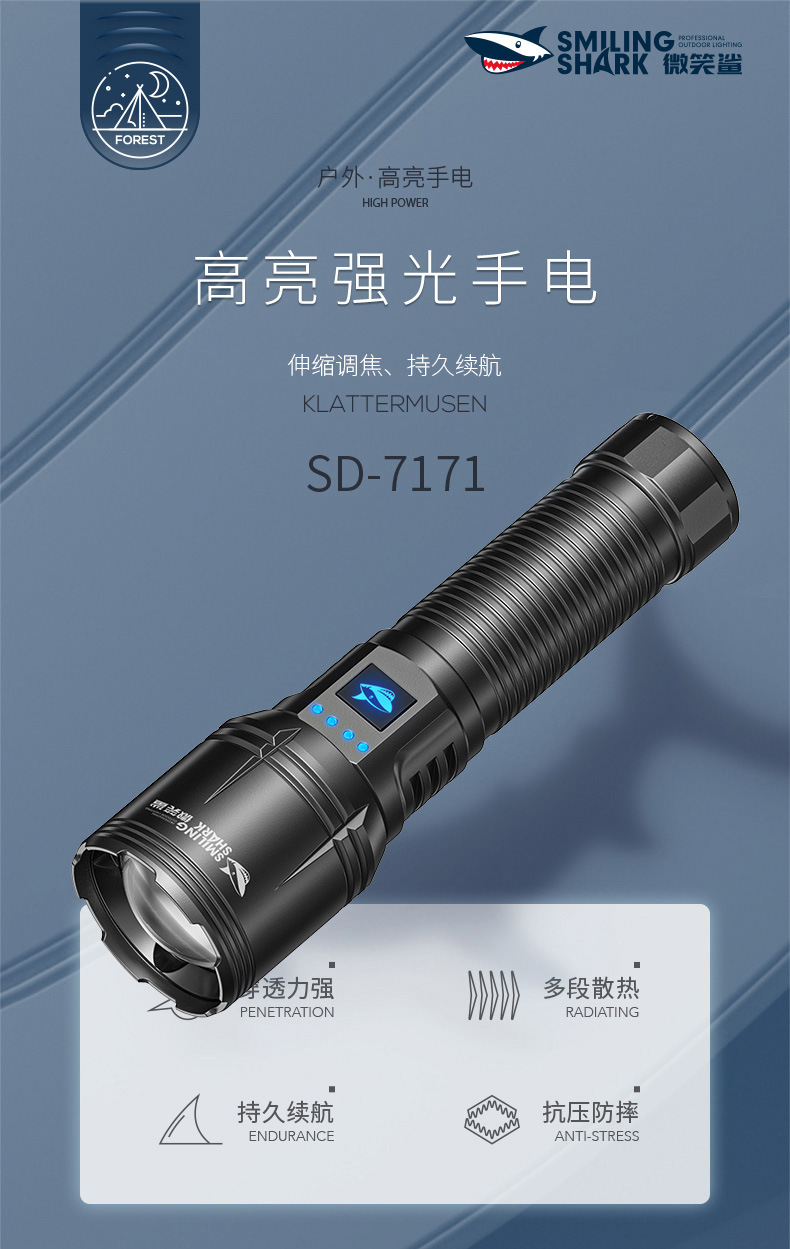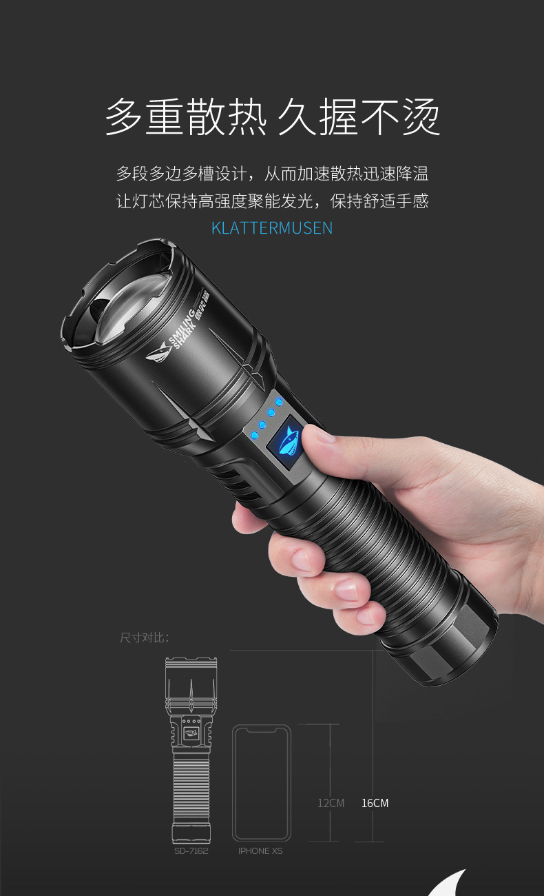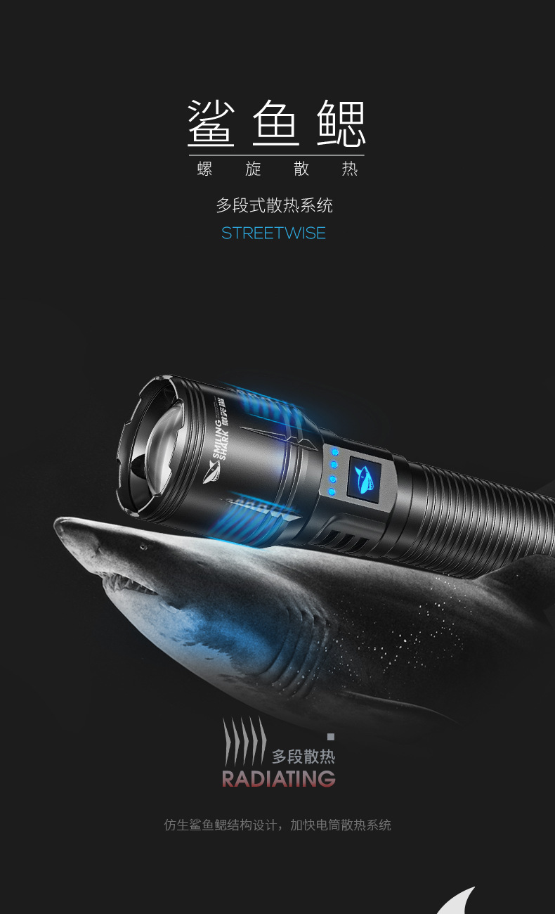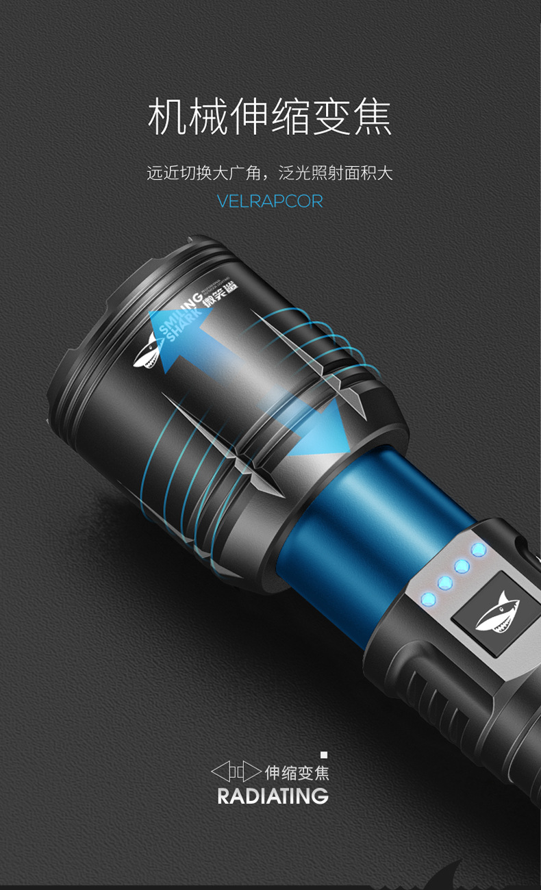 Senter Listrik Zoomable Hiu Tersenyum Senter Jarak Jauh Kecerahan Tinggi Senter Paduan Aluminium