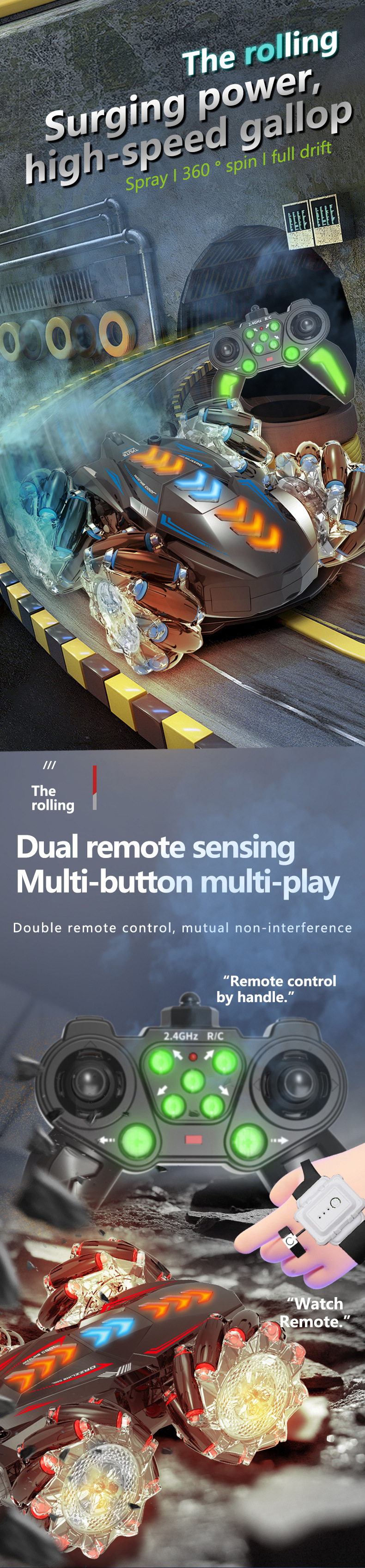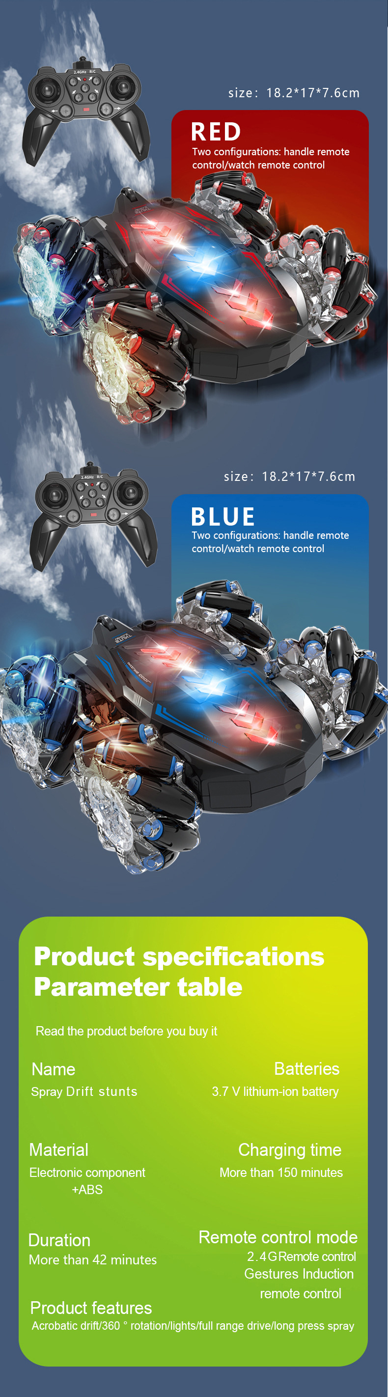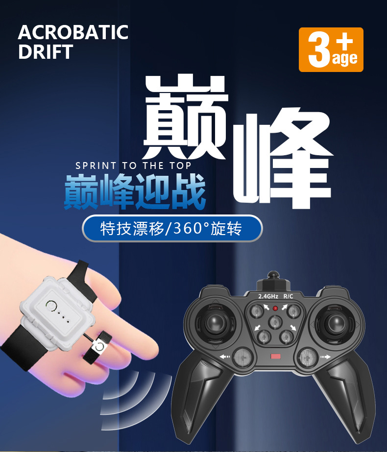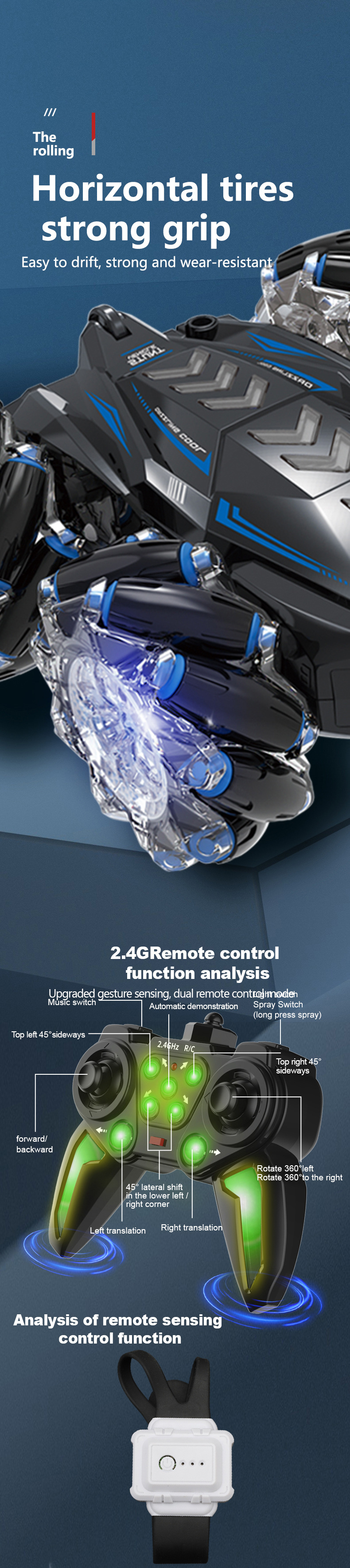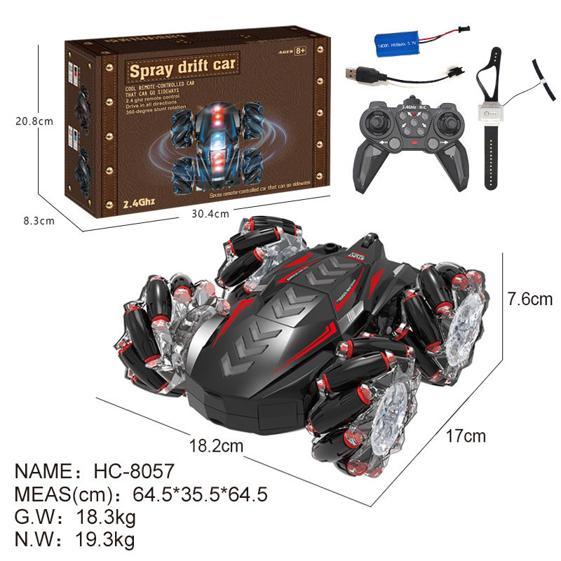 大尺寸,尾部双喷雾,双面跑马灯,轮胎内侧有灯光,有音乐(灯光音乐可关闭)发光遥控器,手势操控。