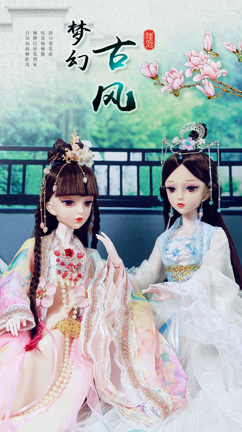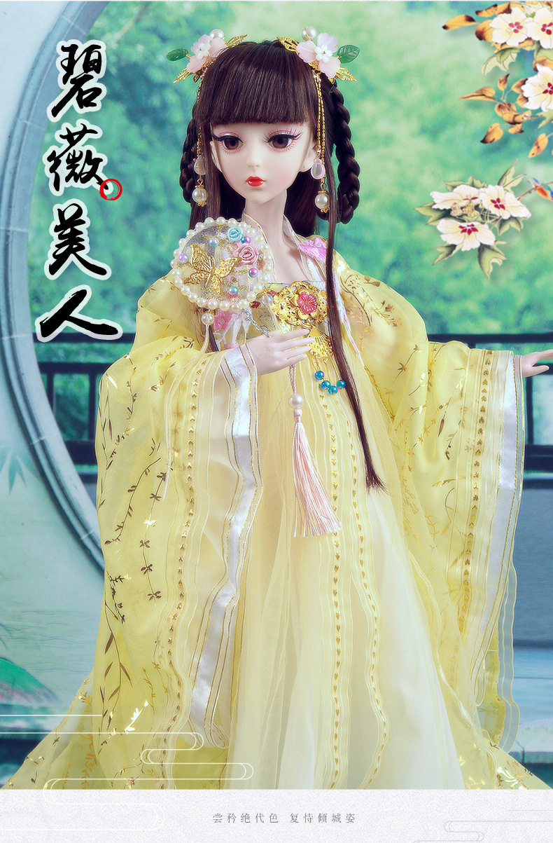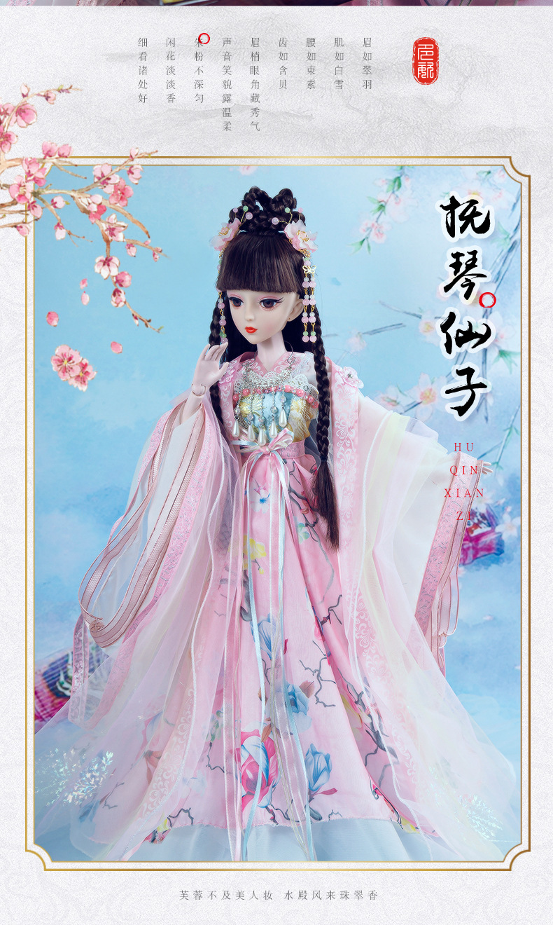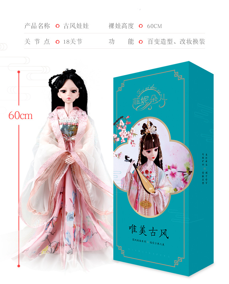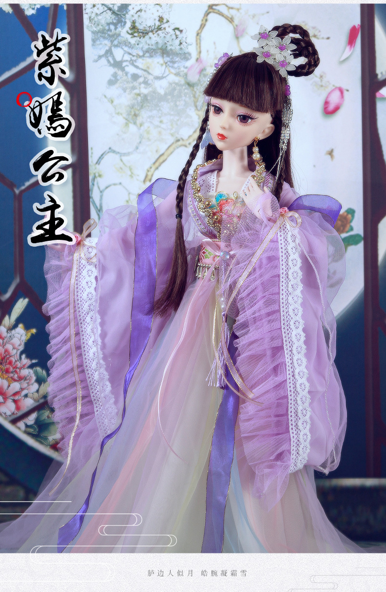 Boneka kostum kuno realistis 60cm lintas batas, mainan anak-anak Hanfu gaya kuno, set boneka putri perempuan.