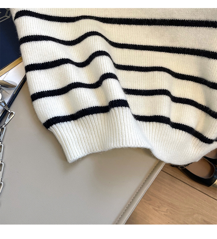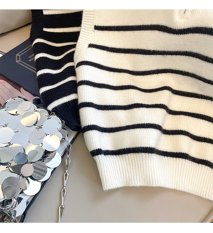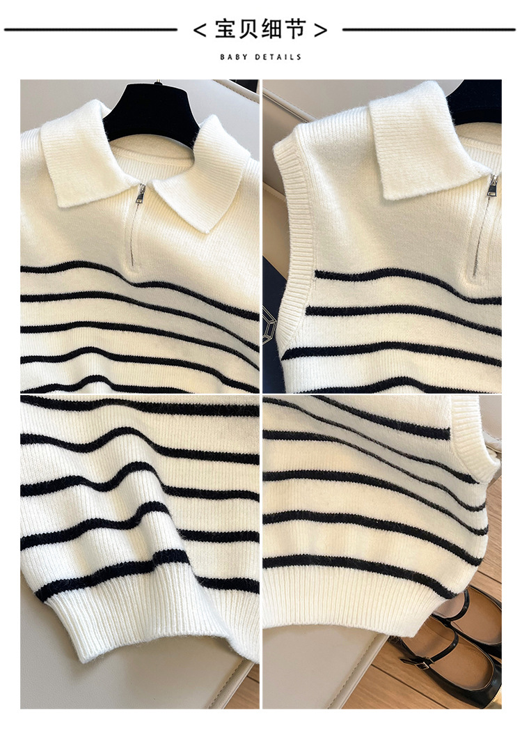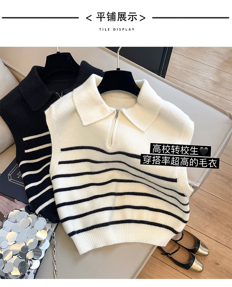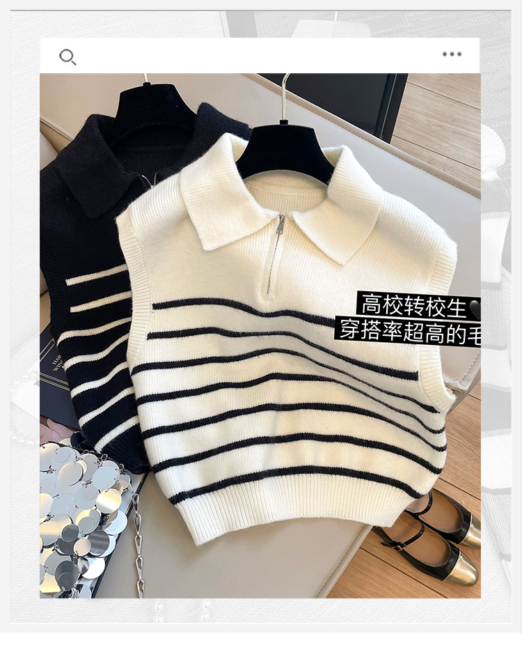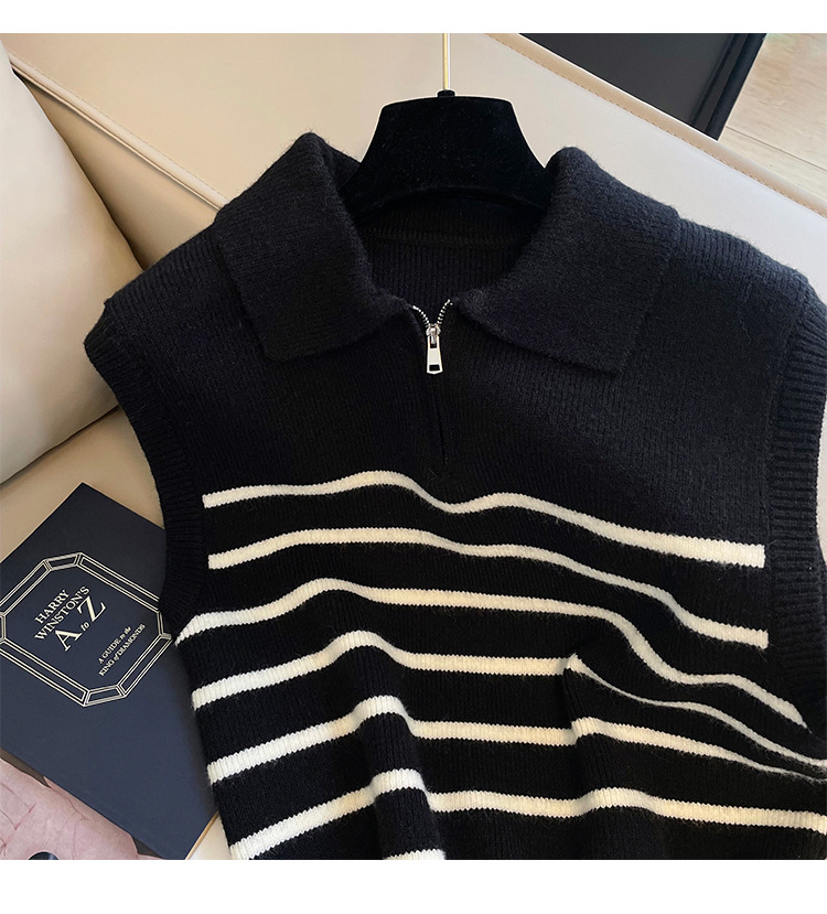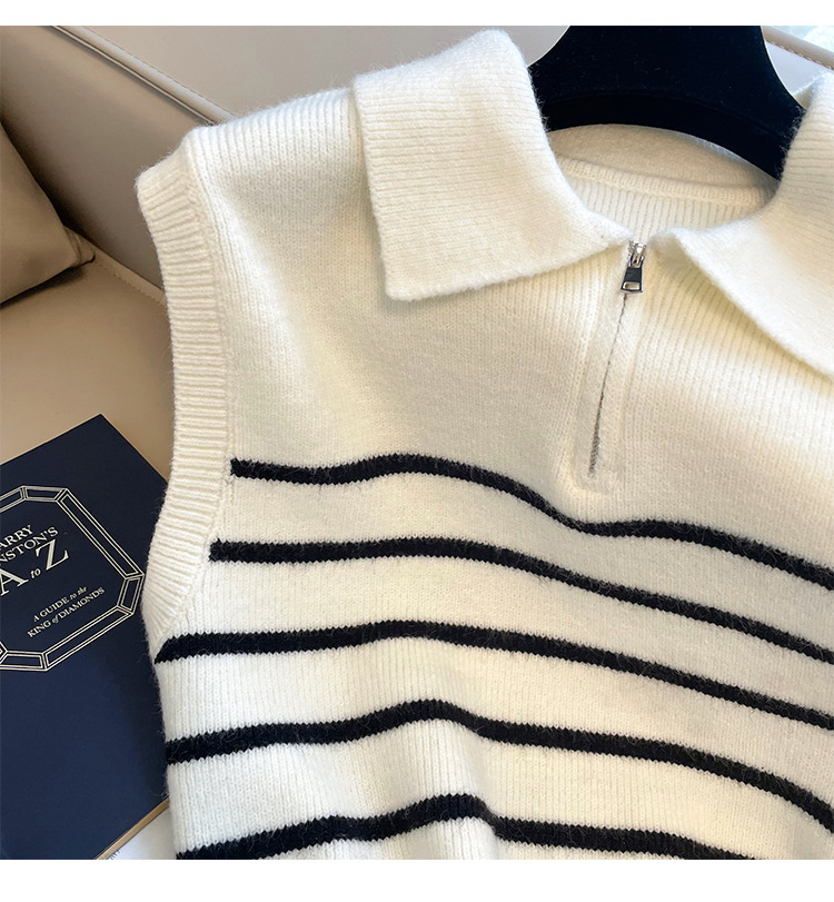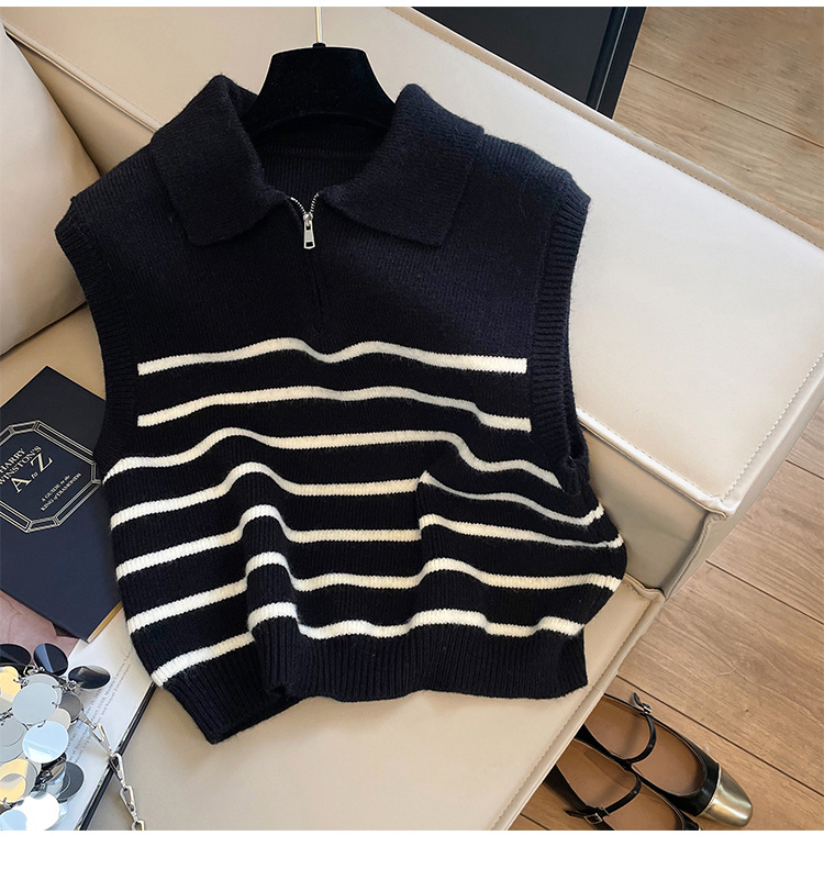 Sweater rompi rajutan bergaris ritsleting kerah retro gaya Korea untuk wanita di musim gugur dan musim dingin, atasan rompi elegan untuk wanita