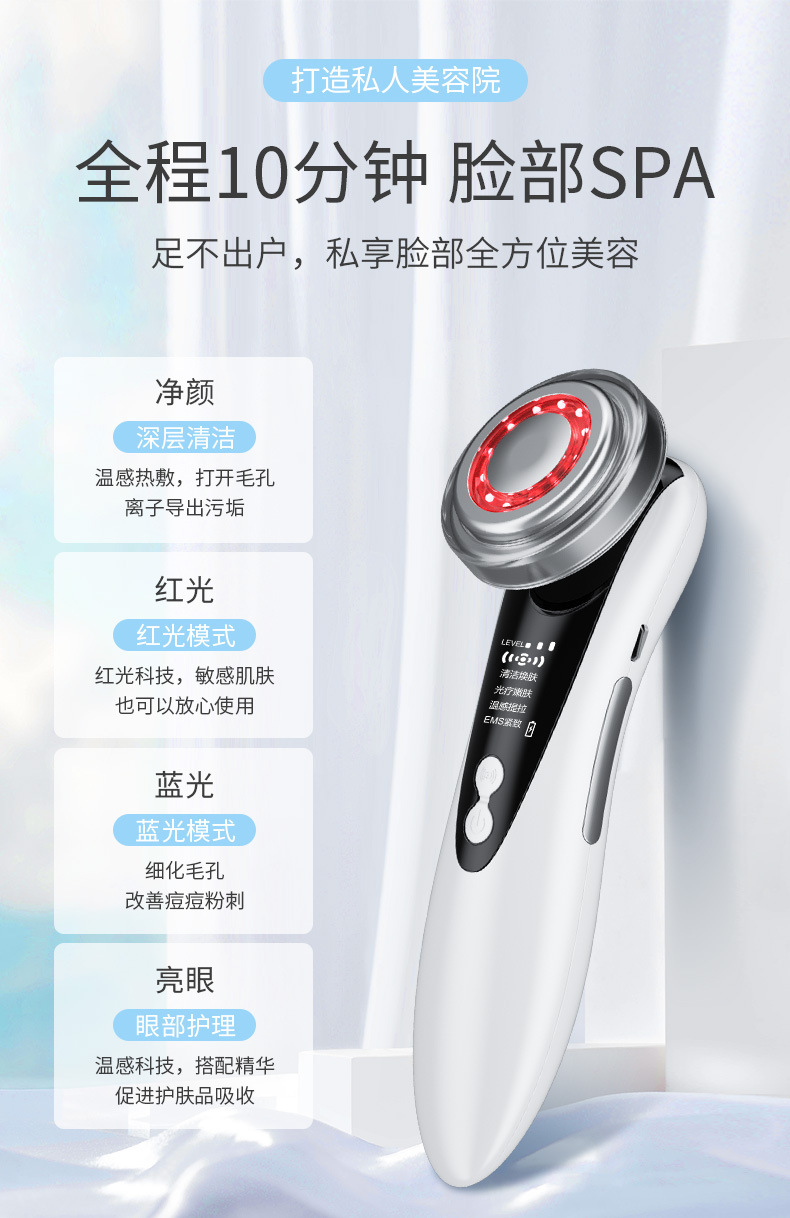 Perangkat kecantikan portabel untuk penggunaan di rumah, untuk peremajaan wajah, terapi cahaya wajah, pijat, pengencangan, dan pemutihan.