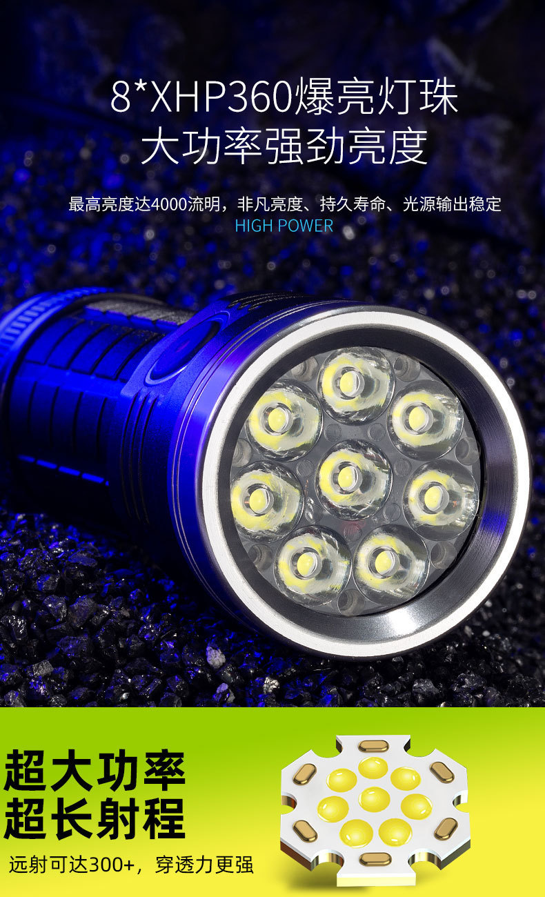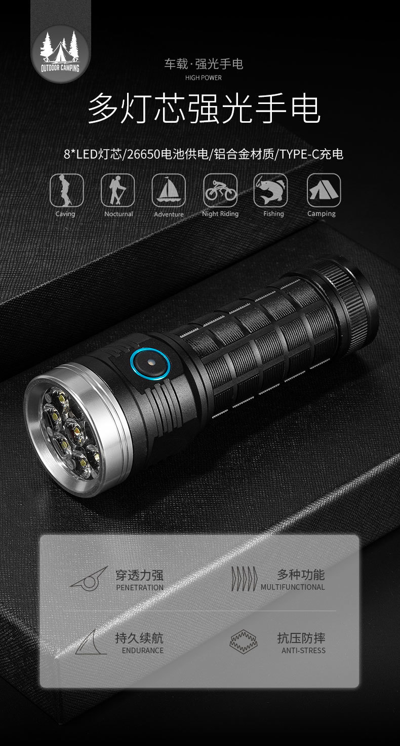 Senter berkemah luar ruangan lintas batas, lampu pancing berkemah multifungsi, senter tahan lama 8 lubang